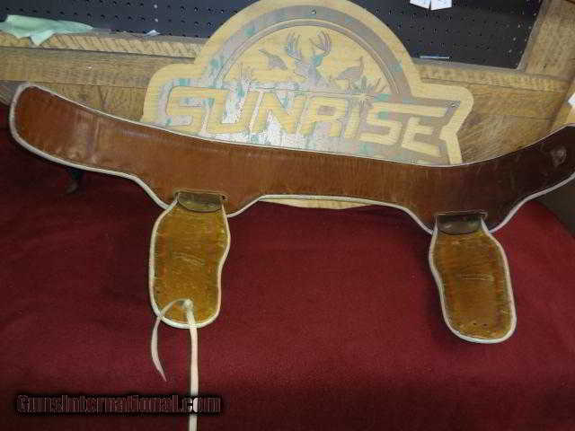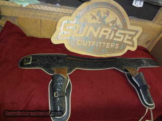 Description: Fully tooled in a floral pattern is this high quality double holster rig made by K. Harrison of Akron, Ohio. The style and work looks like its from the 1930's to the 1950's. Linked belt with 44-45 caliber loops. Holsters are also lined and for a 4 3/4 single action. The holster has a white border and lacing SOLD |