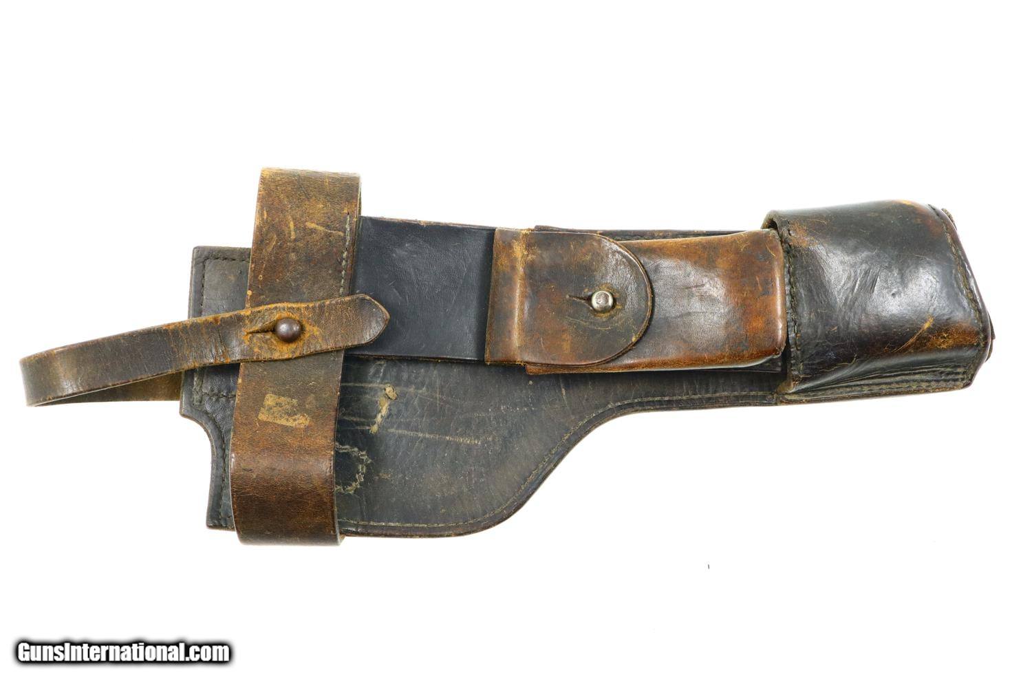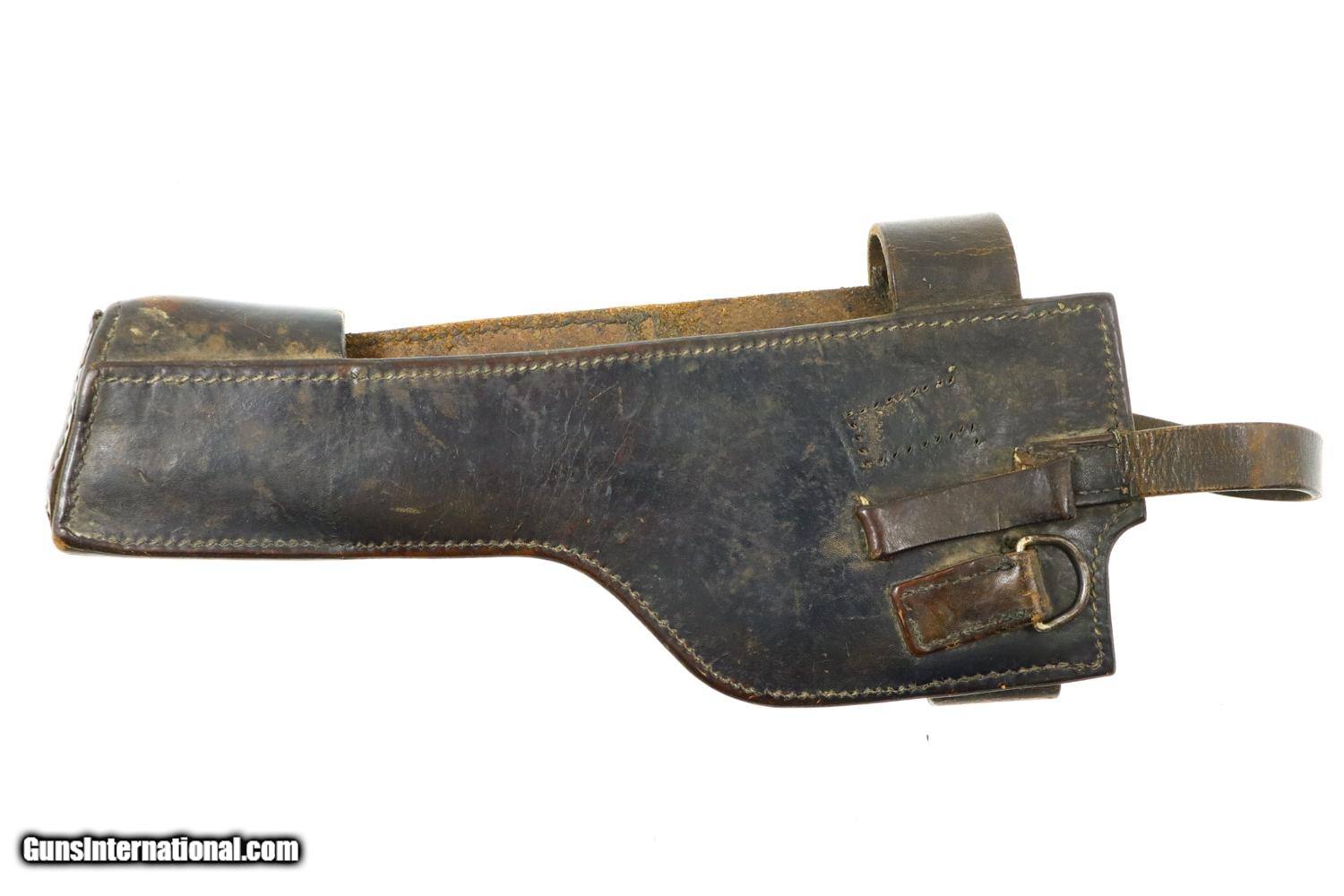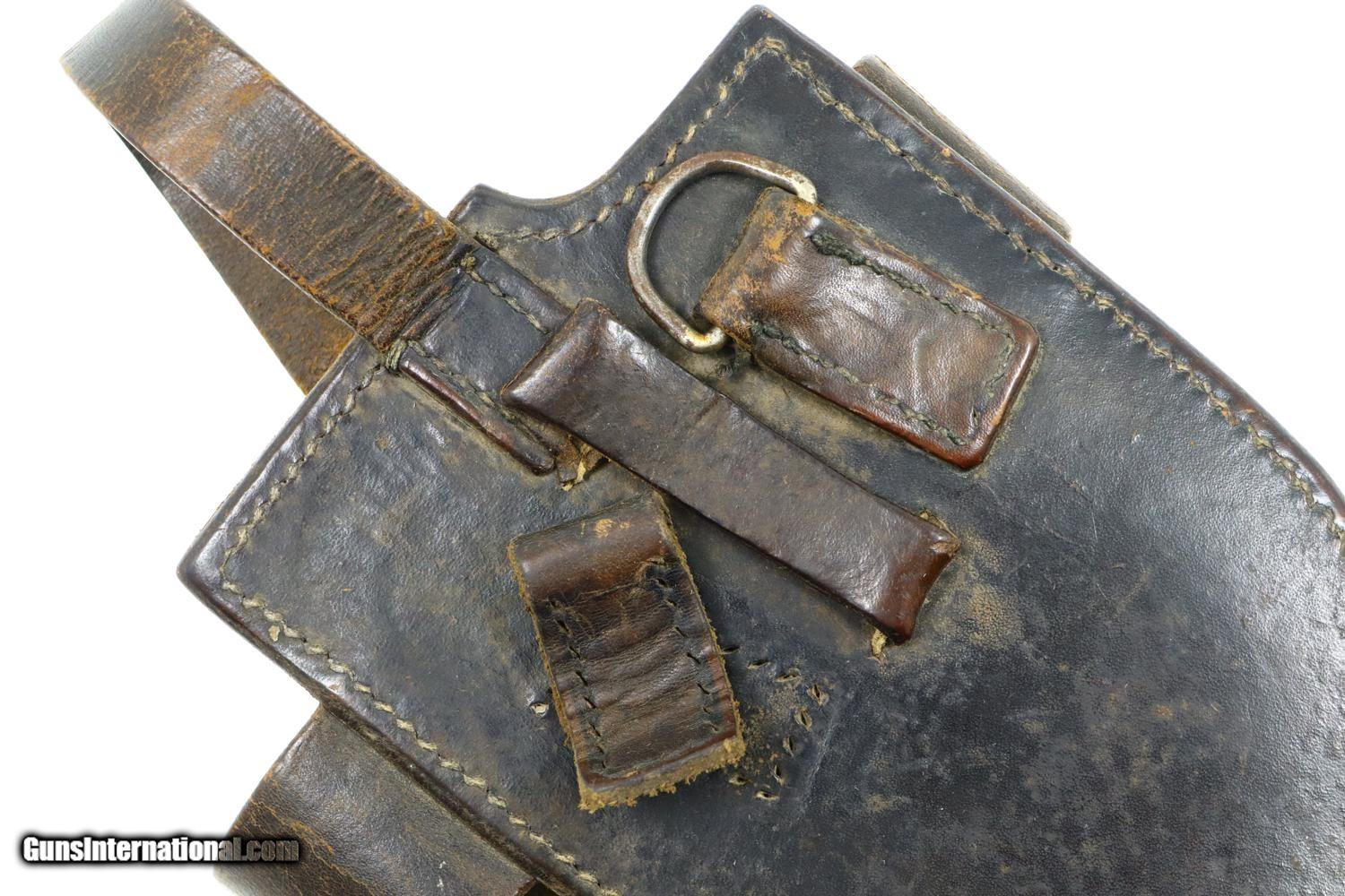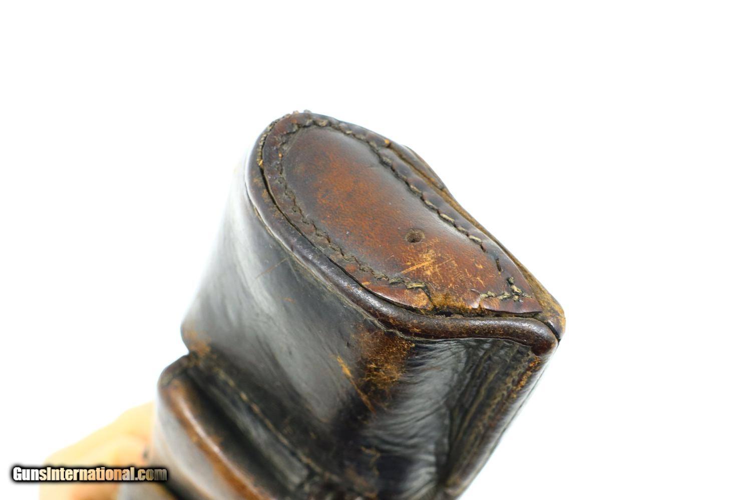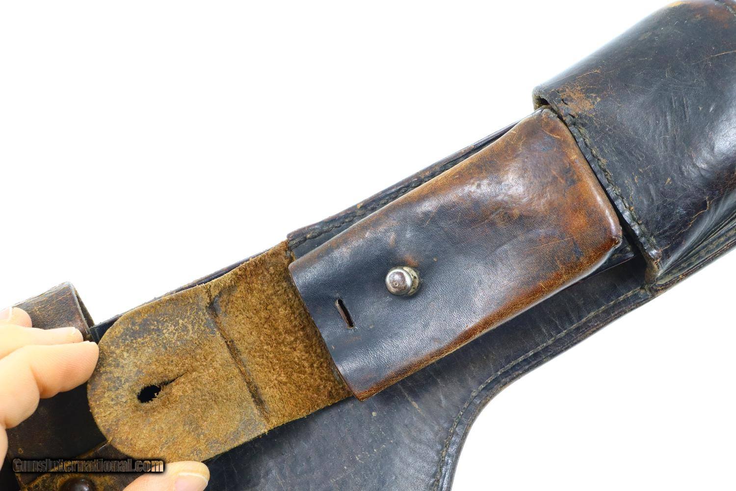 Description: Synopsis: Mauser C96 Broomhandle Leather Carrier, X-265 Description: Leather carrier for a Mauser C96, likely commerical as no manufacturer markings or date. Back and nose cap are same as used for the Red 9 carrier, the pouch on this example much larger and likely used for stripper clips rather than just the spare follower spring. One of the leather D ring supports from the back has separated, still available though no D ring. Condition: Good with oil darkening and crazing as photographed. Missing a D ring, leather support present though separated from back, now stored in pouch. ~~Insured shipping fee of $35; most packages shipped using FedEx 2nd Day.~~ SOLD Manufacturer: Mauser |