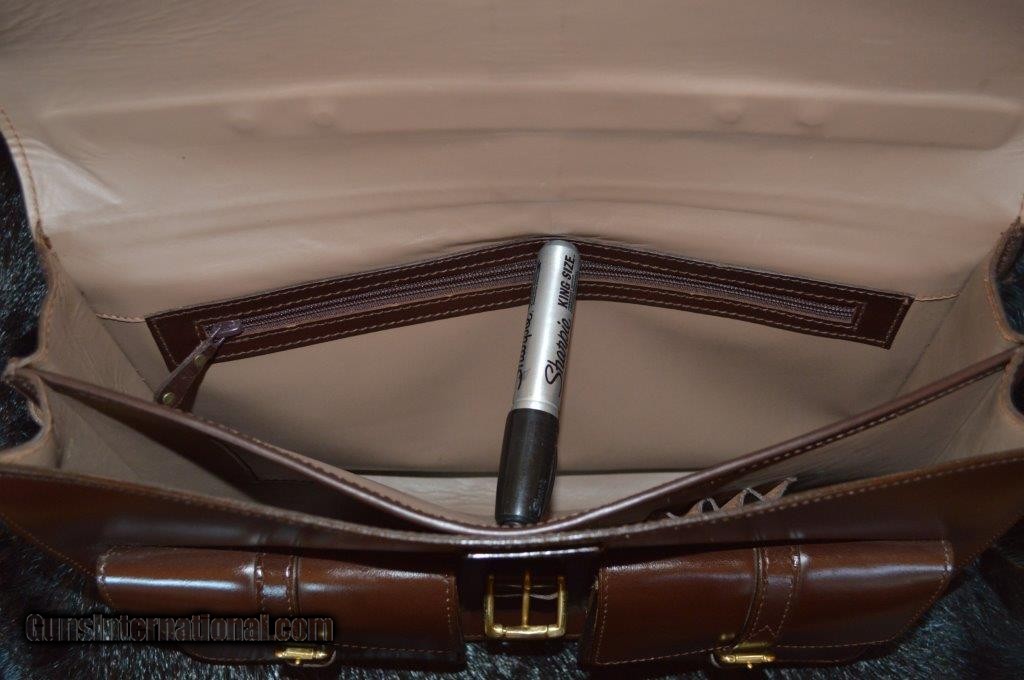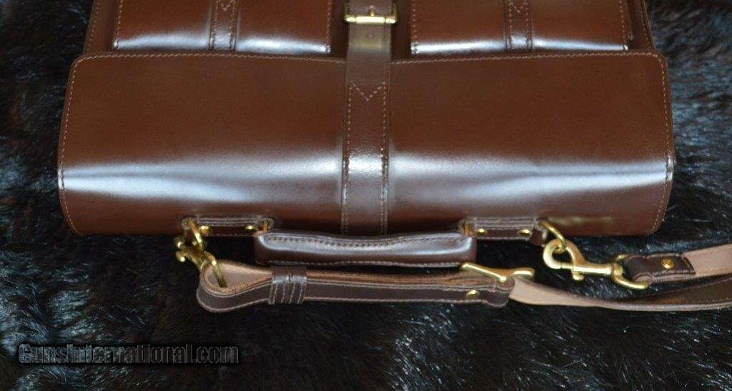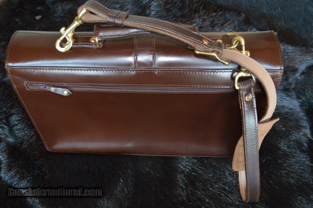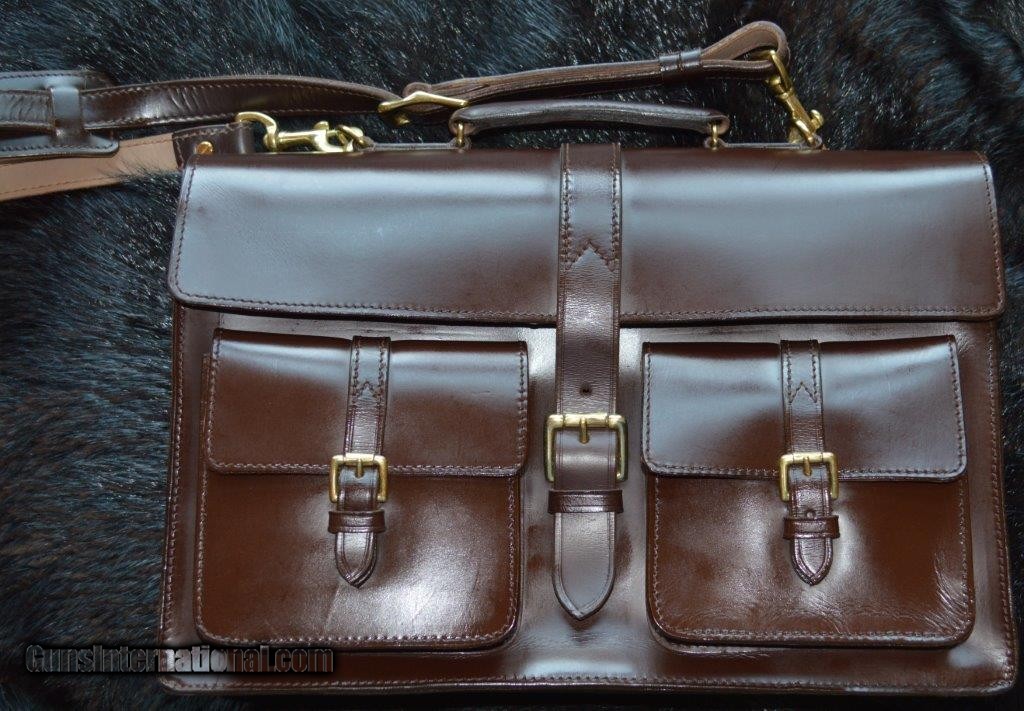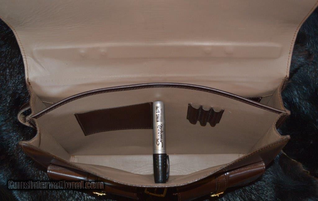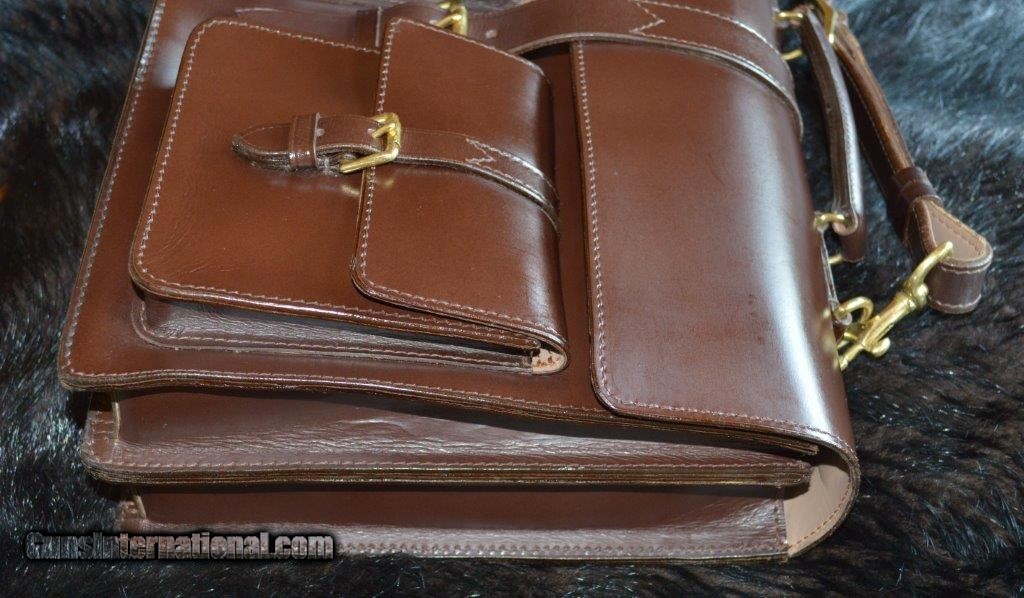Description: SOLD PF *** This is a Premium Gentlemen's Leather Messenger Laptop briefcase in medium brown with an adjustable padded leather shoulder strap. It features solid brass hardware and a triple thick leather handle for ease of carrying. There are zippered papers pouches on the back side and inside. In addition to the laptop storage compartment there is another compartment for books and papers. It also features a business card caddy and receptacles for three pens or pencils. There are two additional pouches on the outside of the bag for added storage that fasten with brass buckles. SOLD |