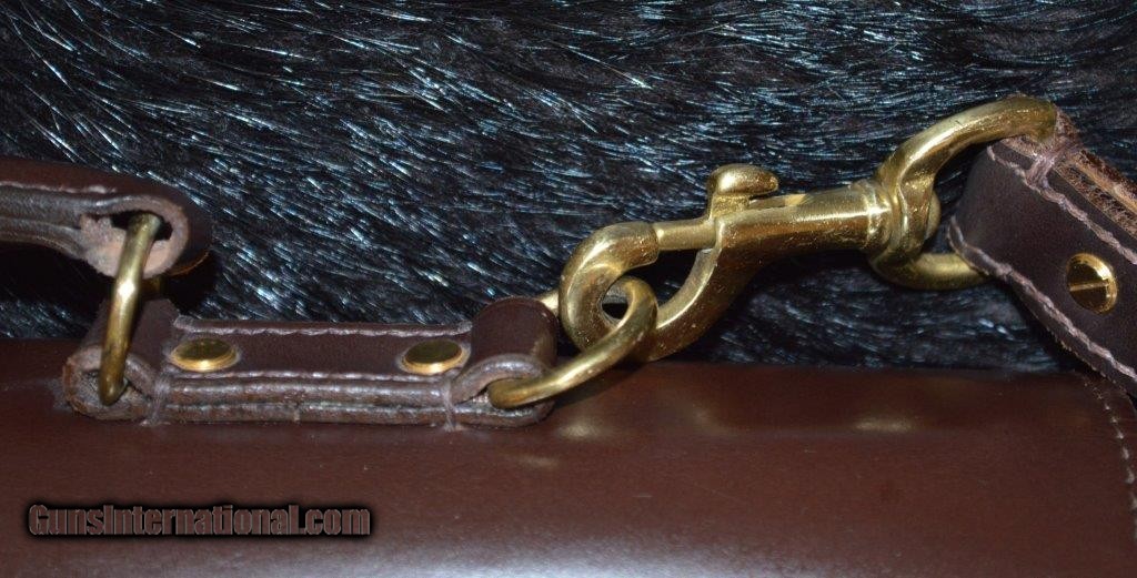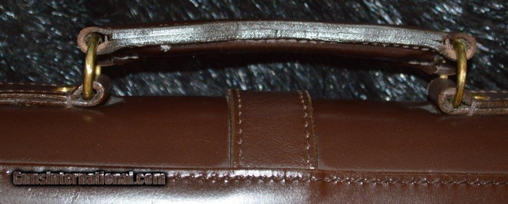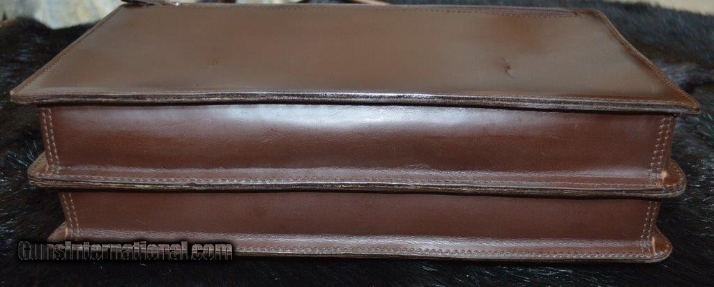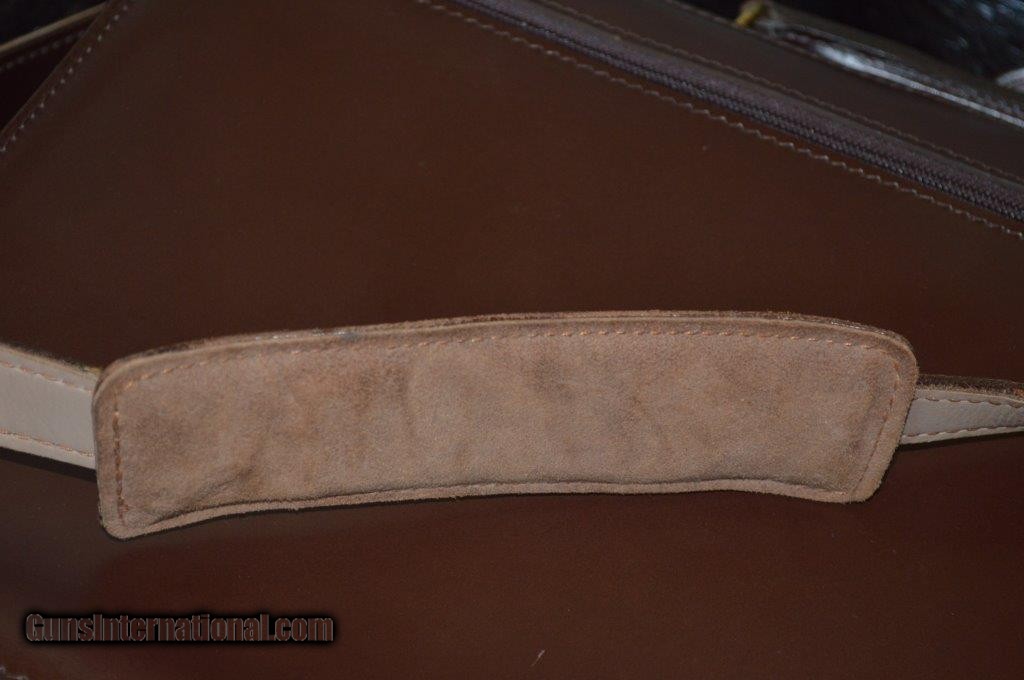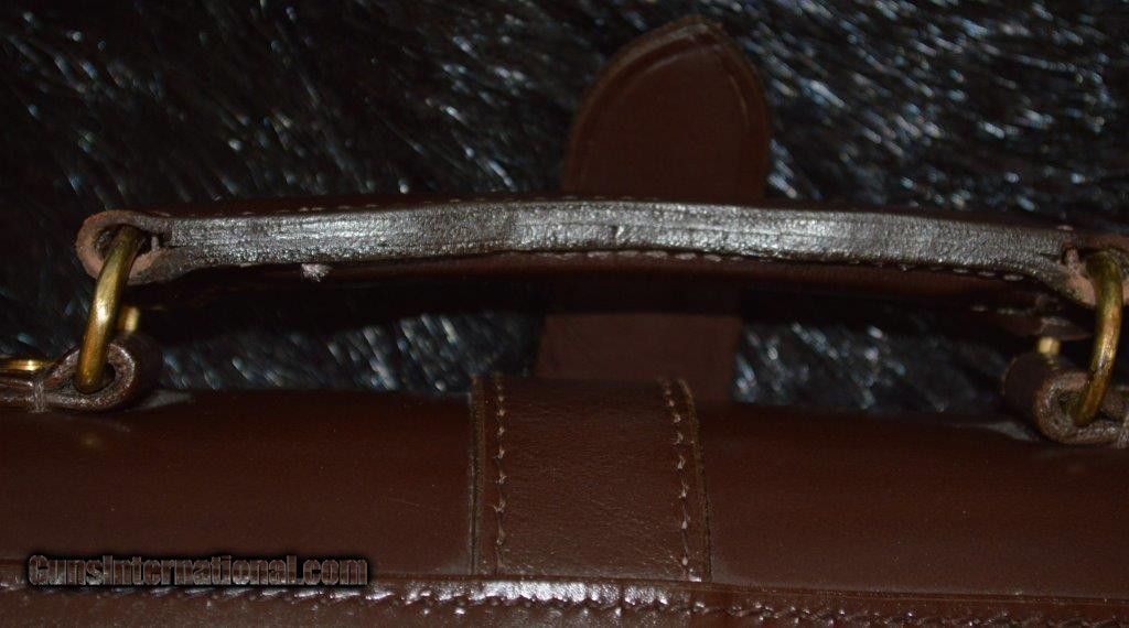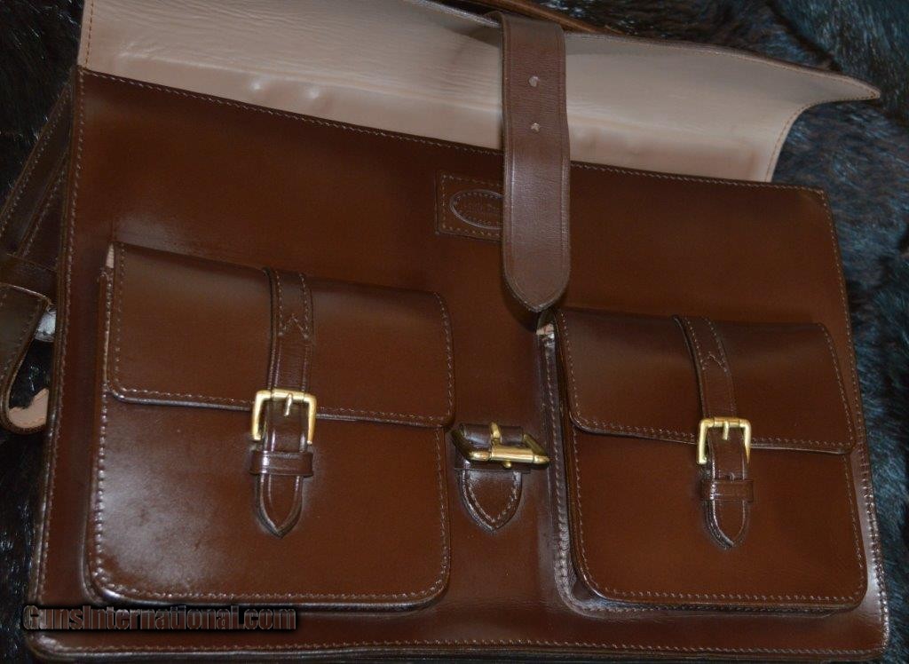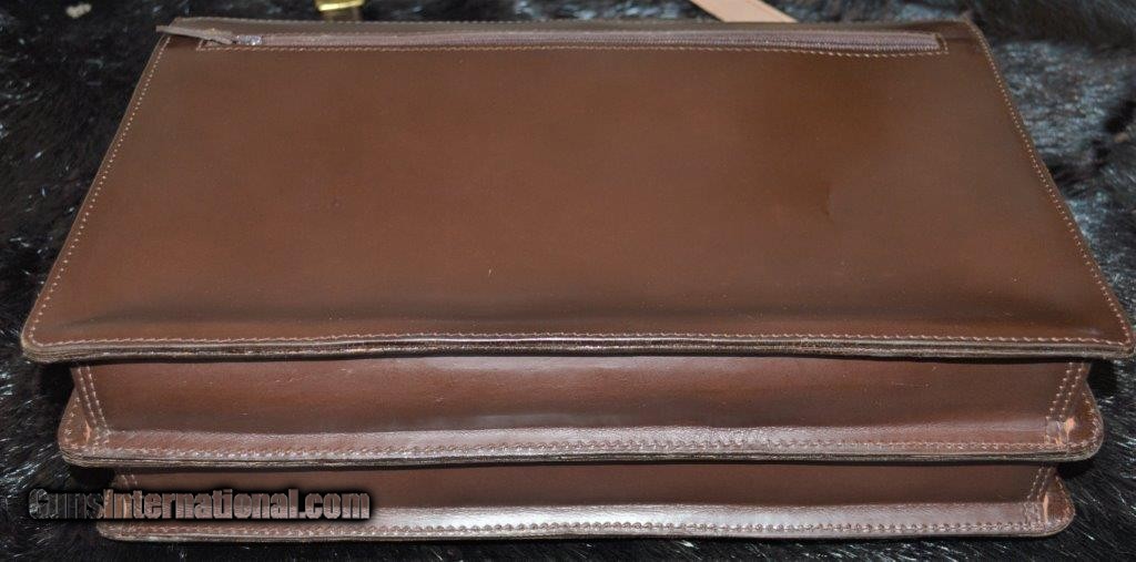 Description: SOLD PF *** This is a Premium Gentlemen's Leather Messenger Laptop briefcase in medium brown with an adjustable padded leather shoulder strap. It features solid brass hardware and a triple thick leather handle for ease of carrying. There are zippered papers pouches on the back side and inside. In addition to the laptop storage compartment there is another compartment for books and papers. It also features a business card caddy and receptacles for three pens or pencils. There are two additional pouches on the outside of the bag for added storage that fasten with brass buckles. SOLD |