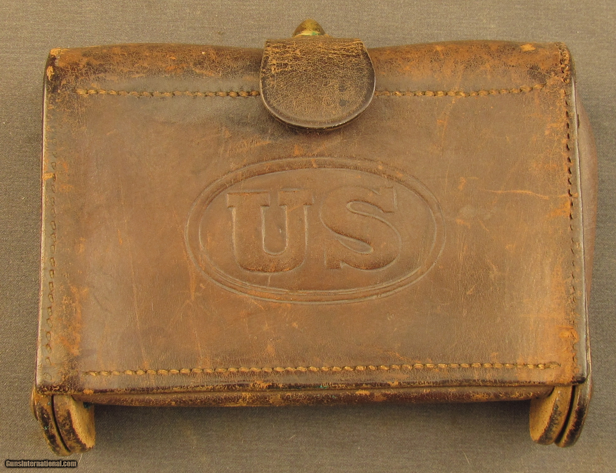 Description: Standard leather pouch with 20 internal cartridge loops. US embossed cover. Stamped on the left side is "2 NY H44"Also marked "Rock Island Arsenal 1903/HEK" Leather shows light scuffing and crazing. There is slight stitch separation on the cover. Condition is good. SOLD Manufacturer: U.S. Model: Ammo |