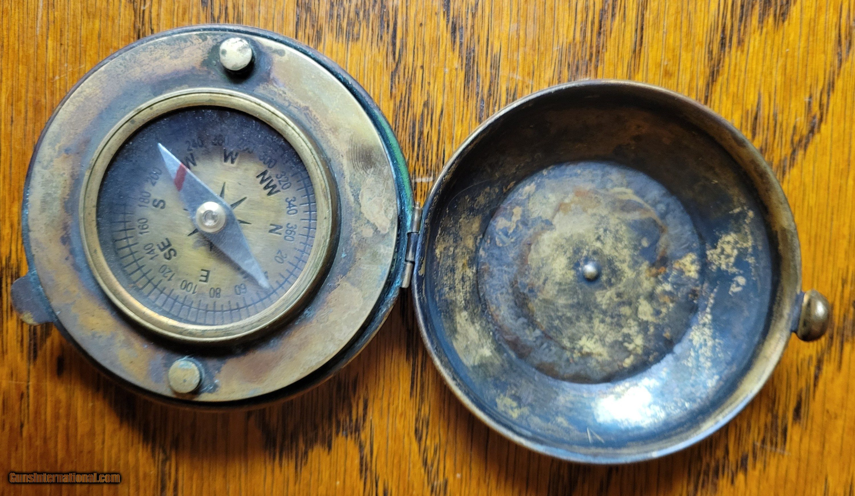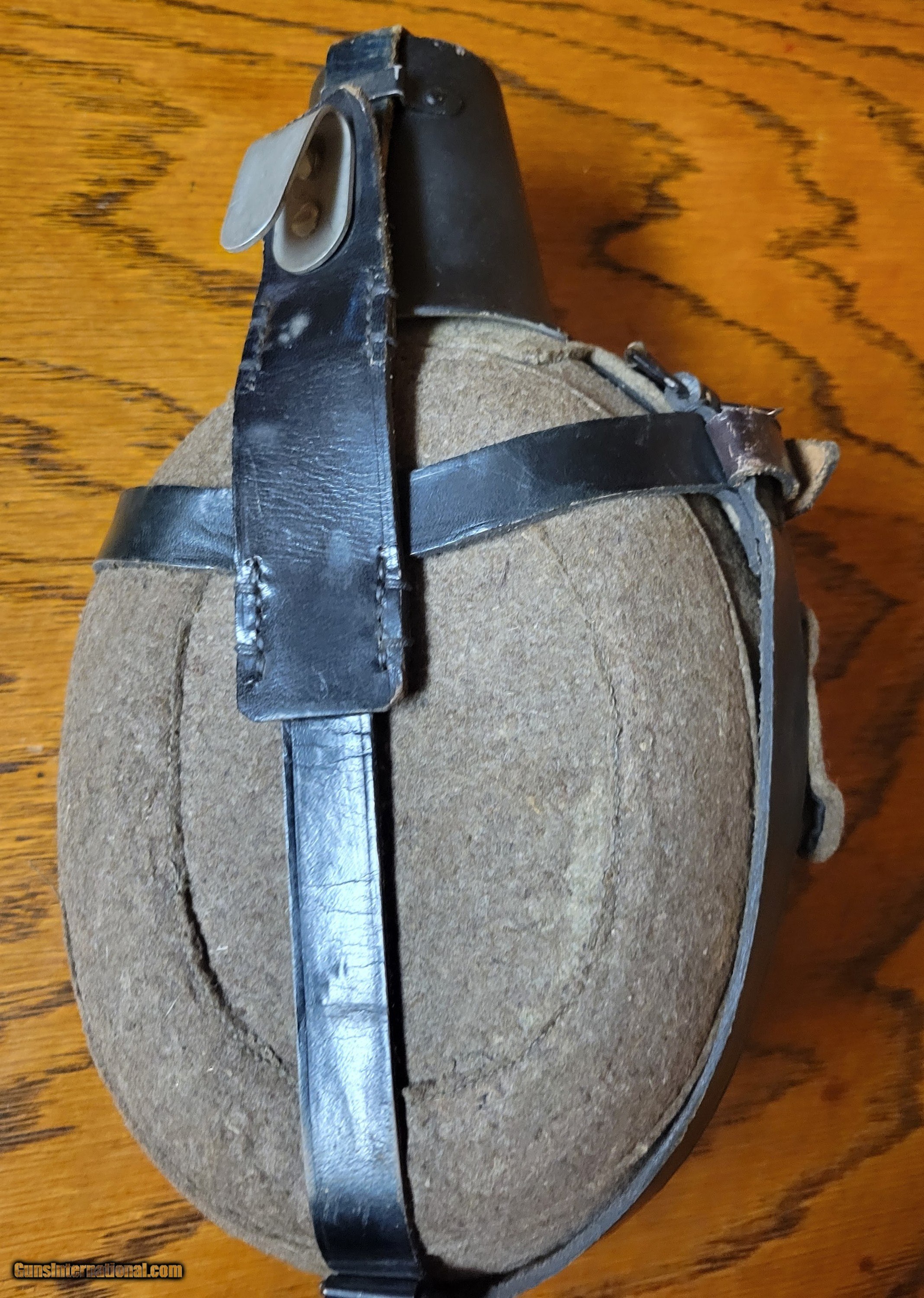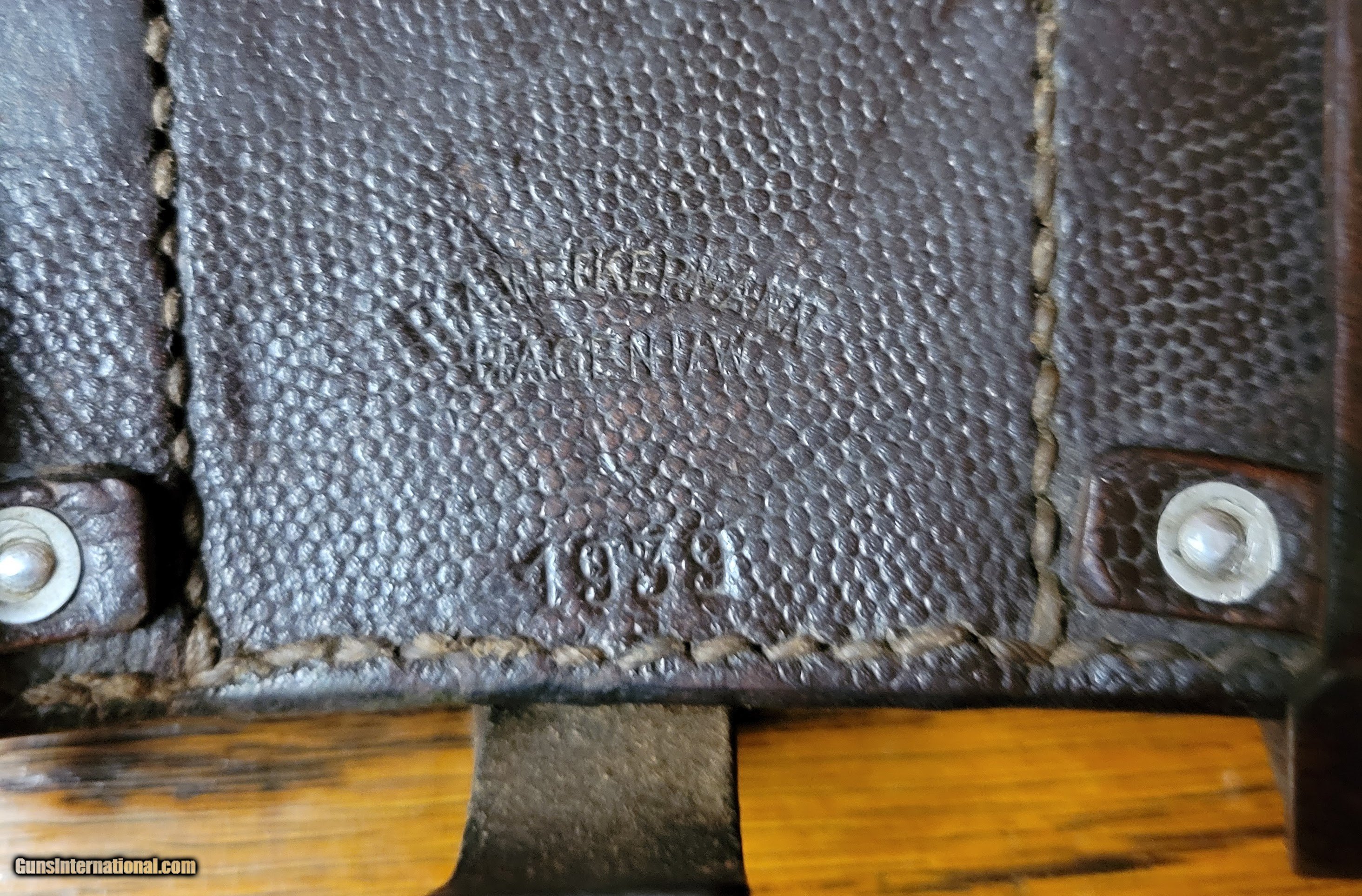 Description: Two Original K98 8mm Ammo Pouches dated 1939 &1940 (2 5 round clips per compartment for a total of 30 rounds). Like New WWII Aluminium German Canteen with cup code HRE/40. K98 Cleaning Chain, Compass In Case. SOLD |