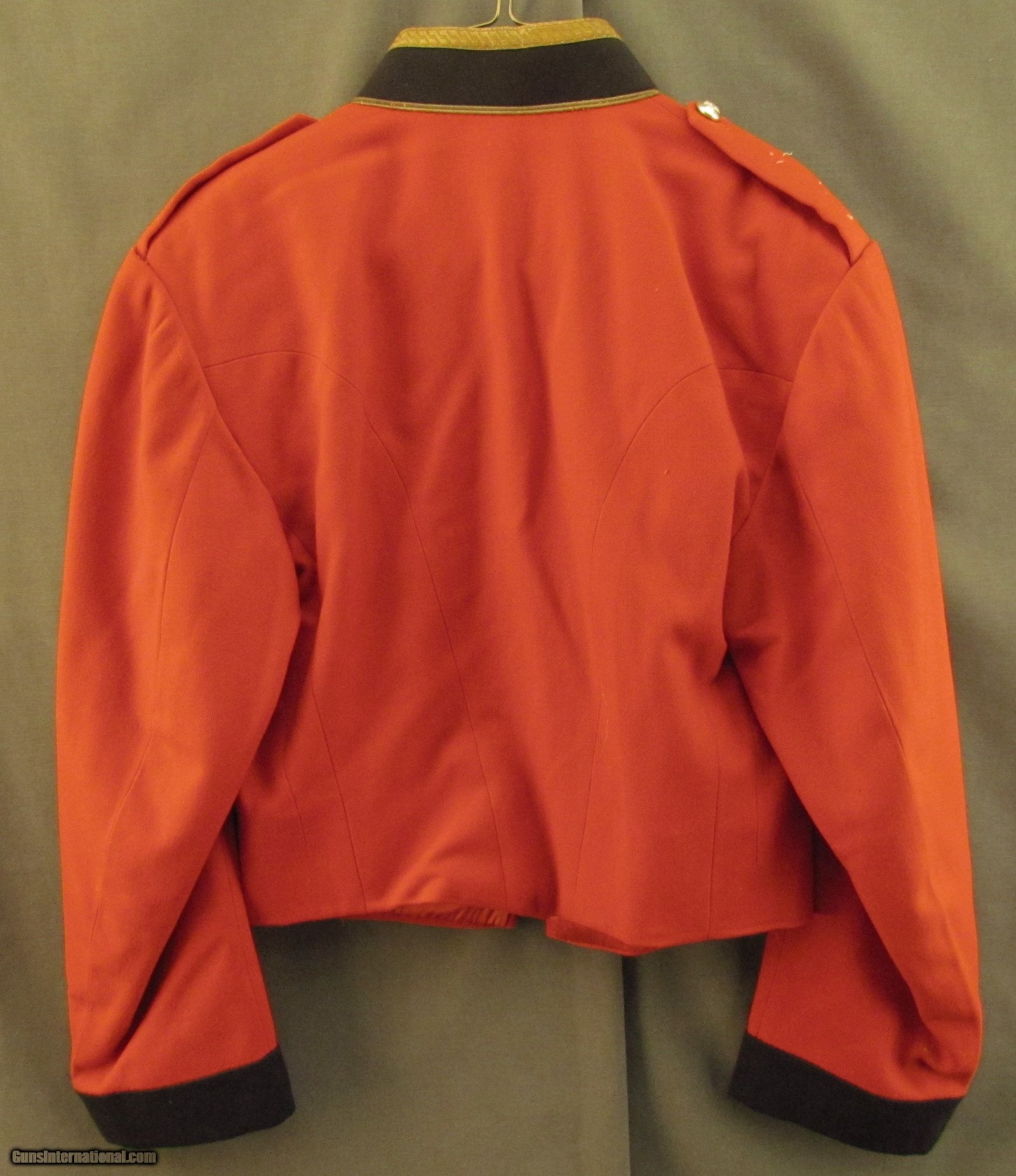 Description: This is the cavalry style mess jacket, fastened only at the stand collar which has tarnished and slightly detached embroidered bullion borders and flaming bomb devices. The fabric is in excellent shape without any fading and there is only some residual stitching left on the epaulettes from rank boards that are no longer present. Likewise there are two stitched loops at the breast for attaching a no longer present medal bar. The red and white silk lining is in excellent condition but the trefoils have been removed from the cuff accents. A Kowloon, Hong Kong tailor's label is present in the inside breast pocket. This is a very nice example of a British mess jacket in fine overall condition. SOLD Manufacturer: British Model: Uniform |