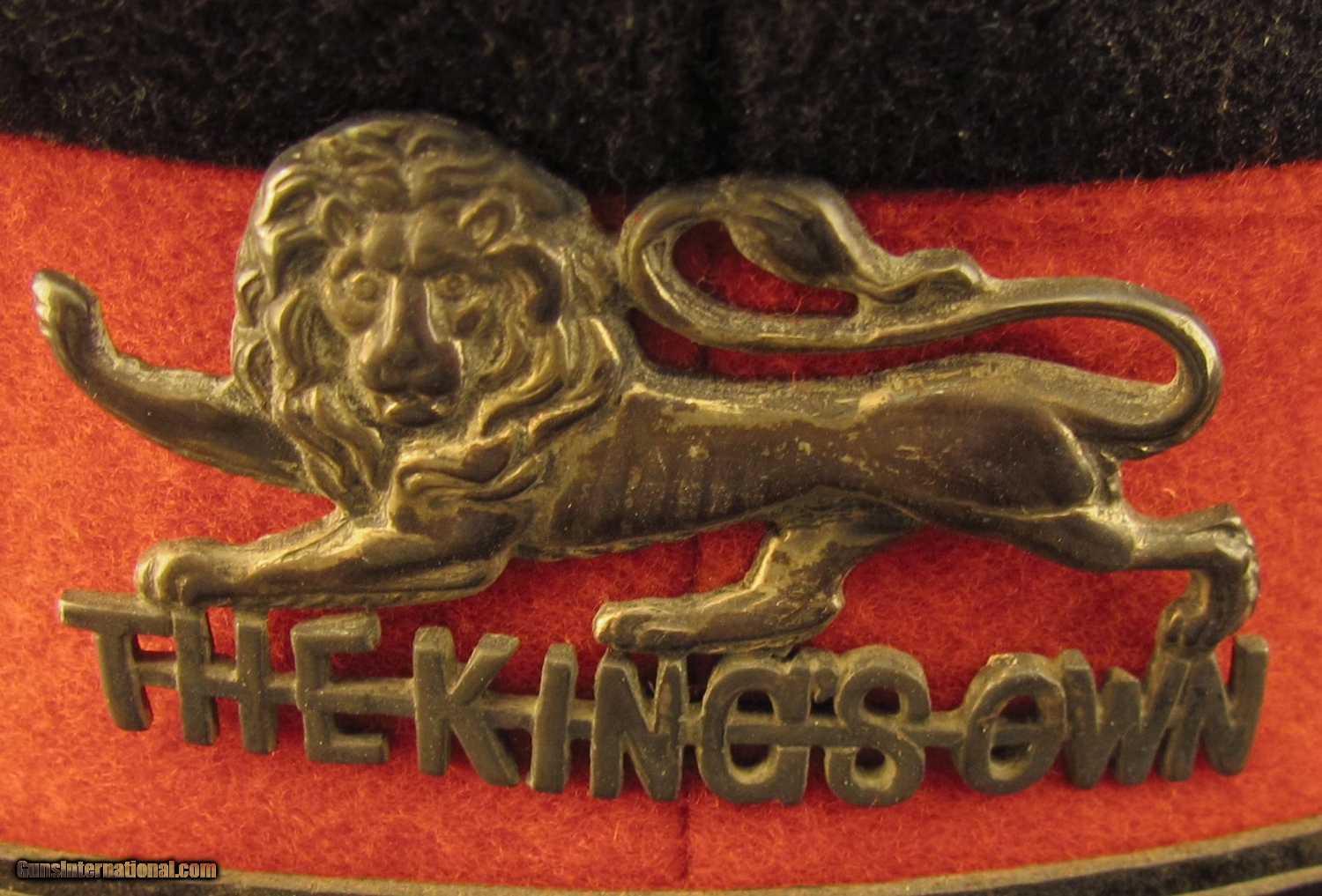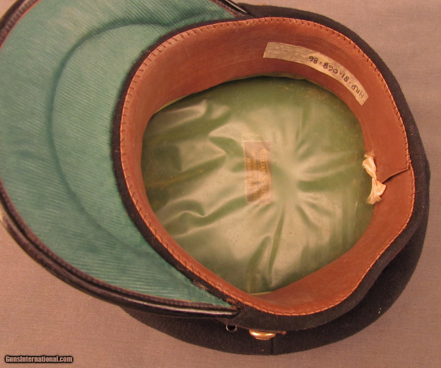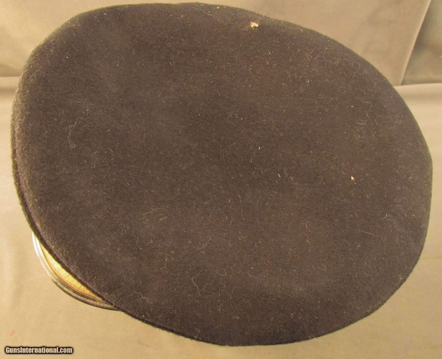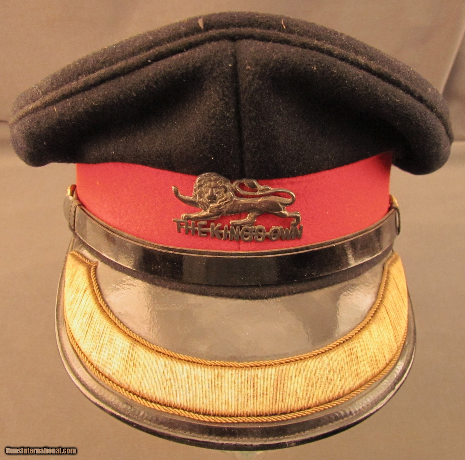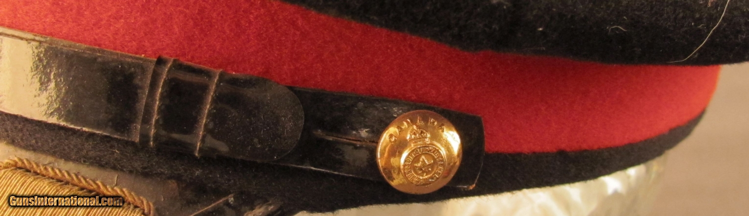 Description: This is a Montreal-made, private purchase cap (size 6 7/8) by William Scully Ltd. that has a navy blue felt crown with matching piping and scarlet band along with a tarnished “(lion, passant guardant)/THE KING'S OWN” badge at the front (The King's Own Royal Lancaster Regiment). The thin black chinstrap is affixed with brass general service Canadian army buttons and the black patent leather peak has a wide embroidered bullion officer's band running along the edge. The peak has retained its shape with almost no damage along the top surface. The interior has a pale green satin lining with full surface sweat shield, and a wide leather comfort band. The cloth has some minor staining from long storage, but the crown stiffeners are still in place and the cap rates very good plus overall. This is a handsome Canadian cap with an out of place regimental badge, and would make a nice display piece. SOLD Manufacturer: Canadian Model: Cap |