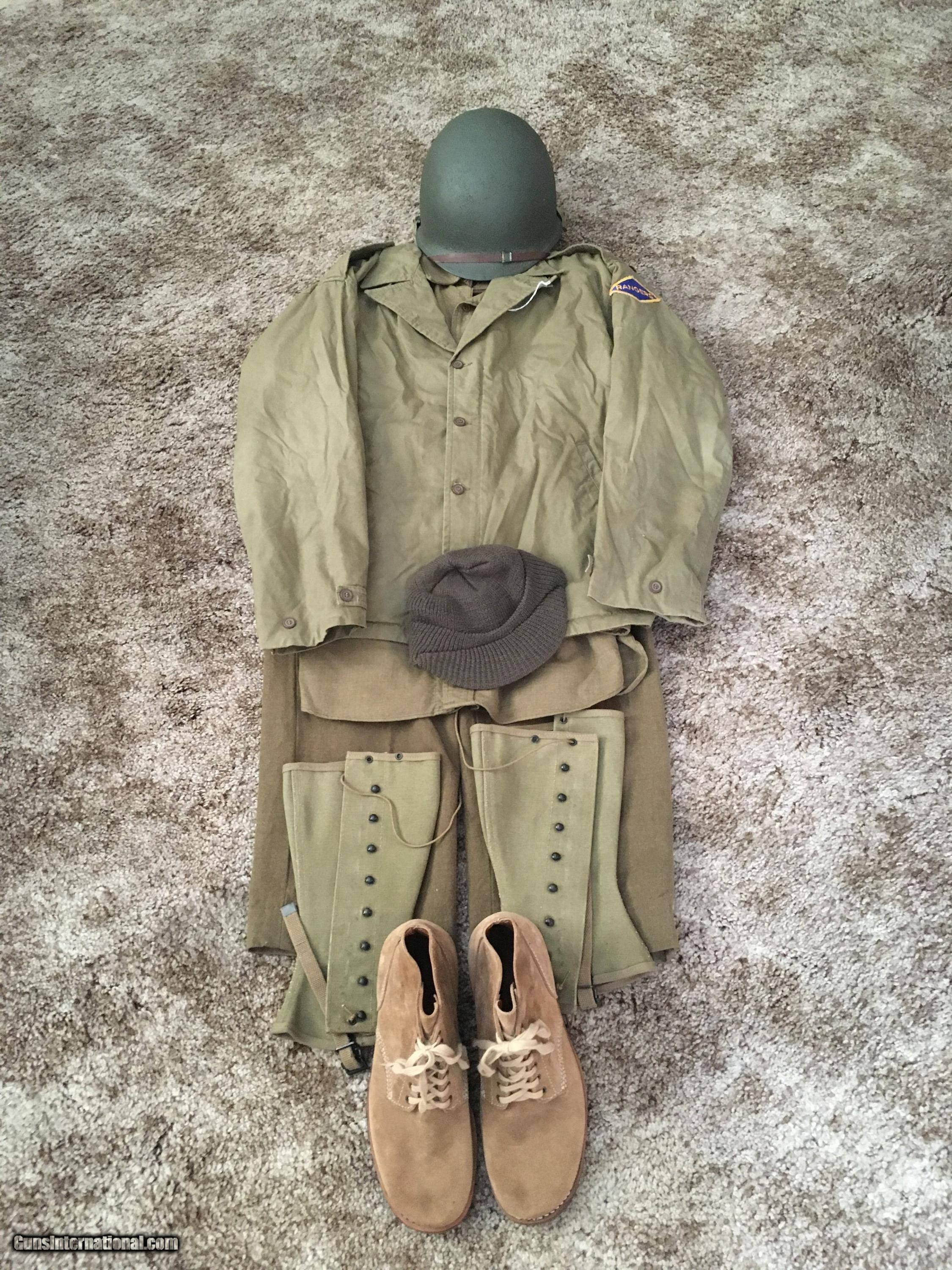 Description: Reenactors D-Day Combat Outfit. 8 pieces. M1 Fixed Bail Helmet. Genuine GI. Completely Restored. M41 Combat Field Jacket ( Reproduction from Movie Wardrobe Company in UK. Used in Saving Private Ryan by an extra ) Size 42. Enlisted Man's Wool Combat Shirt. Genuine GI. Size 16/33. Enlisted Man's Wool Combat Trousers. Genuine GI. Size approx. 36/30. Canvas Leggings. Genuine GI. Size Large. Reproduction Leather Roughout Combat Shoes. Size 10/M. Canvas Enlisted Man's Belt. Genuine GI. Reproduction Knit ( Radar O' Reilly ) Cap. All in very good to excellent condition. Sold as set. I will not seperate. This outfit was worn by me on a number of occassions. More photos available. Free USPS Priority Shipping. Offers Considered. SOLD |