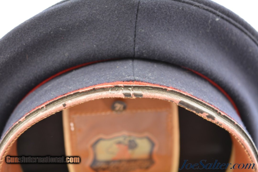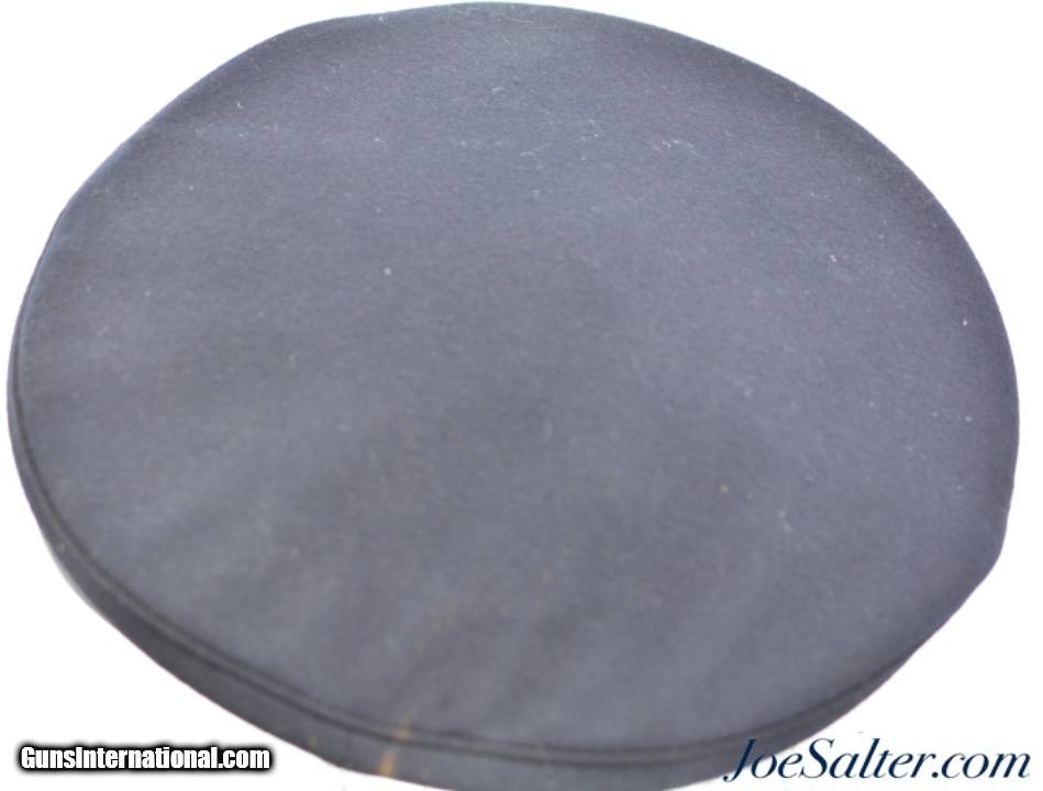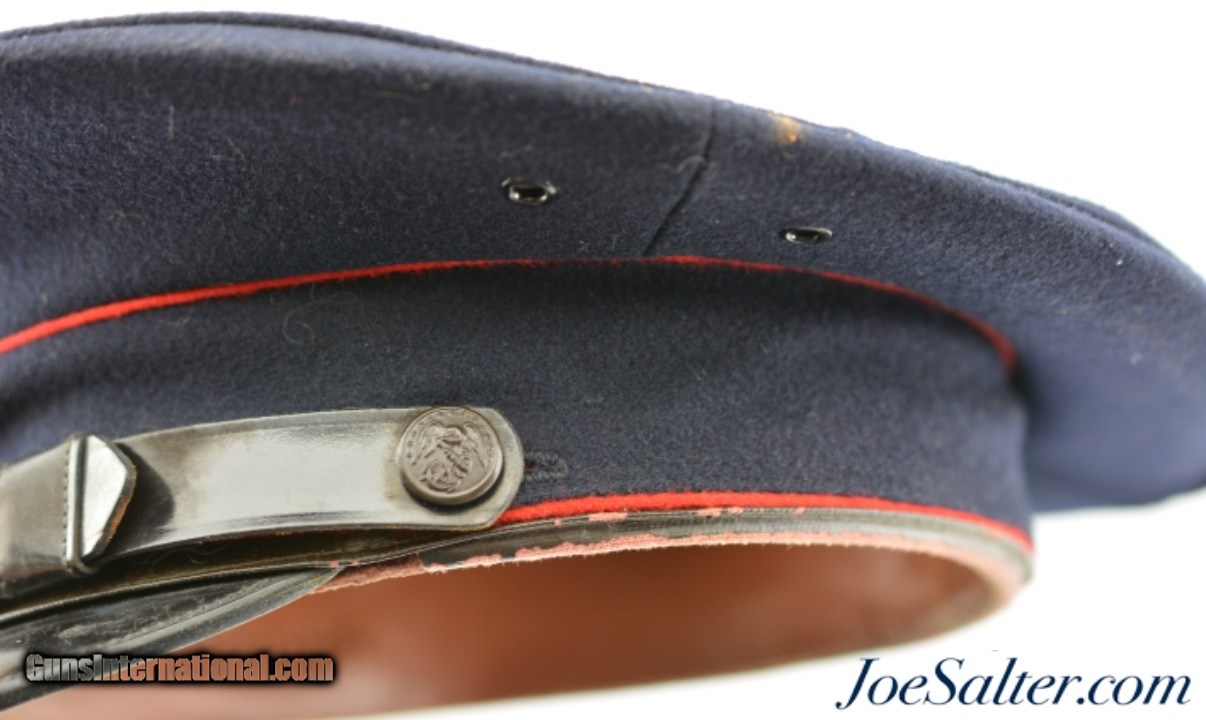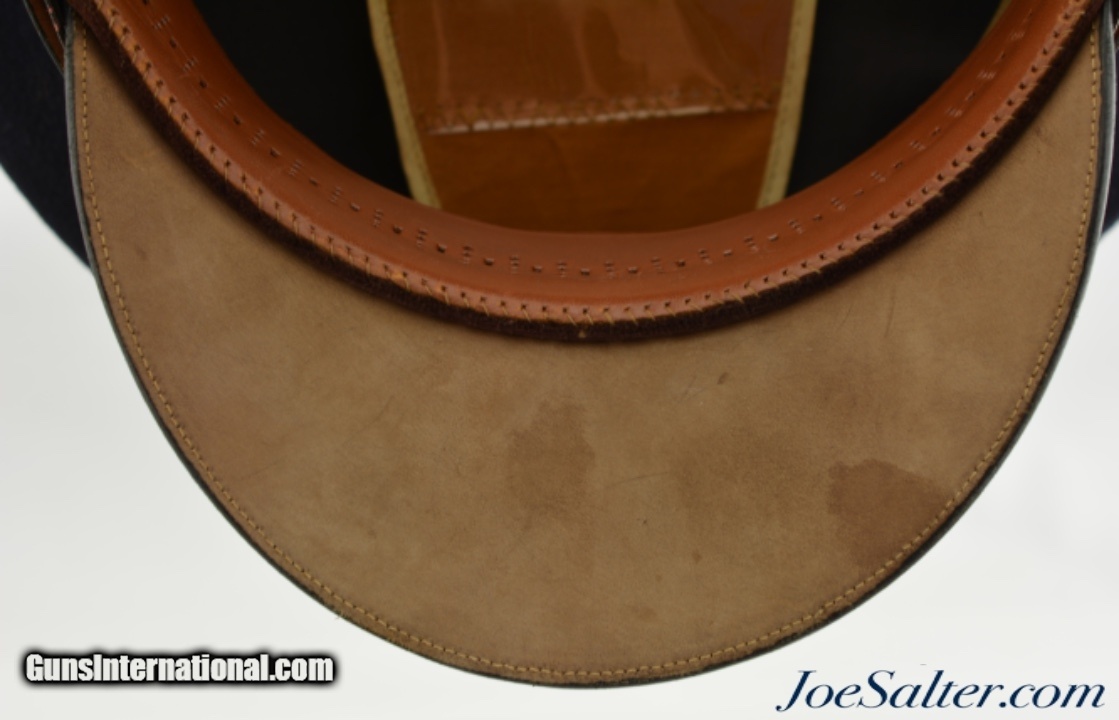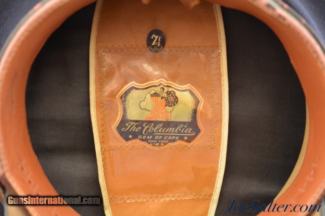 Description: This excellent condition WWII Marine Dress Blue Uniform Visor Cap manufactured by "THE COLUMBIA, Gem of Caps, New York U.S.A. 7 1/4 size" which is nicely labeled in the crown. Constructed of dark blue wool, piped in red, with pliable black leather visor which is securely sewn to the body of the hat. Black leather adjustable chinstrap with two bronze USMC EGA side buttons. With a nice golden enlisted or NCO EGA hat badge. The sweatband is marked "Hygieatan" and is in excellent condition. The only visible wear is on the bottom of the hats opening were it comes in contact when set down. ; Price: $195.00 Contact Seller |
