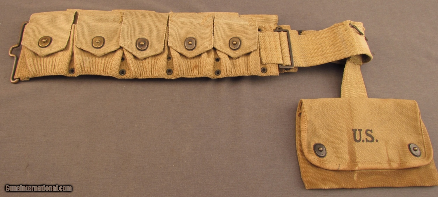 Description: Unit marked Mills 10 pocket cartridge belt with an NCO/Medics bandage pouch. Belt has brass tip covers with a last patent date of May 1915. Back of belt is unit marked “75/111/CROSSED RIFLES/1" Pockets are puckered at the bottom and 2 flaps are marked “FEB 1918/MILLS" Pouch has an extra long hanger and is marked “US" on the cover and “H&P/6-18" on the back. There is some light staining and areas of discoloration. SOLD Manufacturer: Mills Model: Belt |