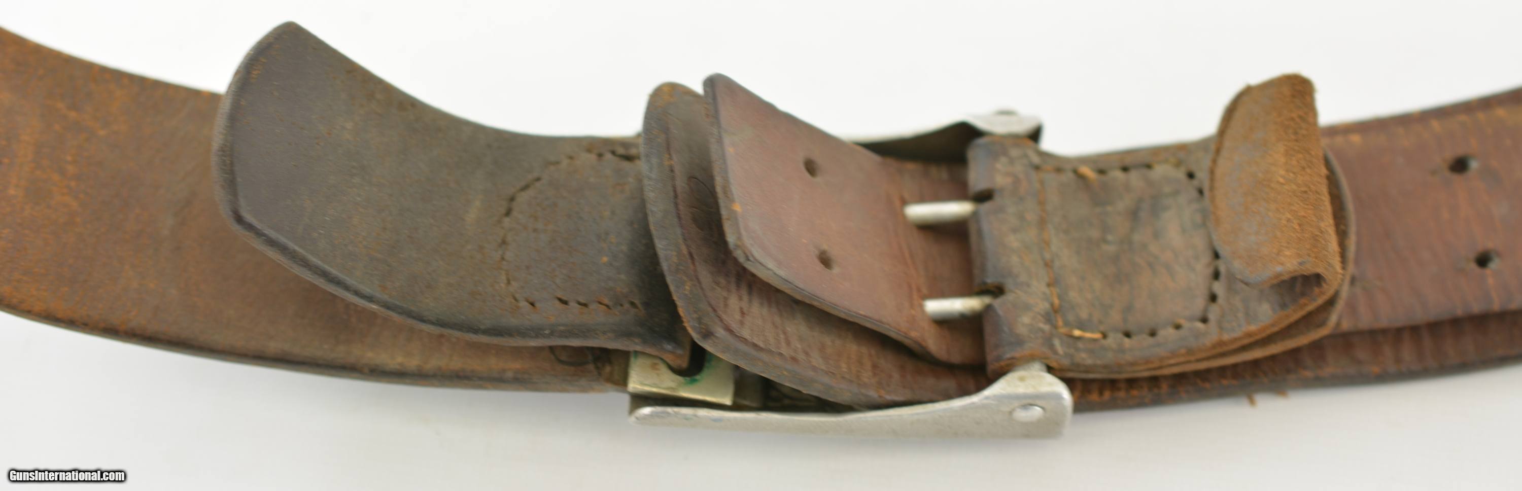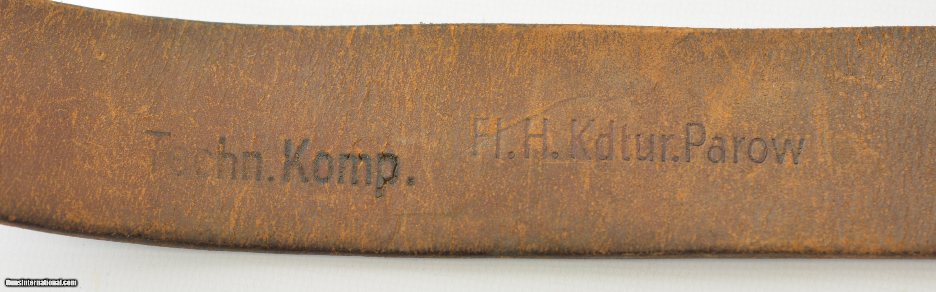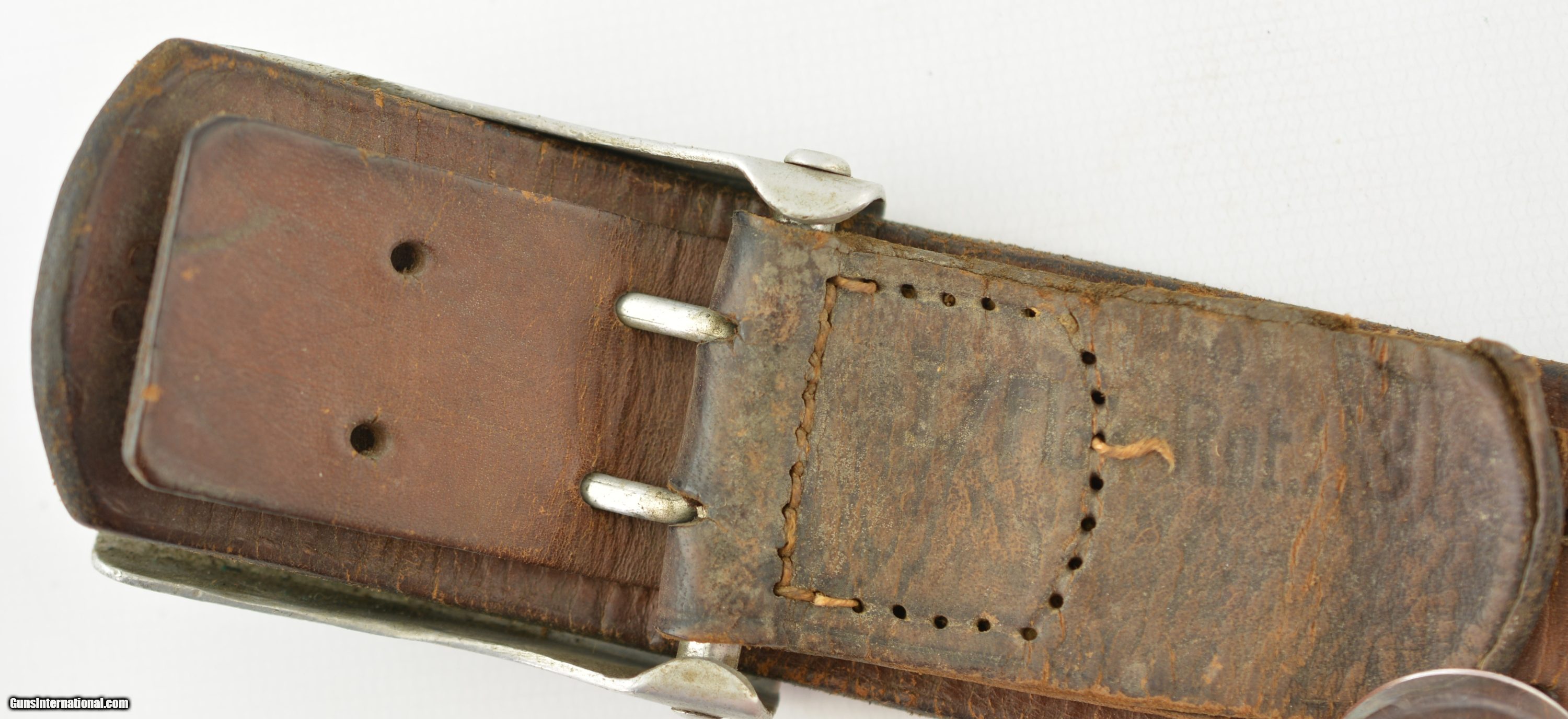 Description: This is the standard 1 3/4" wide dark brown leather waist belt with aluminum Luftwaffe belt buckle (maker stamped “R. S. & S." on the reverse). The tab on the buckle is maker and date stamped 1938, with an additional “L.B.A." stamping on the inner portion of the tab. The outer surface of the tab has a deeply struck unit stamp: “I/Flak. Regt. 3", with some further unit stampings along the interior surface of the belt towards the tag end: “Techn. Komp.", and “Fl. H. Kdtur. Parow". The leather is in good-very good condition with some crazing and mild flaking on the flex points, most noticeably on the tabs. Additionally, there is a hole through the leather about midway down its length. This is a neat piece of World War II militaria and would make a nice addition to a collection. SOLD Manufacturer: German Model: Belt |