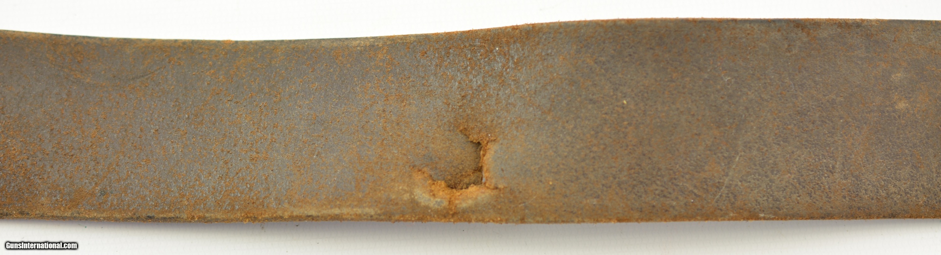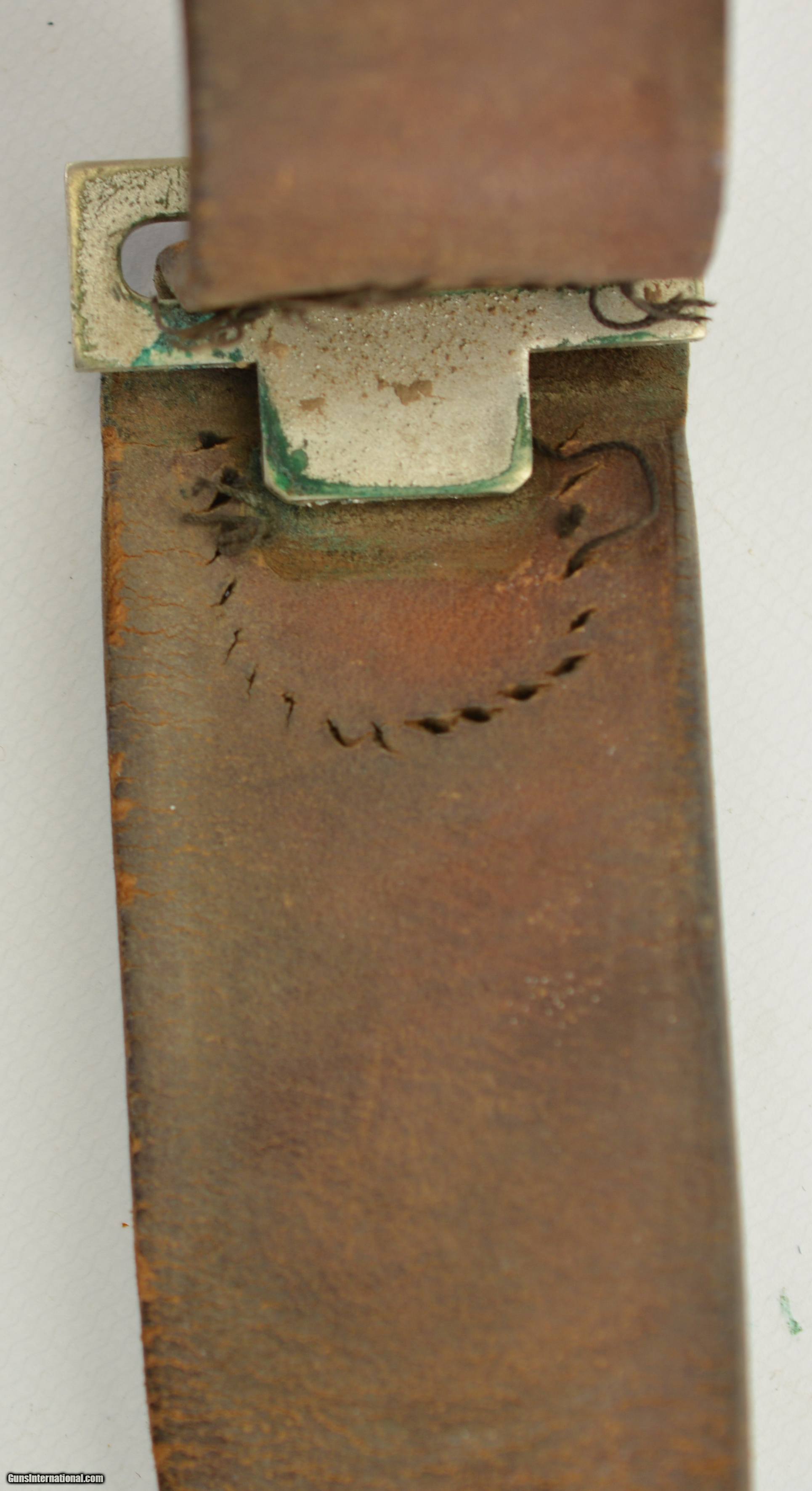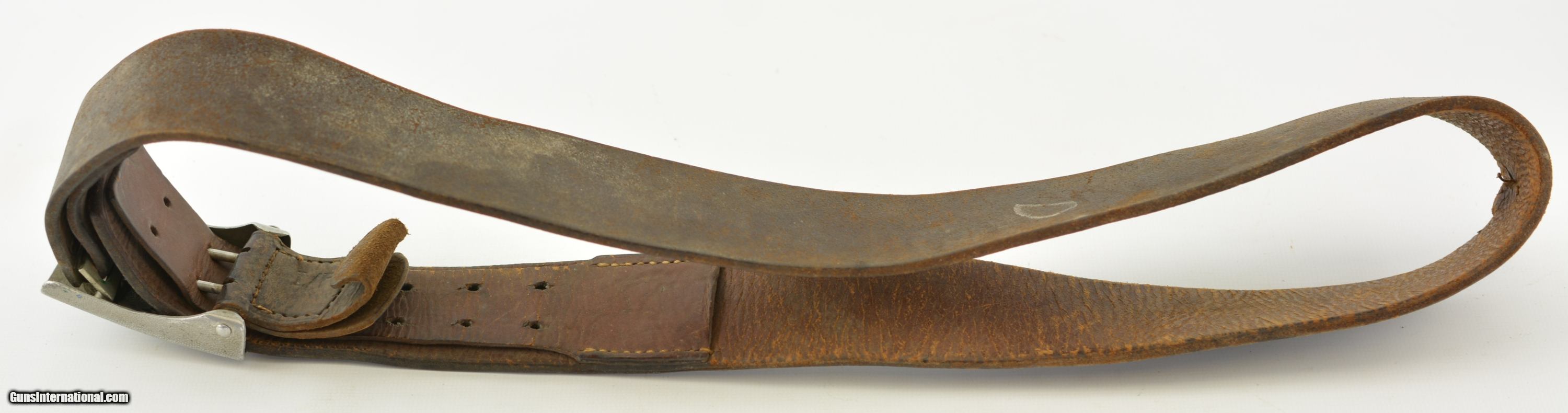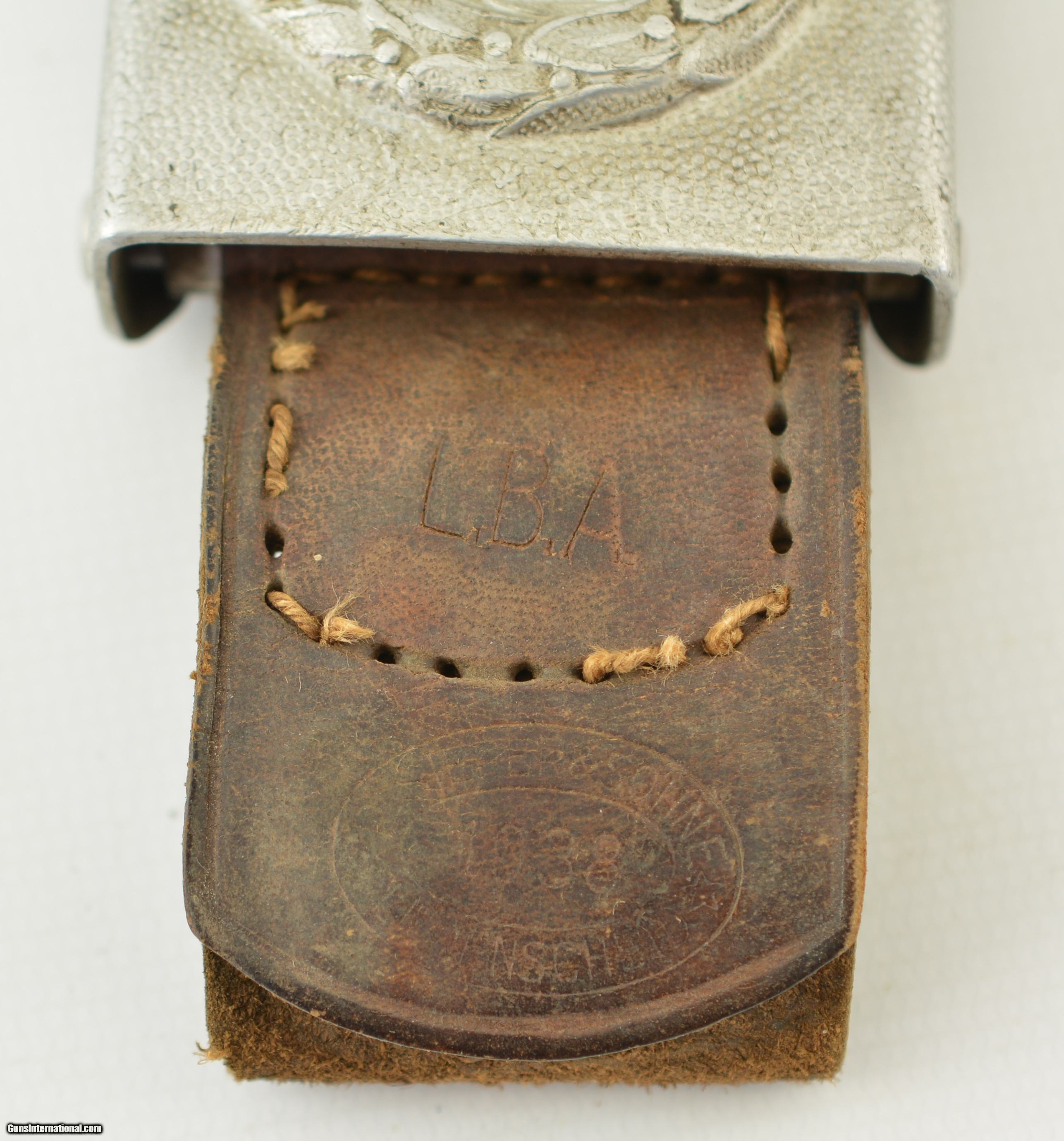 Description: This is the standard 1 3/4" wide dark brown leather waist belt with aluminum Luftwaffe belt buckle (maker stamped “R. S. & S." on the reverse). The tab on the buckle is maker and date stamped 1938, with an additional “L.B.A." stamping on the inner portion of the tab. The outer surface of the tab has a deeply struck unit stamp: “I/Flak. Regt. 3", with some further unit stampings along the interior surface of the belt towards the tag end: “Techn. Komp.", and “Fl. H. Kdtur. Parow". The leather is in good-very good condition with some crazing and mild flaking on the flex points, most noticeably on the tabs. Additionally, there is a hole through the leather about midway down its length. This is a neat piece of World War II militaria and would make a nice addition to a collection. SOLD Manufacturer: German Model: Belt |
