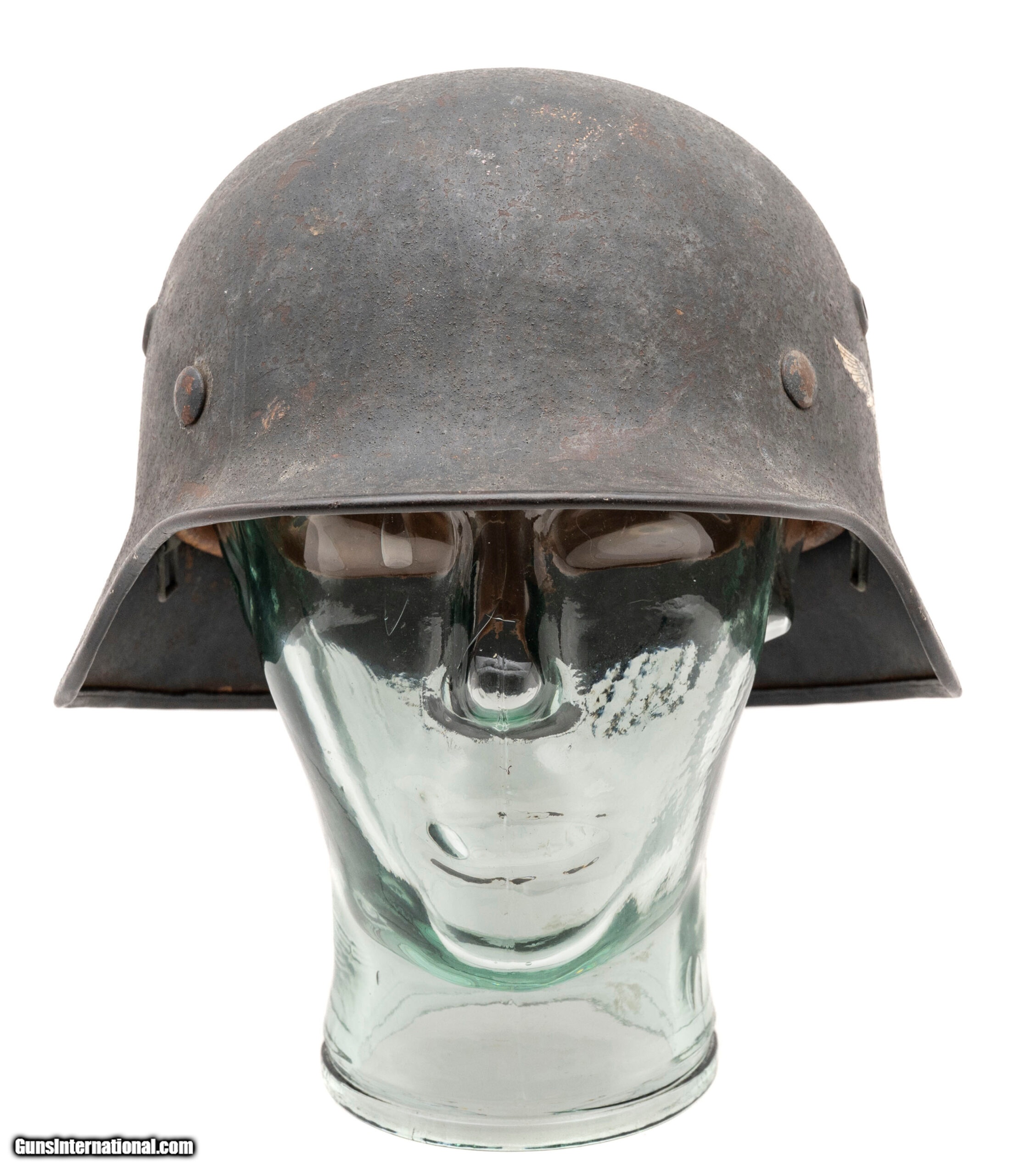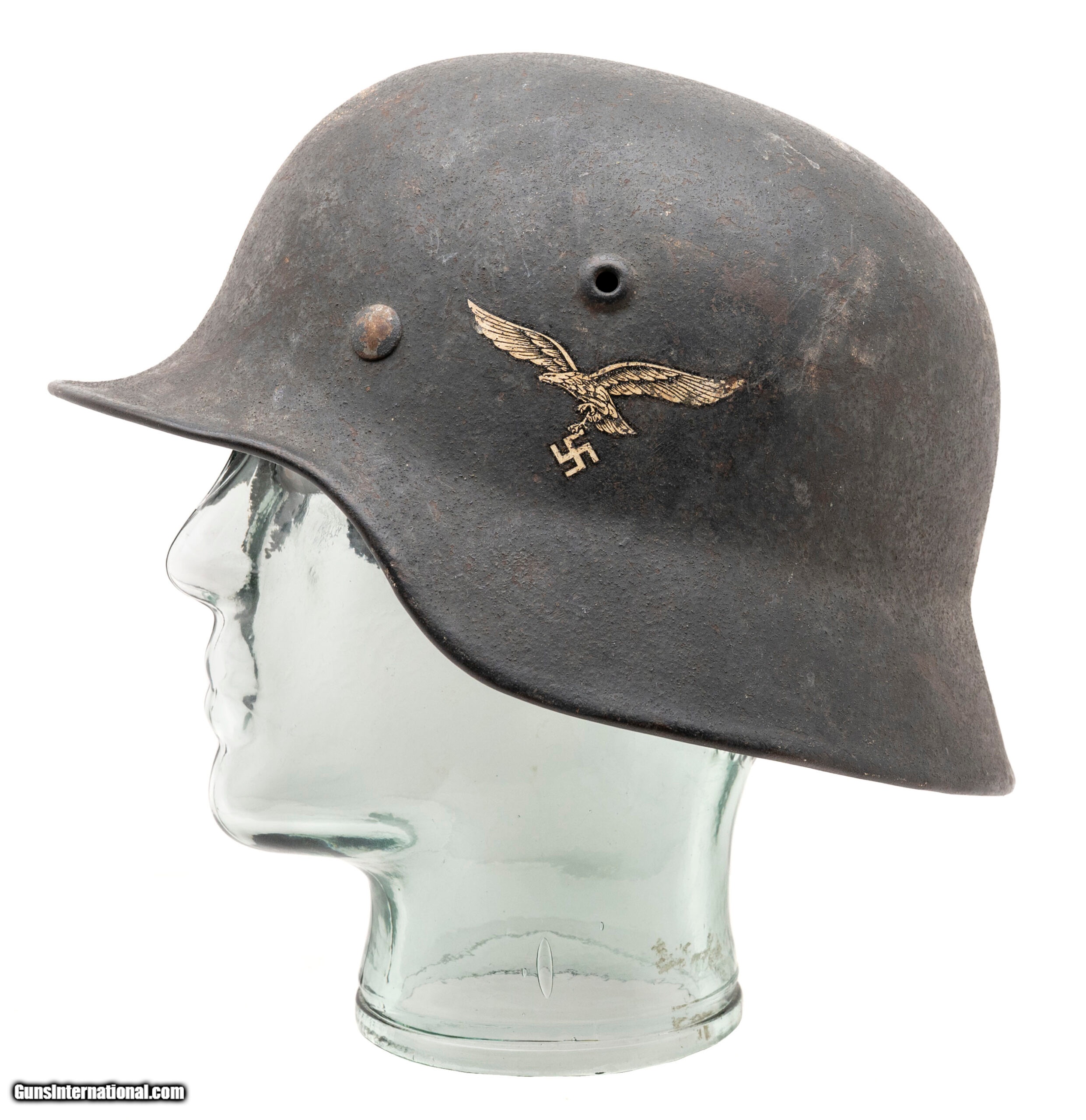 Description: "German World War II M-40 rolled-edge steel helmet in size 62cm (small) with a luftwaffe decal on the left side. The original leather liner is present but the leather thong that holds the eight sections together in the center is missing as are the chinstraps. SOLD |