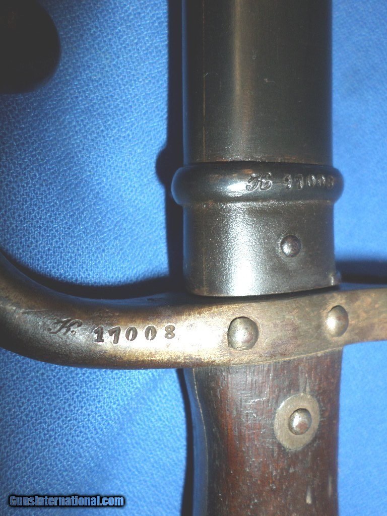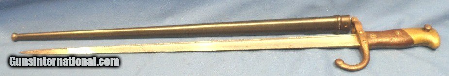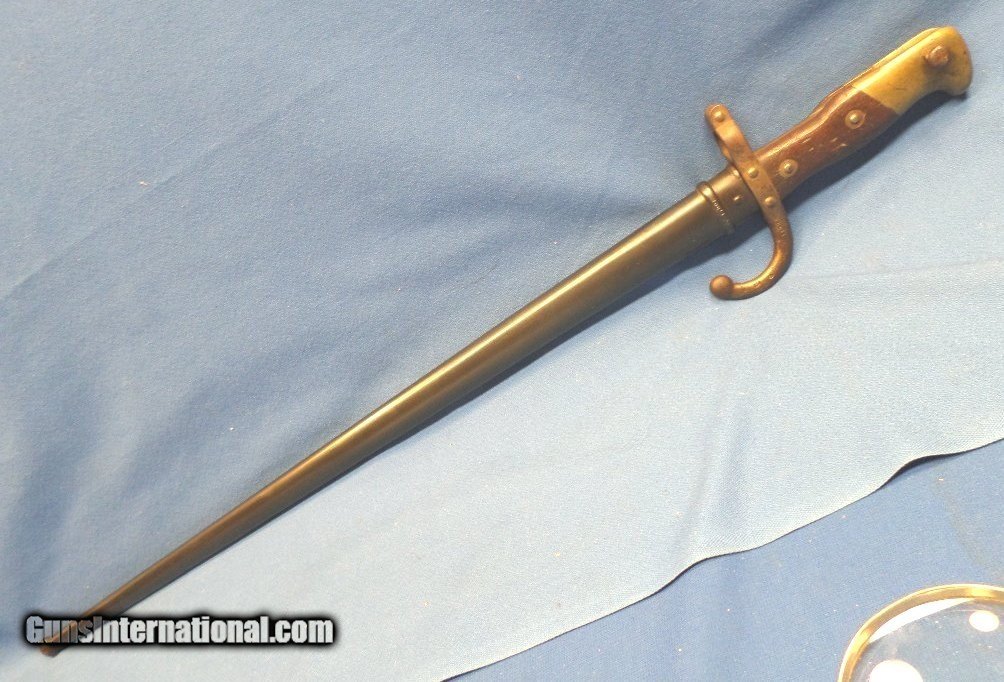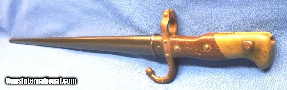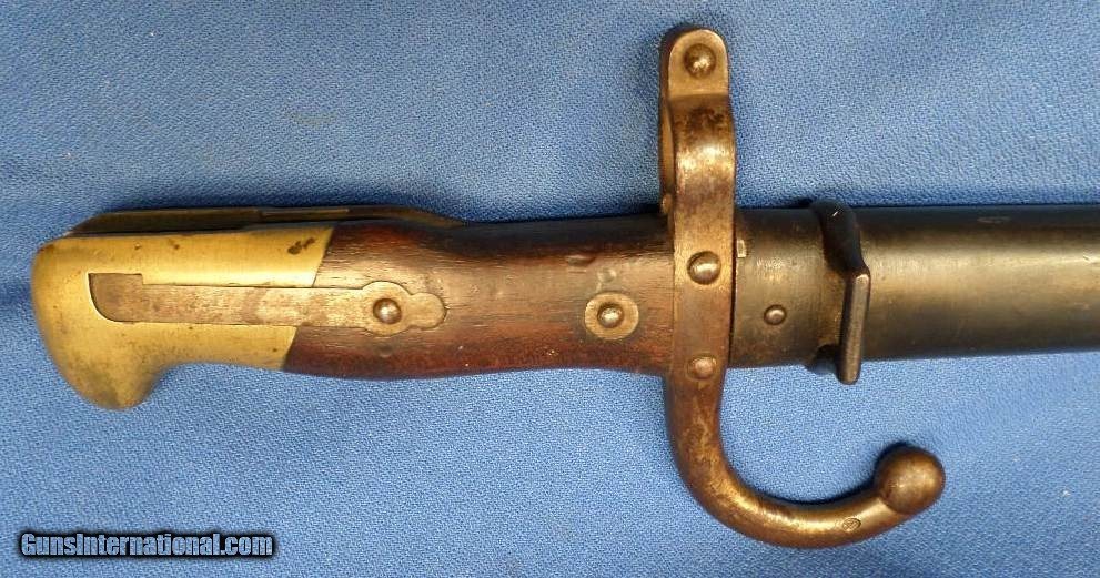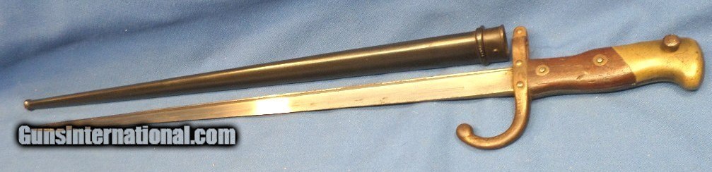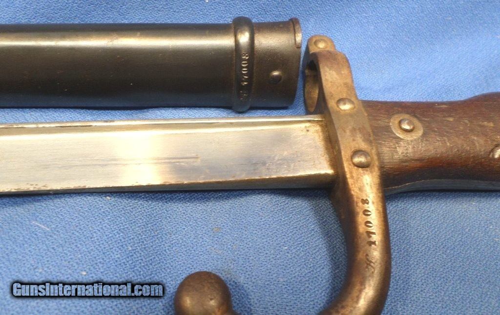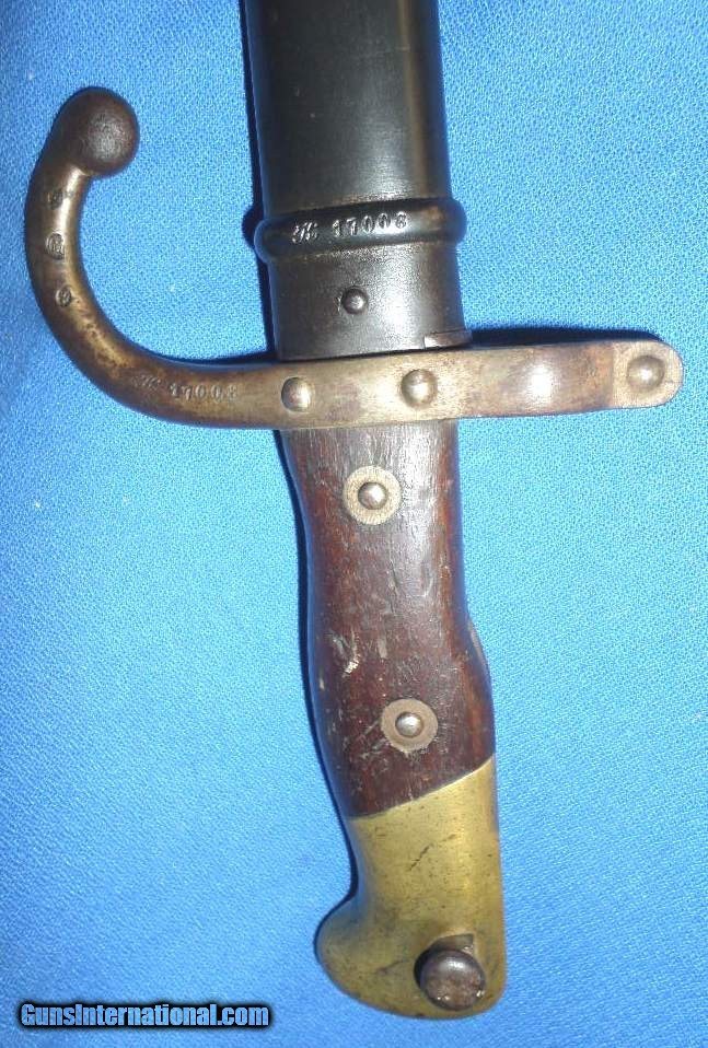 Description: BUY NOW IF YOU WANT IT ! DATED 1876 FRENCH GRAS MILITARY BAYONET WITH ORIGINAL METAL SCABBARD SER. # 17006 MATCHING NUMBERS 20 1/2" BLADE MARKED AS PICTURED. 28" IN SCABBARD. VERY GOOD CONDITION OVERALL ORIGINAL FINISH AND FULLY FUNCTIONAL BRIGHT BLADE FEW MINOR STAINS. $25.00 EAST or $35.00 WEST OF THE BIG RIVER SHIPS DIRECT TO BUYER ANYWHERE THAT'S OK EXCEPT CA. SOLD |