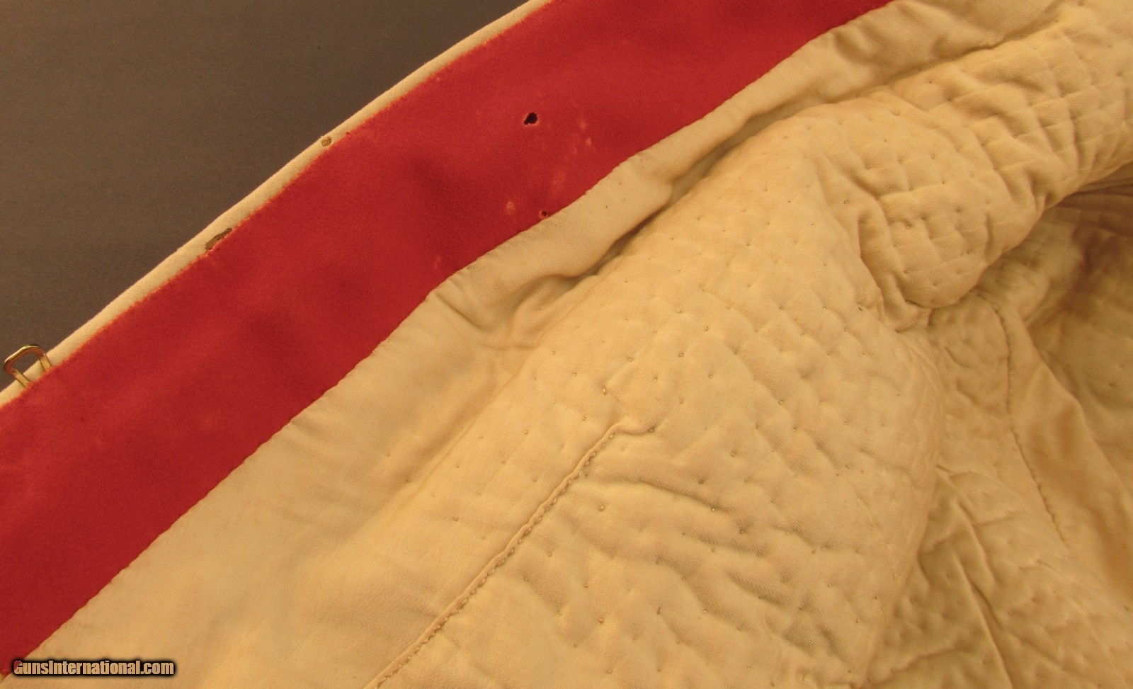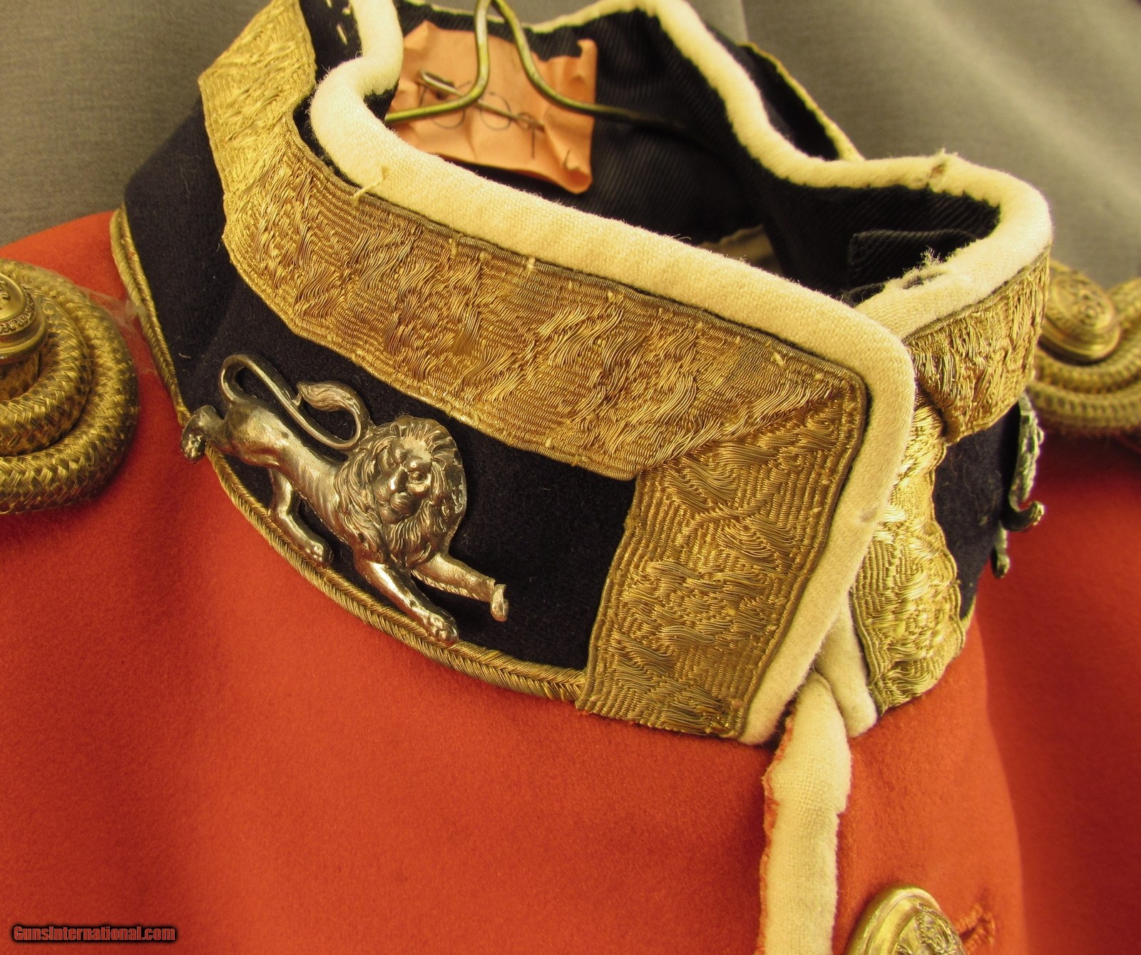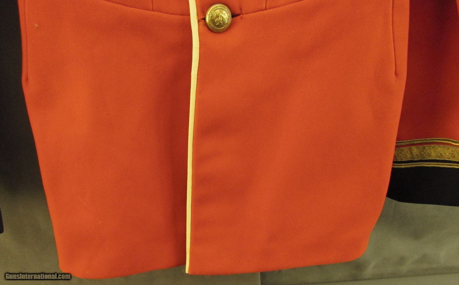 Description: This is a mid-20th century scarlet serge tunic having the insignia and buttons for the King's Own Royal Lancaster Regiment (1680-1959). The black stand collar is edged with heavy white piping as well as an embroidered bullion tape woven in a floral pattern and has tarnished silver regimental insignia: a male lion passant guardant. The shoulders have heavy gold cord straps with three embroidered rank pips apiece and intact embroidered bullion chevrons and galloons are present at the cuffs. The fabric retains good and vibrant original colors, although there is some tarnishing of the embroidered wire in spots, and there are a few small spots of damage and tearing on the center seam piping about halfway down. The regimental buttons are complete and have some mild tarnish but are otherwise still fairly bright and the interior white silk lining is lightly soiled but still intact. The King's Own Royal Regiment had an illustrious history and received its first battle honors in 1695 at Namur during the Nine Years' War with the last awarded for World War II (France, NW Europe, Iraq, Syria, N Africa, Italy, Malta, and Burma). In 1959 it was amalgamated with the Border Regiment to form the King's Own Border Regiment and continues the lineage in today's British Army as the Duke of Lancaster's Regiment. This is a great example of a British officer's tunic and is in very good-near fine condition. SOLD Manufacturer: British Model: Uniform |