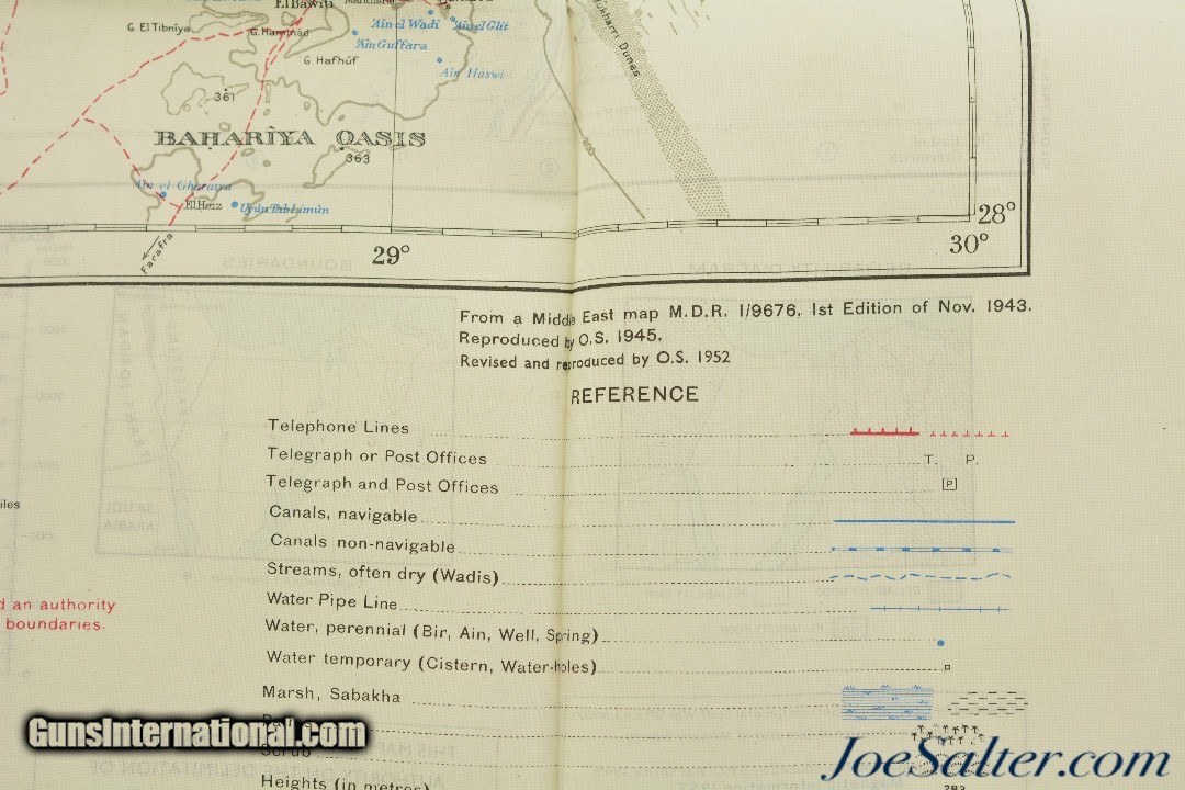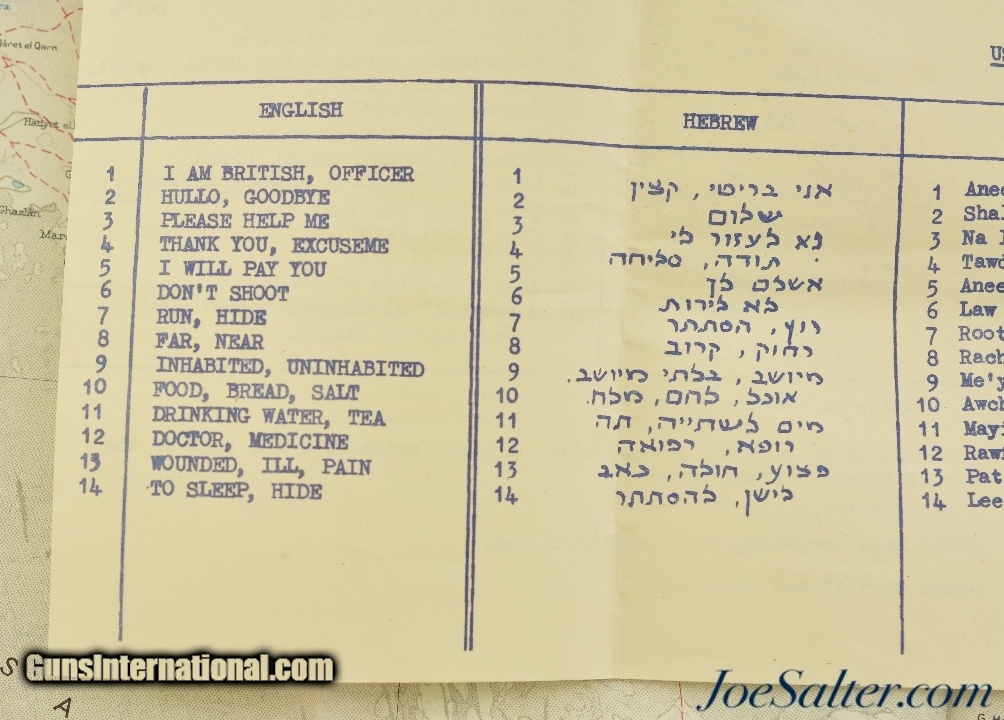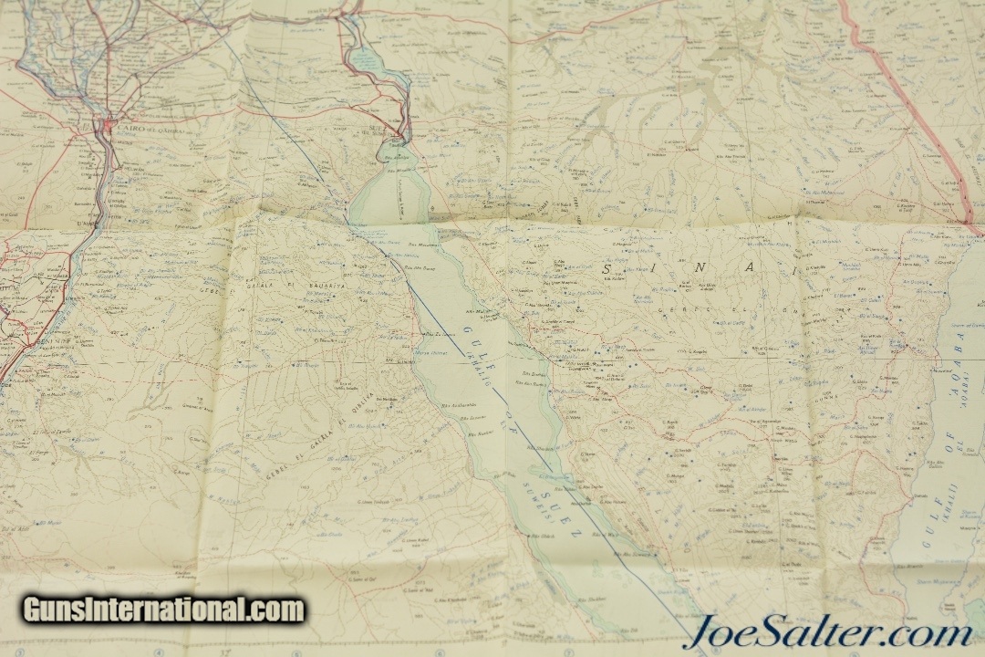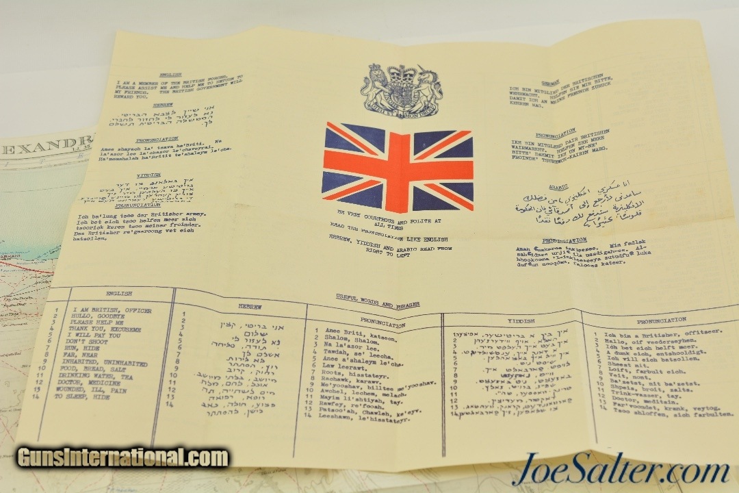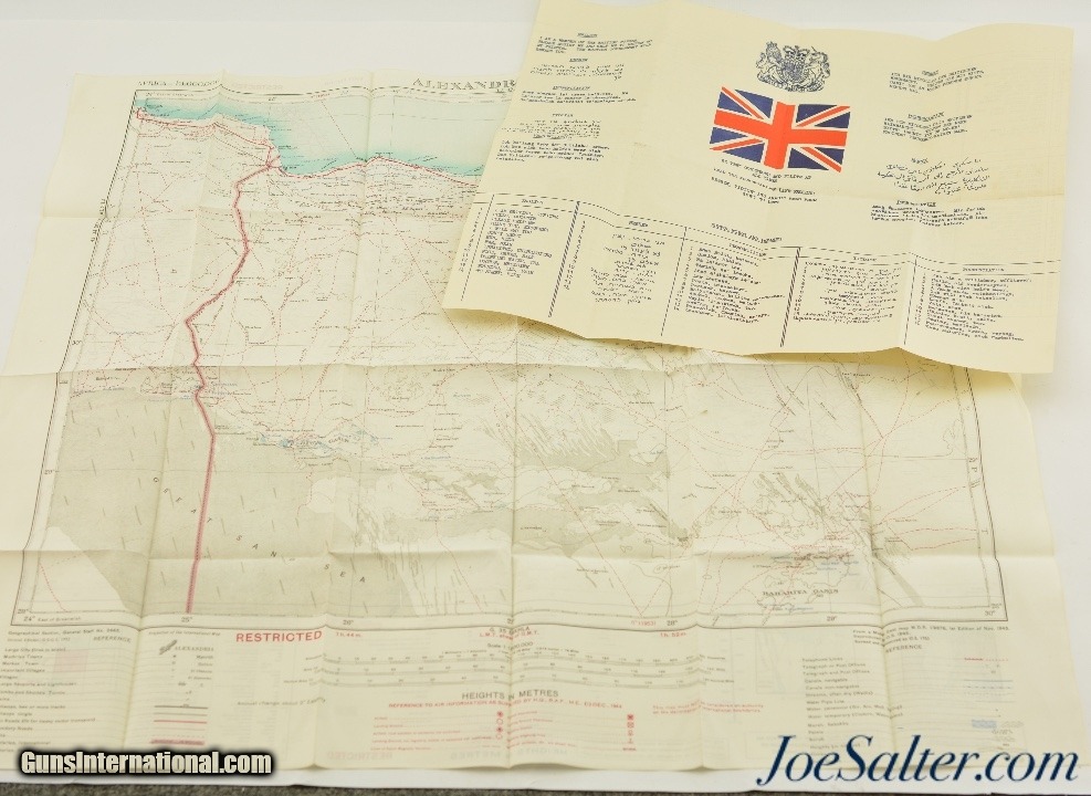 Description: This is a silk map (H 58cm x W 66cm) showing Cairo and environs on one side and 'Alexandria-Tobruch' on the other. Silk escape map issued for Operation Musketeer, the British invasion of Suez in November 1956. The map is an Ordnance Survey 1952 edition revised and reproduced from the OS 1945 edition which in itself was reproduced from a Second World War map produced in November 1943. This map is in unissued excellent condition. Also included is a British military ‘Useful words and Phrases’ Sheet. Contains translations into Hebrew, Yiddish, German and Arabic of useful phrases to expedite rescue. These would have been issued as part of a survival kit. The sheet is also new and unissued.; Price: $69.95 Contact Seller |