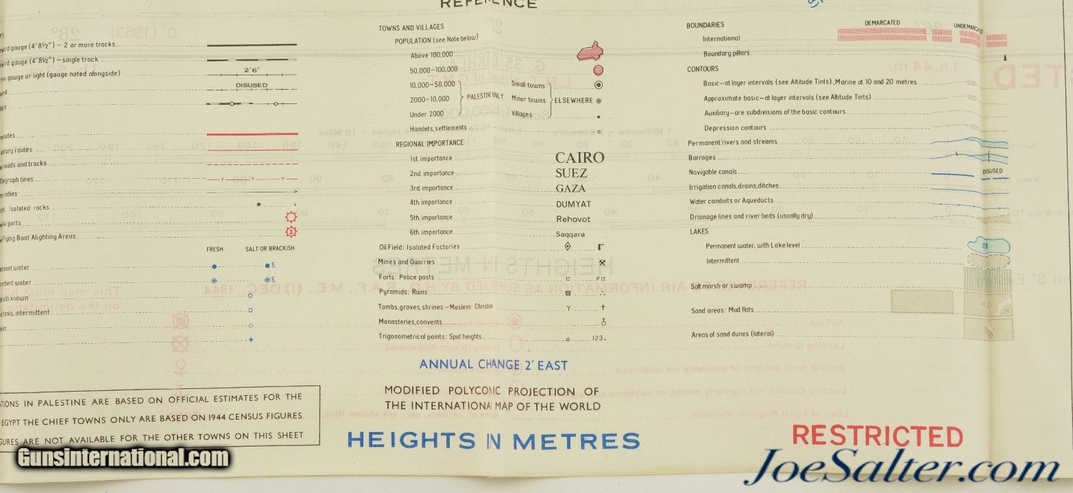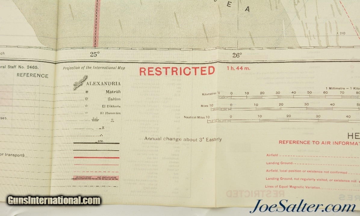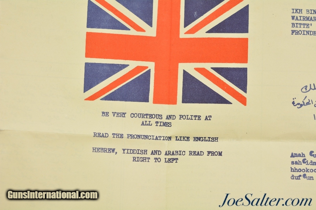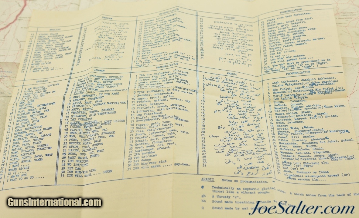 Description: This is a silk map (H 58cm x W 66cm) showing Cairo and environs on one side and 'Alexandria-Tobruch' on the other. Silk escape map issued for Operation Musketeer, the British invasion of Suez in November 1956. The map is an Ordnance Survey 1952 edition revised and reproduced from the OS 1945 edition which in itself was reproduced from a Second World War map produced in November 1943. This map is in unissued excellent condition. Also included is a British military ‘Useful words and Phrases’ Sheet. Contains translations into Hebrew, Yiddish, German and Arabic of useful phrases to expedite rescue. These would have been issued as part of a survival kit. The sheet is also new and unissued.; Price: $69.95 Contact Seller |
