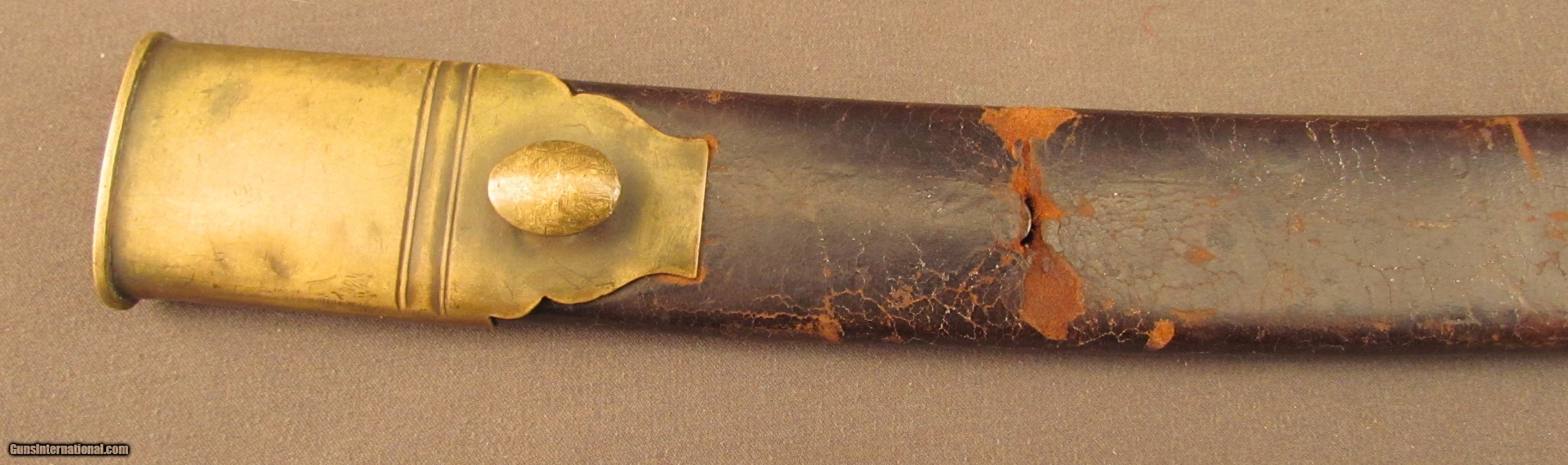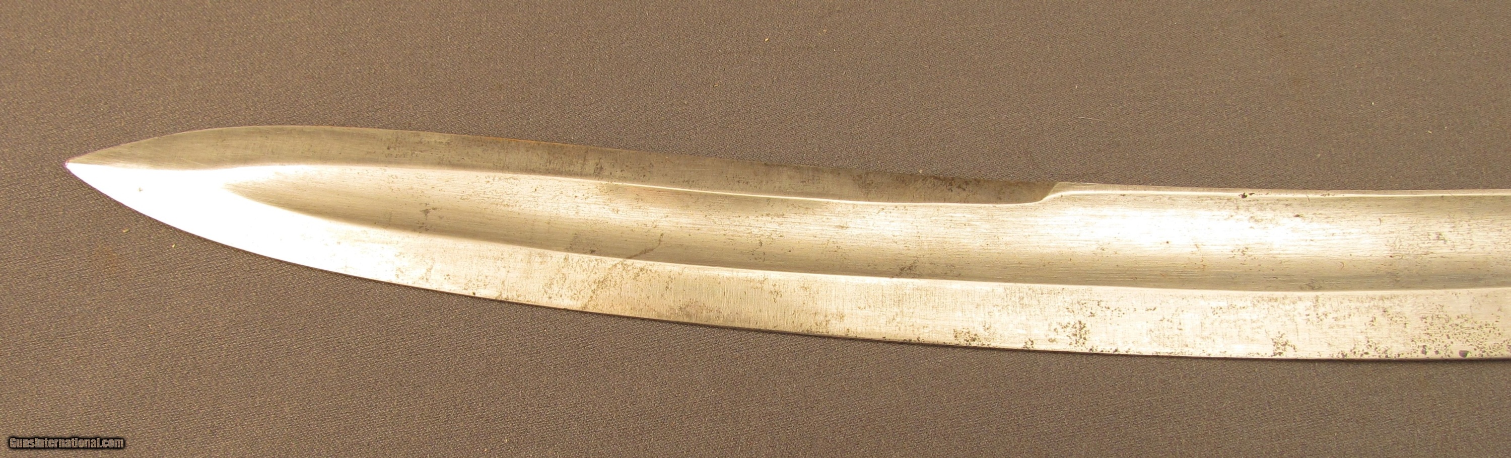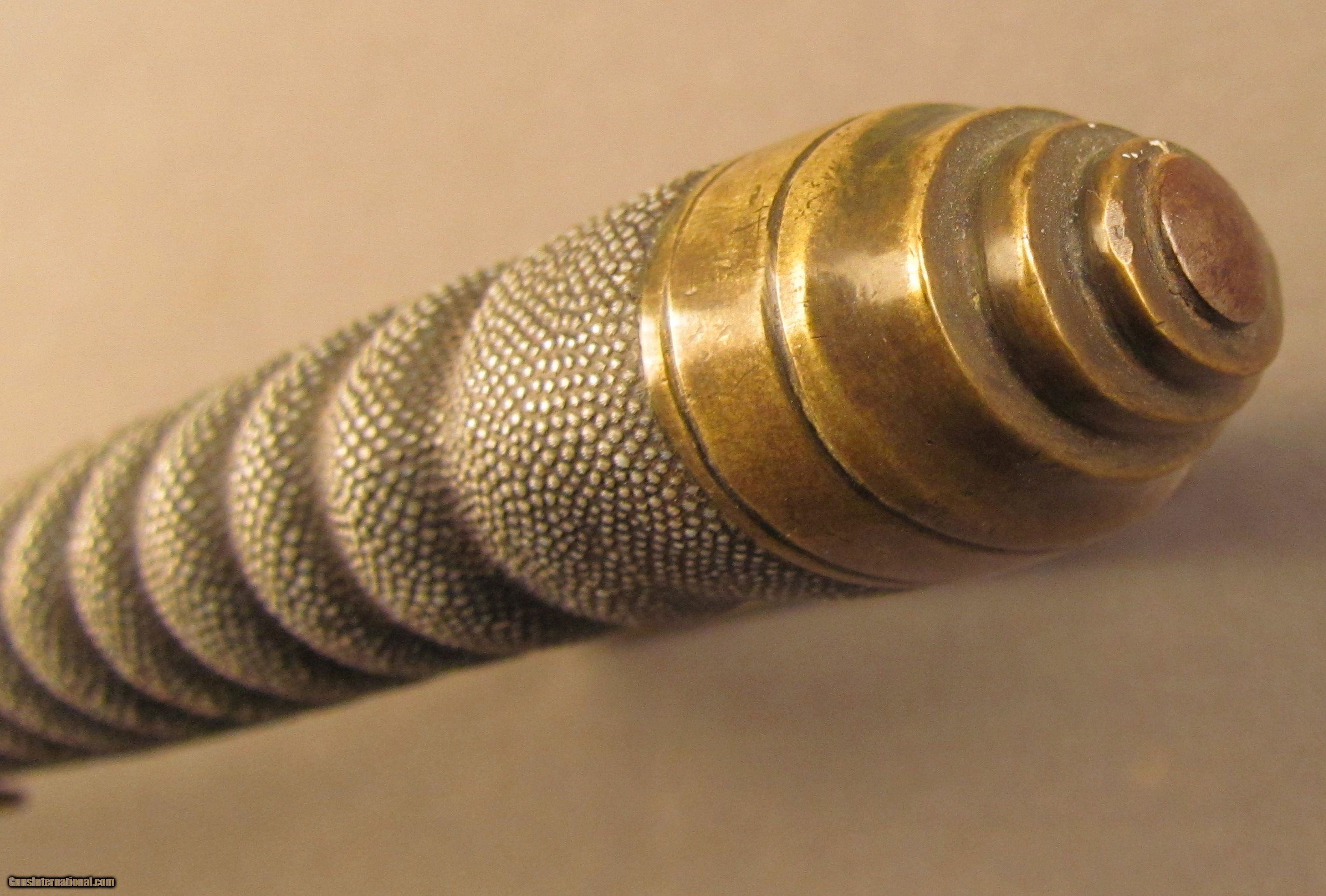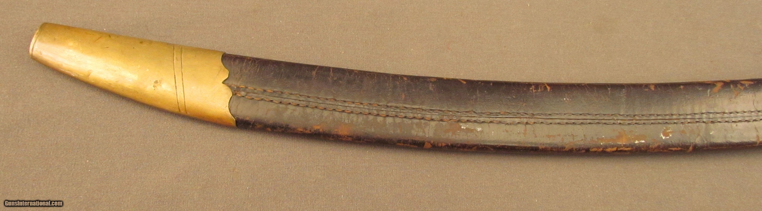 Description: A Victorian era British police sword with no marks which is more often than not the usual case. The 24" curved blade has a 22 1/2" fuller and a 7" sharpened back edge. The grip is of fishskin with wire winding, (The wire is now missing). The guard, griping ring and pommel are brass as are the throat and tip of the leather scabbard. The sword has a button actuated catch that locks into the scabbard throat. The scabbard throat has a stud for a frog. Fine overall condition with the blade showing no nicks or pings with only the grip wire missing. Also included is a photocopy of two pages from the book "The Policeman's Lot", a 1985 English publication. Antique SOLD Manufacturer: British Model: Sword Serial Number: NSN |