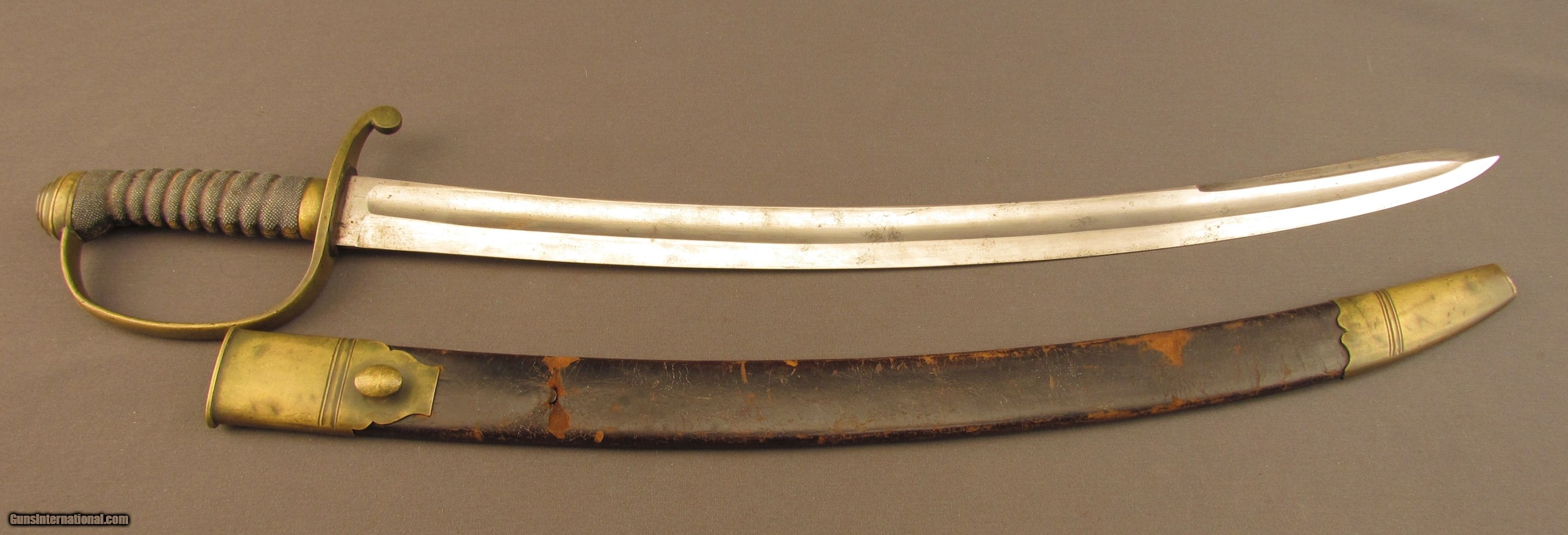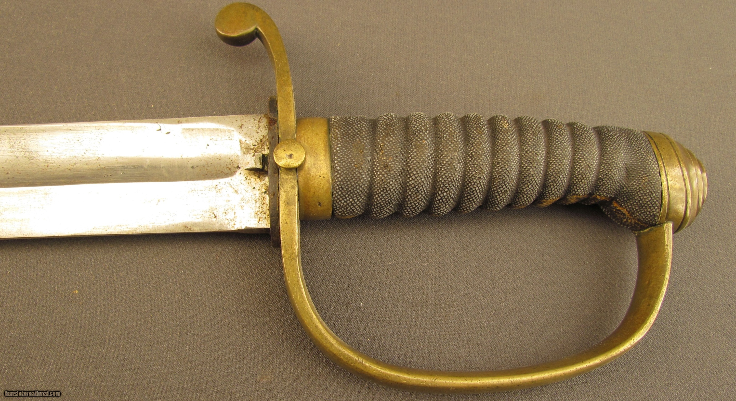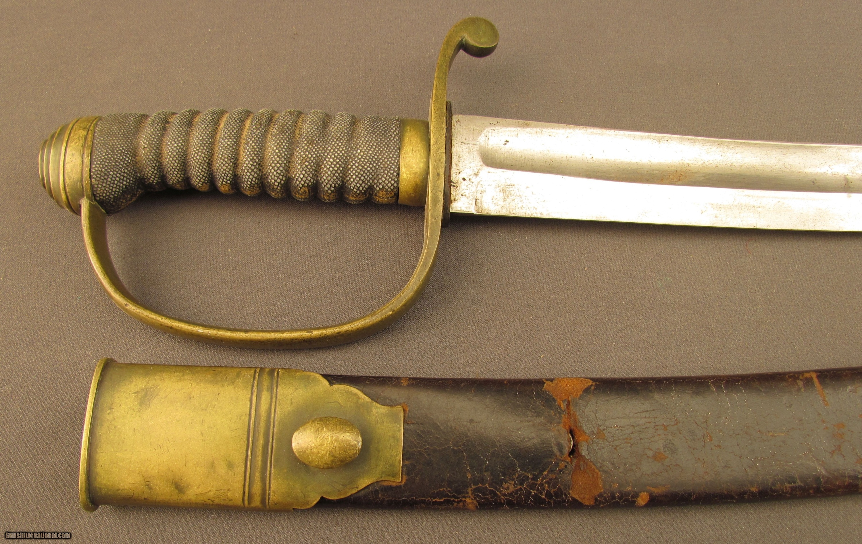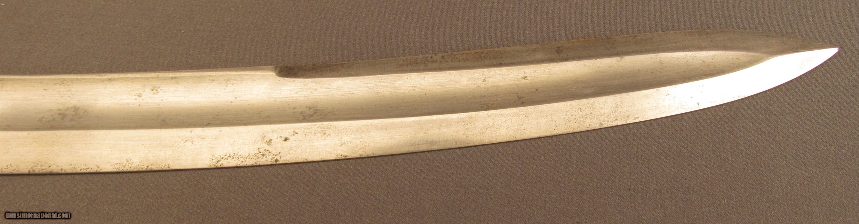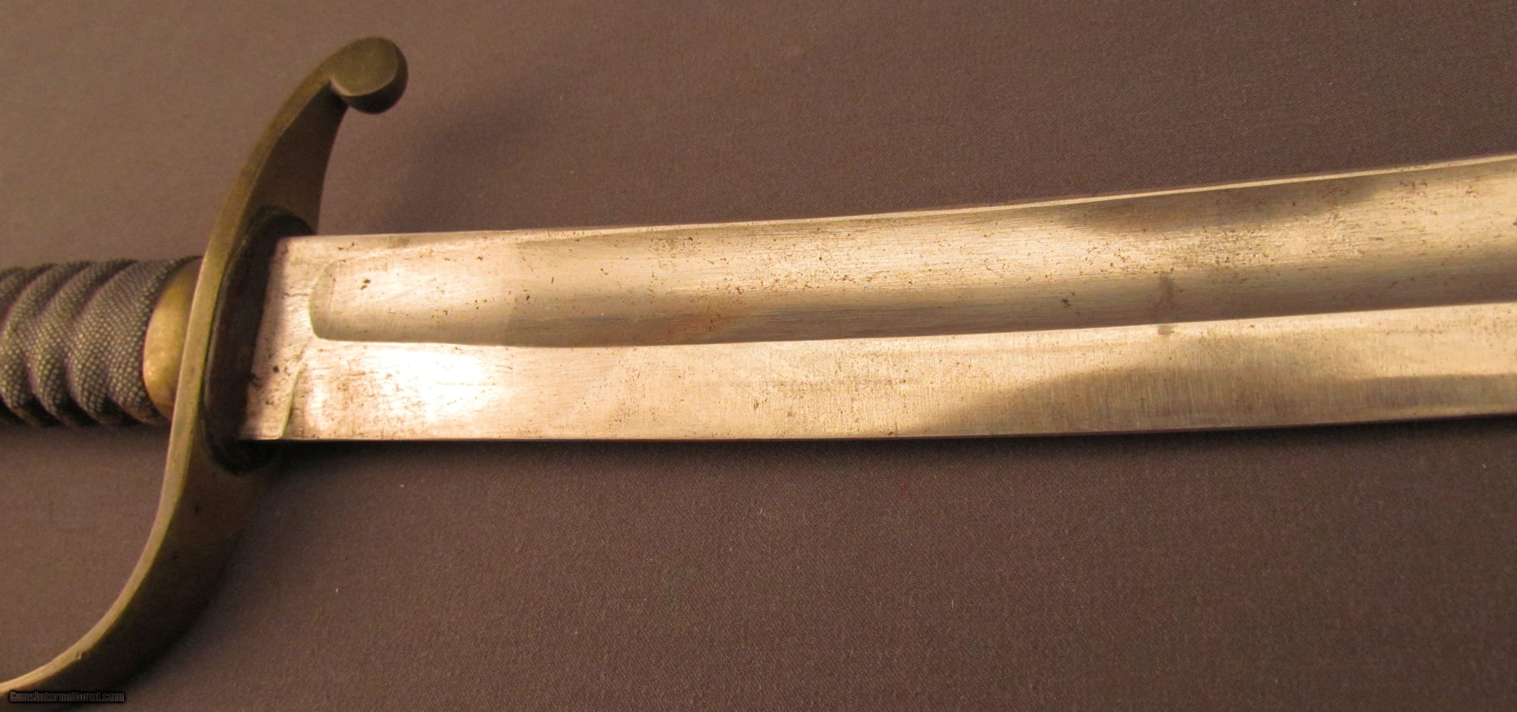 Description: A Victorian era British police sword with no marks which is more often than not the usual case. The 24" curved blade has a 22 1/2" fuller and a 7" sharpened back edge. The grip is of fishskin with wire winding, (The wire is now missing). The guard, griping ring and pommel are brass as are the throat and tip of the leather scabbard. The sword has a button actuated catch that locks into the scabbard throat. The scabbard throat has a stud for a frog. Fine overall condition with the blade showing no nicks or pings with only the grip wire missing. Also included is a photocopy of two pages from the book "The Policeman's Lot", a 1985 English publication. Antique SOLD Manufacturer: British Model: Sword Serial Number: NSN |