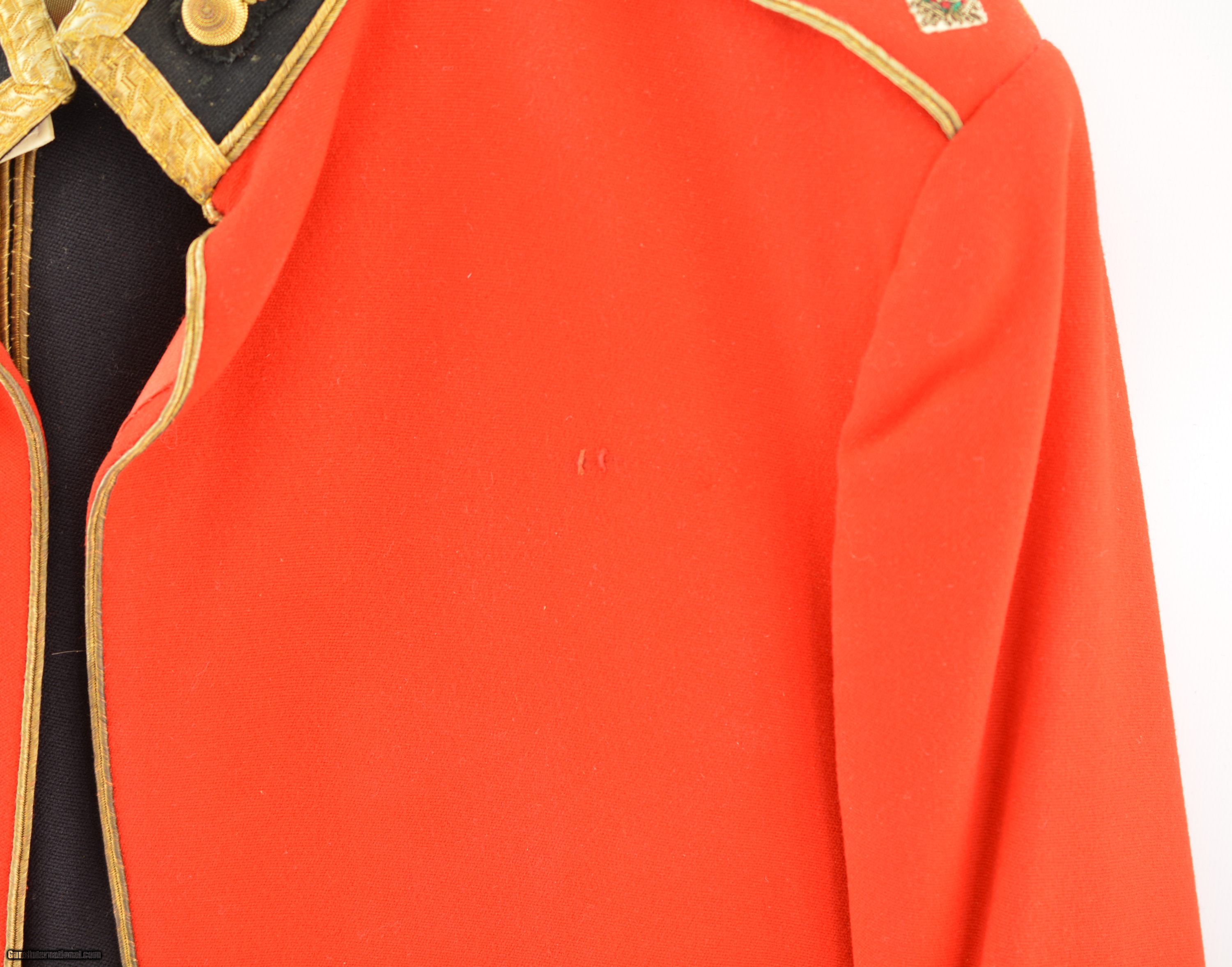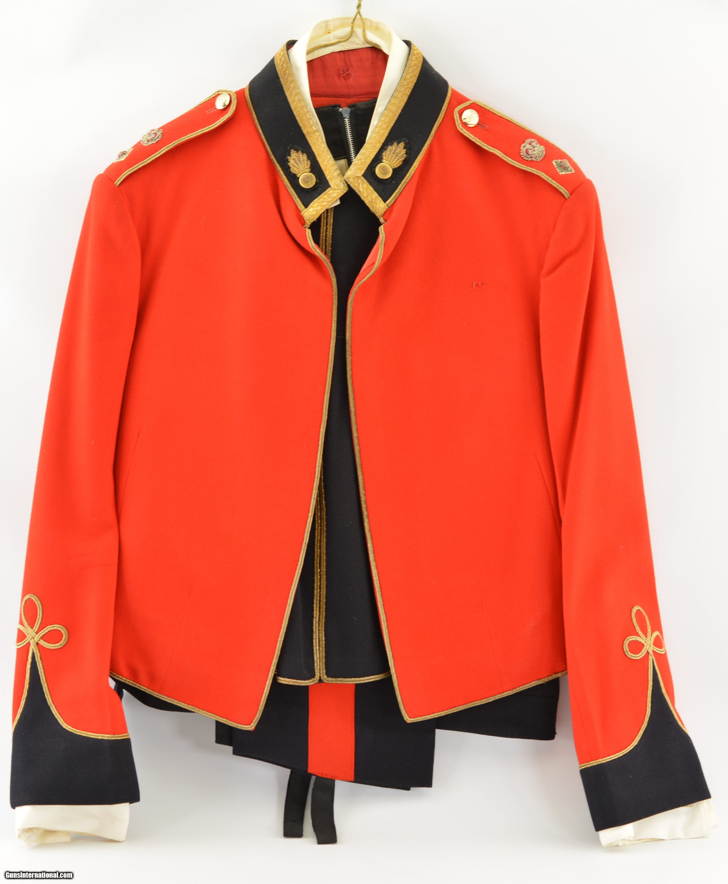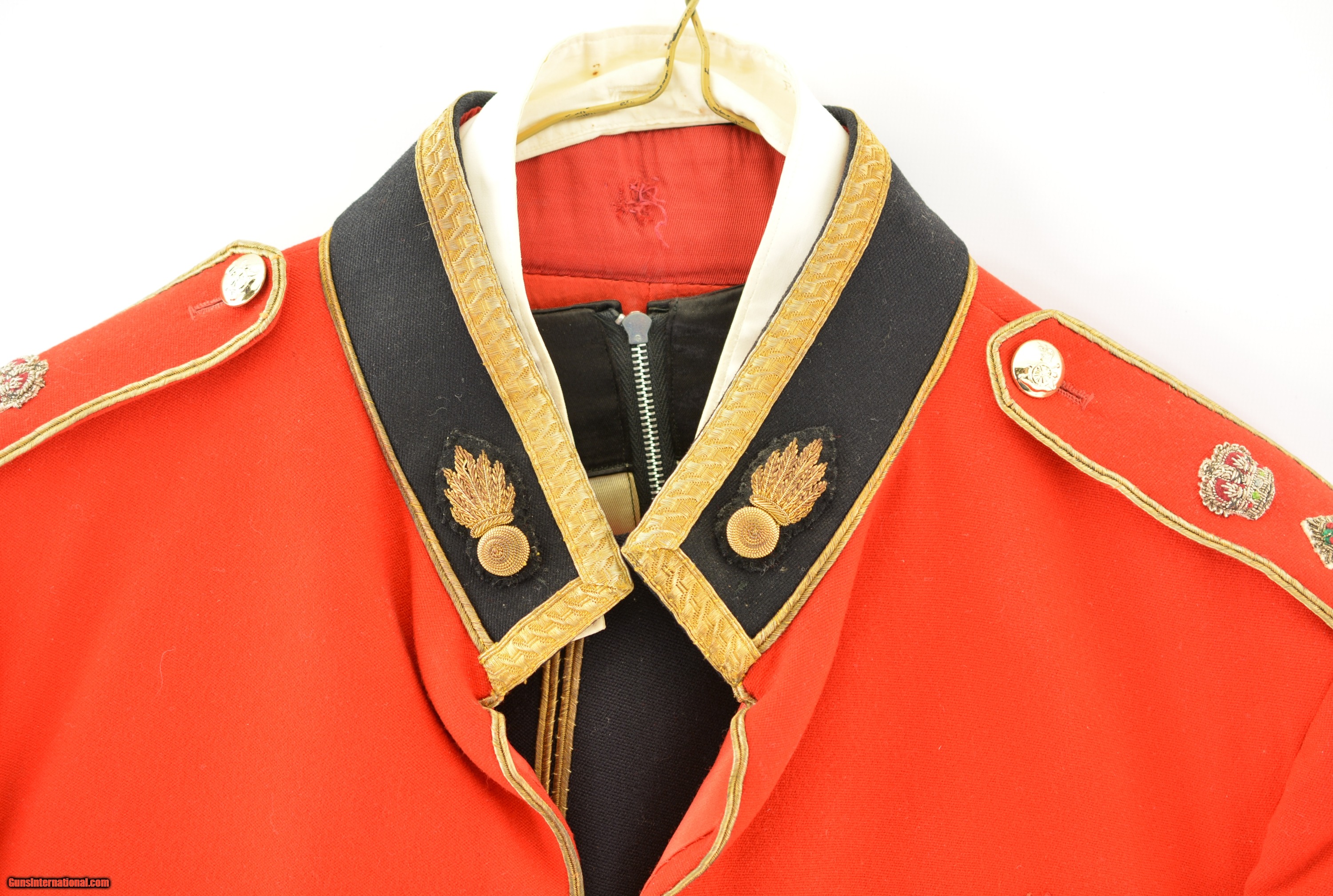 Description: This uniform consists of a jacket (fastened only at the collar), vest, and trousers. The jacket has a stand collar with embroidered bullion borders and flaming bomb devices, detachable linen cuffs and inner collar, bullion piping and trefoils, embroidered bullion Lt. Colonel rank insignia and Royal Artillery buttons on the epaulettes. The black vest has a solid front with gold bullion center seam and hem and has a rear zipper and adjustable silk back panel. The black worsted trousers have wide scarlet stripes down the legs, a zipper fly, and elastic stirrups at the cuffs. All of the uniform items are in excellent condition although there is a small amount of staining on the linen cuffs and collar as well as few slightly tattered spots on the crimson silk lining of the jacket. This is an excellent Royal Fusiliers officer's mess uniform. SOLD |