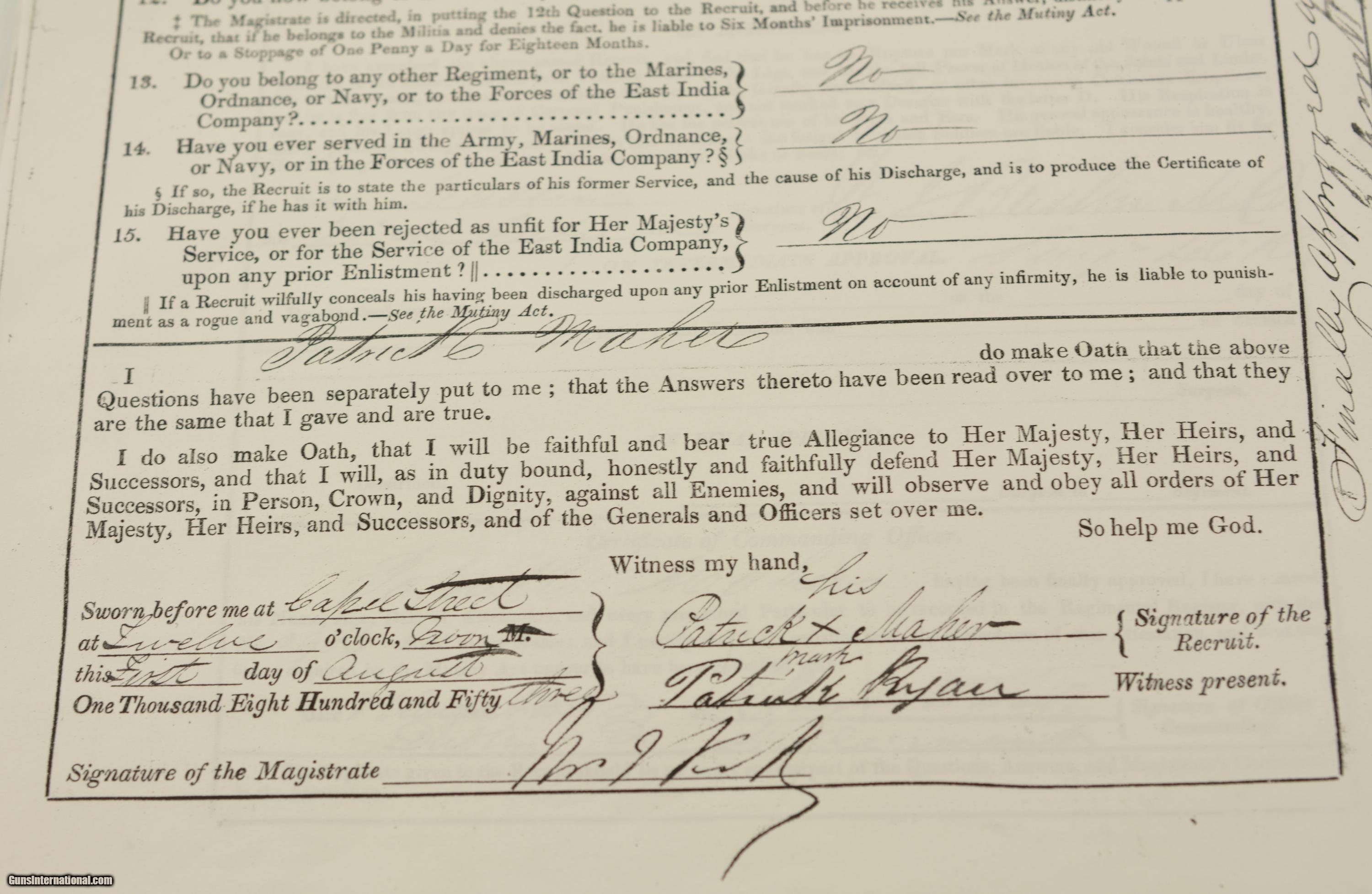 Description: This is a nicely tarnished silver medal that depicts Queen Victoria on the obverse, and a Roman soldier with Winged Victory hovering behind, holding a triumphal victory wreath over his head. The medal is identified along the edge: “Pte. P. MAHER 46th REGt.", and the original powder blue, and yellow ribbon is in good shape, but shortened and frayed at the ends. The ribbon is crossed by a single clasp: Sebastopol. Patrick Maher was a laborer from Tipperary when he enlisted in the 46th Regiment of Foot at Dublin on August 1, 1853 at the age of “17 6/12 years". Included with the medal are copies of Maher’s Medal Roll entry, and his service record, issued at his medical discharge for “paralysis of the arm". Interestingly, the service report notes: “With regard to the character and conduct of Patrick Maher the Board have to report, that upon reference to the Defaulter’s Book, and by the Parole testimony that has been given, it appears that his conduct has been bad and he is not in possession of of any good conduct badges. He was convicted of a military offence by a Reg’tl. Court Martial 7 December 1856 at Camp before Sebastopol and sentenced (to) Corporal Punishment." (The punishment referred to was most probably flogging.) Nevertheless, he was awarded the medal after receiving his discharge. This is a splendid piece of Crimean War memorabilia, with an Irish connection and unusual documentary provenance. It would make a great addition to any collection of British militaria. SOLD Manufacturer: British Model: Medal |