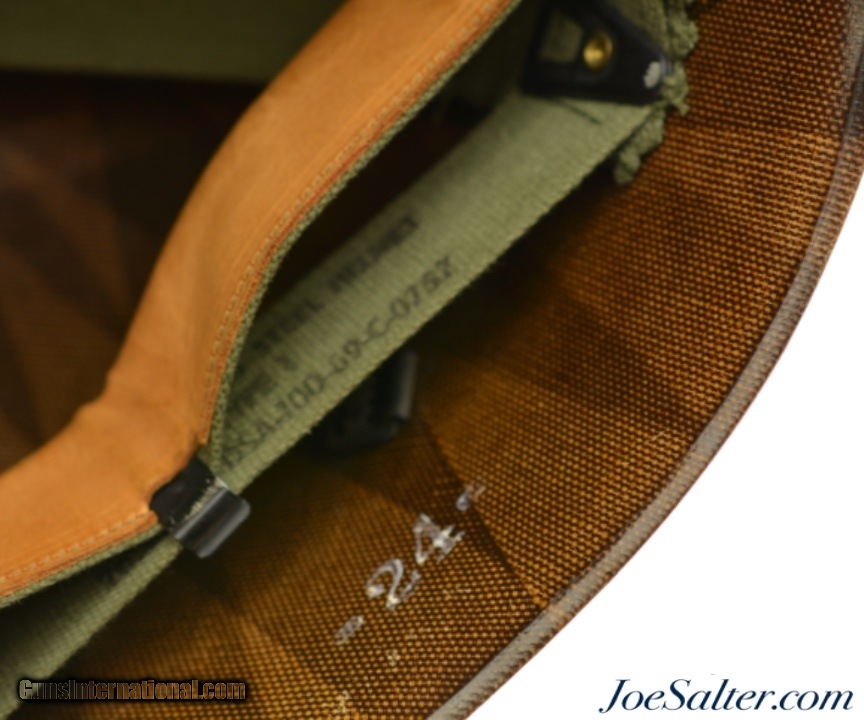 Description: This is an excellent condition used Rear Seam Swivel Bail M1 Parish Division of Dana Corp. helmet with a Marmac Manufacturing Company Liner dated Sep 68. The helmet is in excellent condition with original finish and excellent chin strap. The liner is in excellent condition with complete suspension set, supple leather head band, no chin strap. Marked US over 70 with a -24- stamped on the side over the ear. Outstanding example of late 70's M1 Helmet. SOLD |