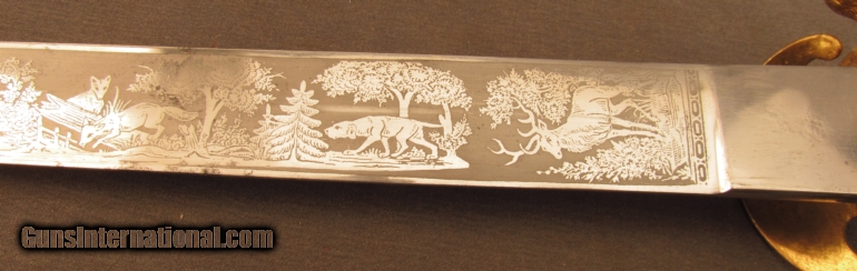 Description: This is a handsome, maker marked cutlass that measures 18 3/4” overall with a 13 5/8” single-edged blade having full-length etched panel game scenes on both sides (red deer on the obverse, foxes and hound on the reverse). The steel has an overall bright original factory polish remaining but does exhibit a few minor scratches and blemishes at the tip and on the wide ricasso which is marked with the WKC “Knight's Head” trademark on the obverse. The brass hilt has retained approximately 80% of the original gilt finish with the balance having a dull ochre patina. The lobe-shaped grip has white celluloid panels with three acorn decorations on both sides and a “D” guard knucklebow with single stag hoof quillon and clamshell counterguard. The original embroidered bullion, silver and dark green portepee is included and in very good condition, although the threads and collar are frayed and quite tender where the straps meet the base of the “acorn”. The black leather sheath has dull ochre tarished throat and chape, and the leather exhibits some mild scuffing but is otherwise in excellent shape. The scabbard is equipped with the original, lightly crazed black leather frog and the cutlass rates fine-near excellent condition overall. {Ref. “German Daggers of World War II – A Photographic Reference” Vol. 3 by Thomas M. Johnson; 2005} SOLD Manufacturer: German Model: Cutlass |