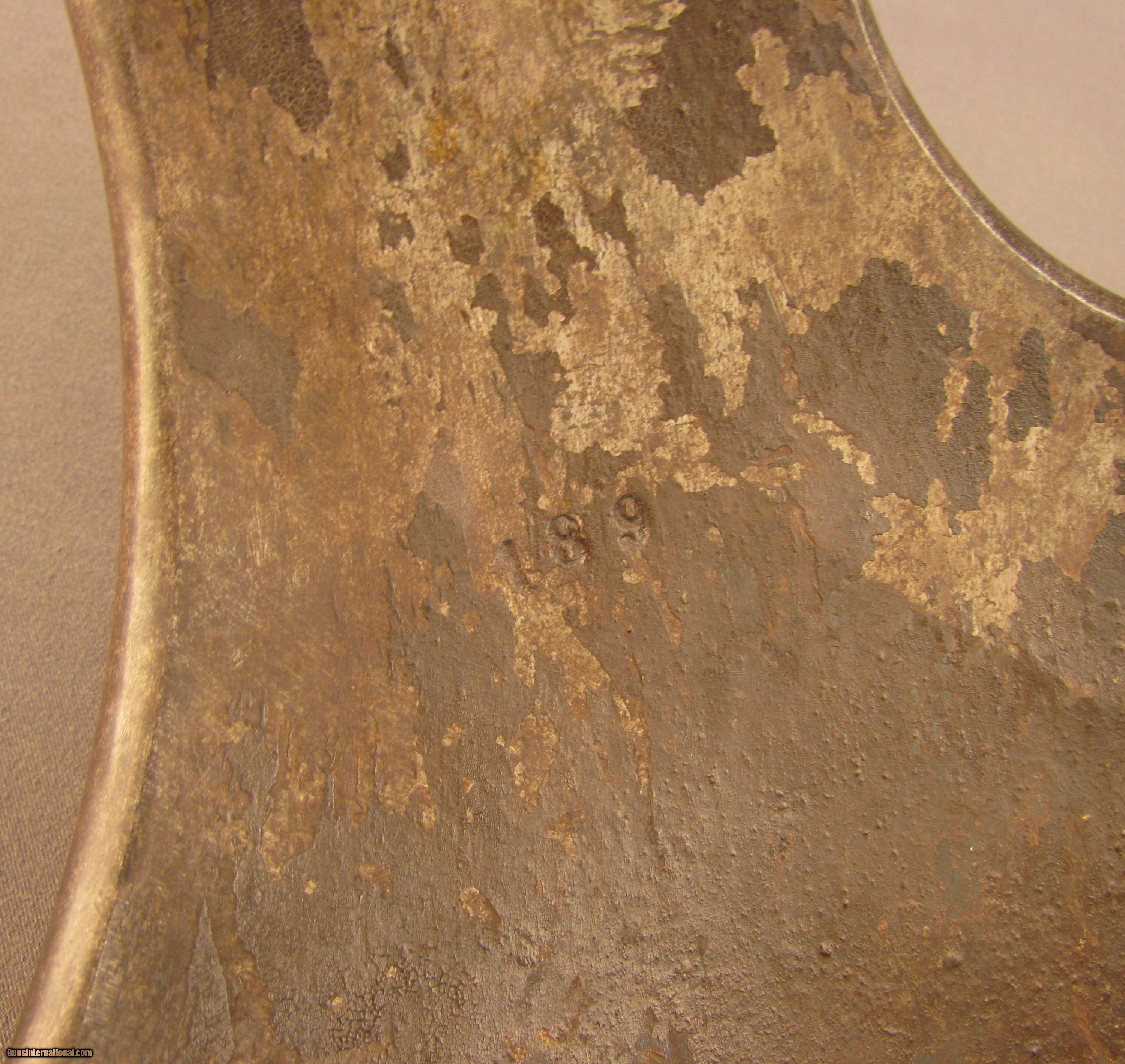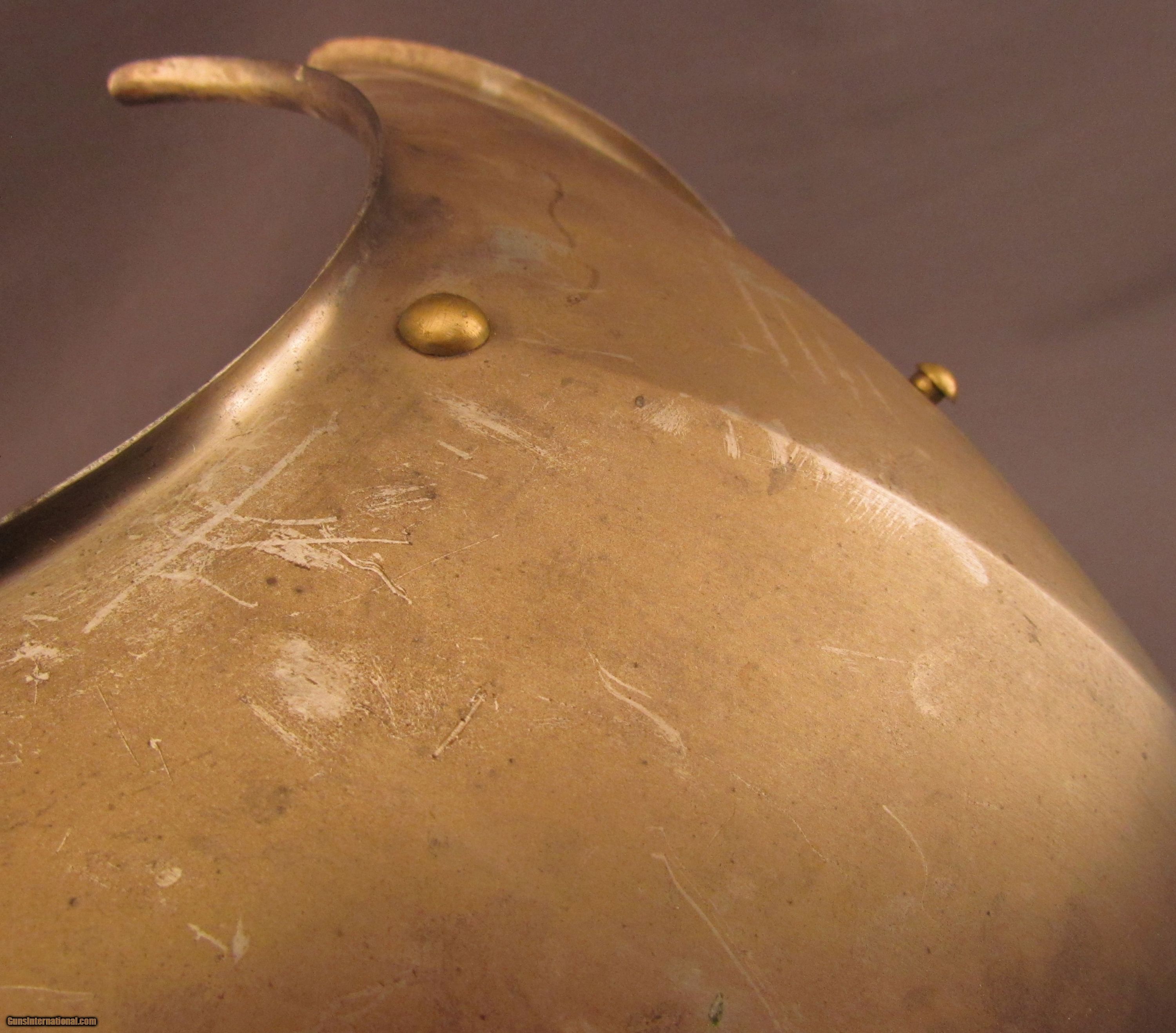 Description: This is an 1859 dated, Chatellerault-made breastplate, essentially identical to those used during the Napoleonic Wars, issued to officers and men of the Cuirassiers. This example, manufactured during the reign of Napoleon III, weighs 7 lbs. 7 oz., and is dated with arsenal inscription and serial number on the inside of the hem lip. The plate has brass rivets at the top and bottom along the center-line, and there are three brass attachment studs: two for fixing the shoulder straps of the (not present) backplate, and one keeper for the leather waist belt. The steel is in fine shape with an old coating of dried varnish along the front, and a dark brown patina on the interior. This is a neat piece of 19th century armor that was made in time for use in the Franco-Prussian War. SOLD Manufacturer: French Model: Armor |