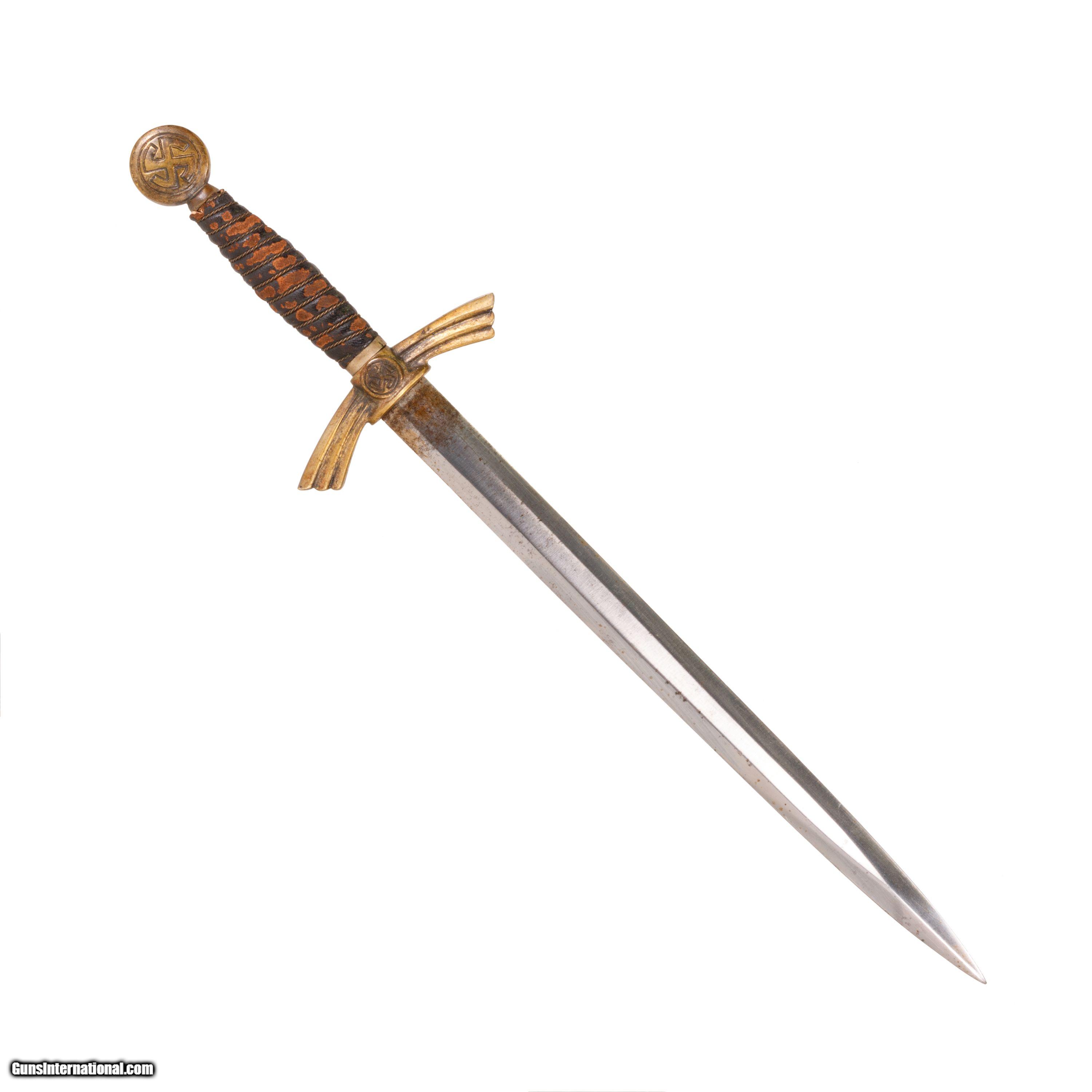 Description: Marked Alcoso Solingen. With leather and wire-wrapped handle and swastika symbols. Original leather and metal sheath. Circa 1930-45. 12" blade, total length 7 3/4". SOLD |