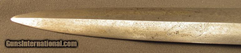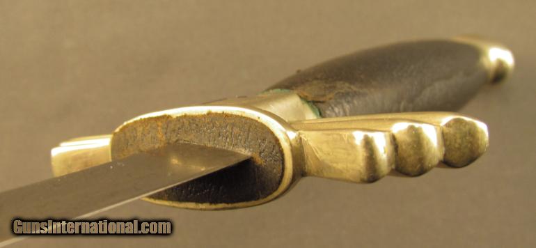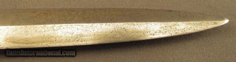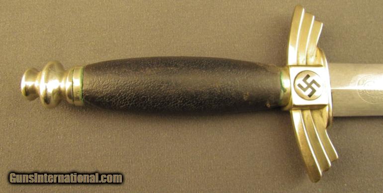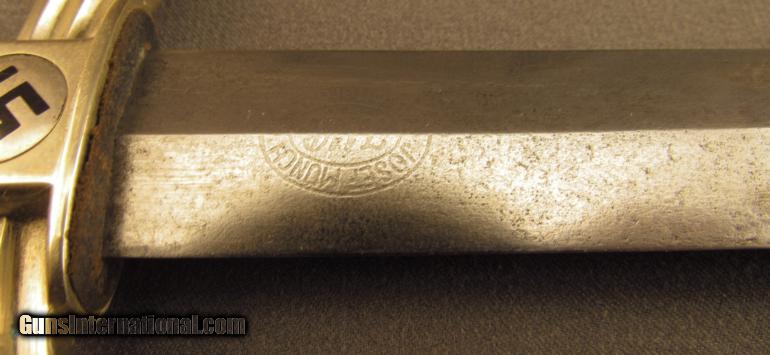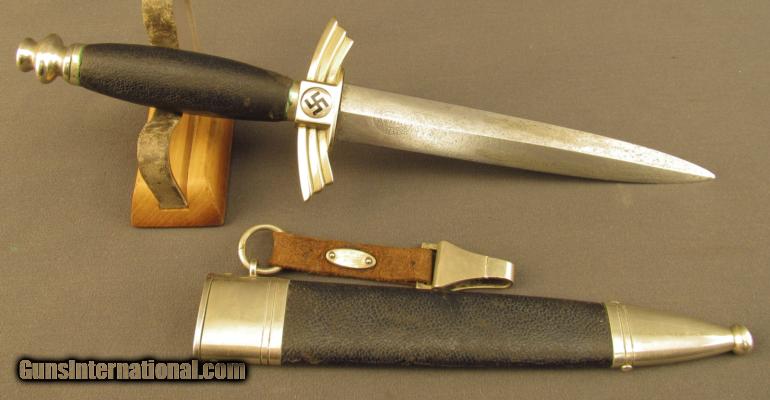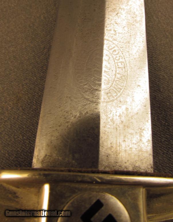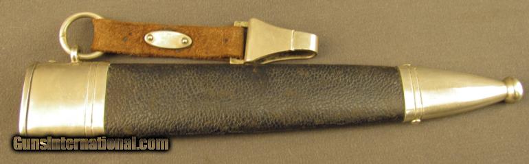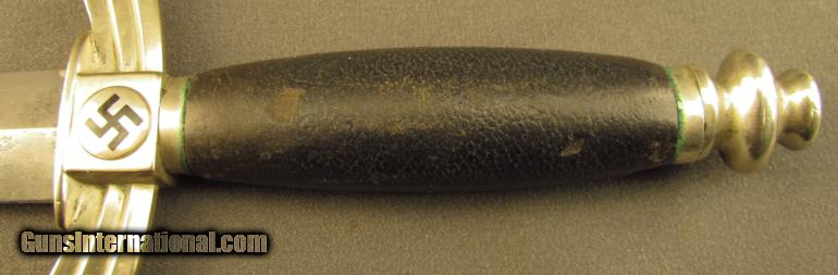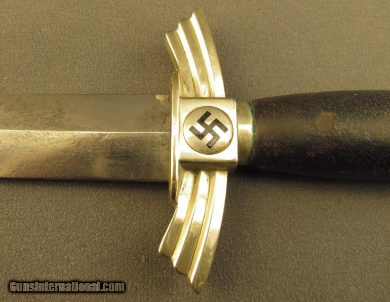 Description: This knife measures 11 15/16" overall with a 6 3/4" straight, double-edged blade. The steel has light-moderate pinprick pitting and freckling throughout on both sides and has been cleaned to bright with a slightly rounded tip. The oval "JMB" trademark (Josef M'nch, Brotterode) is still clear and legible on the reverse forte and the nickel crossguard with forward swept, triple-tiered quillons has a bright original patina with black enamel swastikas in the central disks on both sides. The pommel, likewise has a bright original patina. The blue Morocco grip is moderately worn, especially at top and bottom, but does not exhibit any crackling. The scabbard throat has the N.S.F.K. acceptance proof on the top and the blue Morocco wrap has light wear and flaking along the edges. The chape patina matches the throat and has a slight dent on the ball finial. The original leather hanger has heavy surface wear with none of the original blue remaining but is still intact and the nickel spring clip is still bright. This is a good plus flyer's knife overall and has a rare maker's mark. SOLD Manufacturer: German Model: Knife |