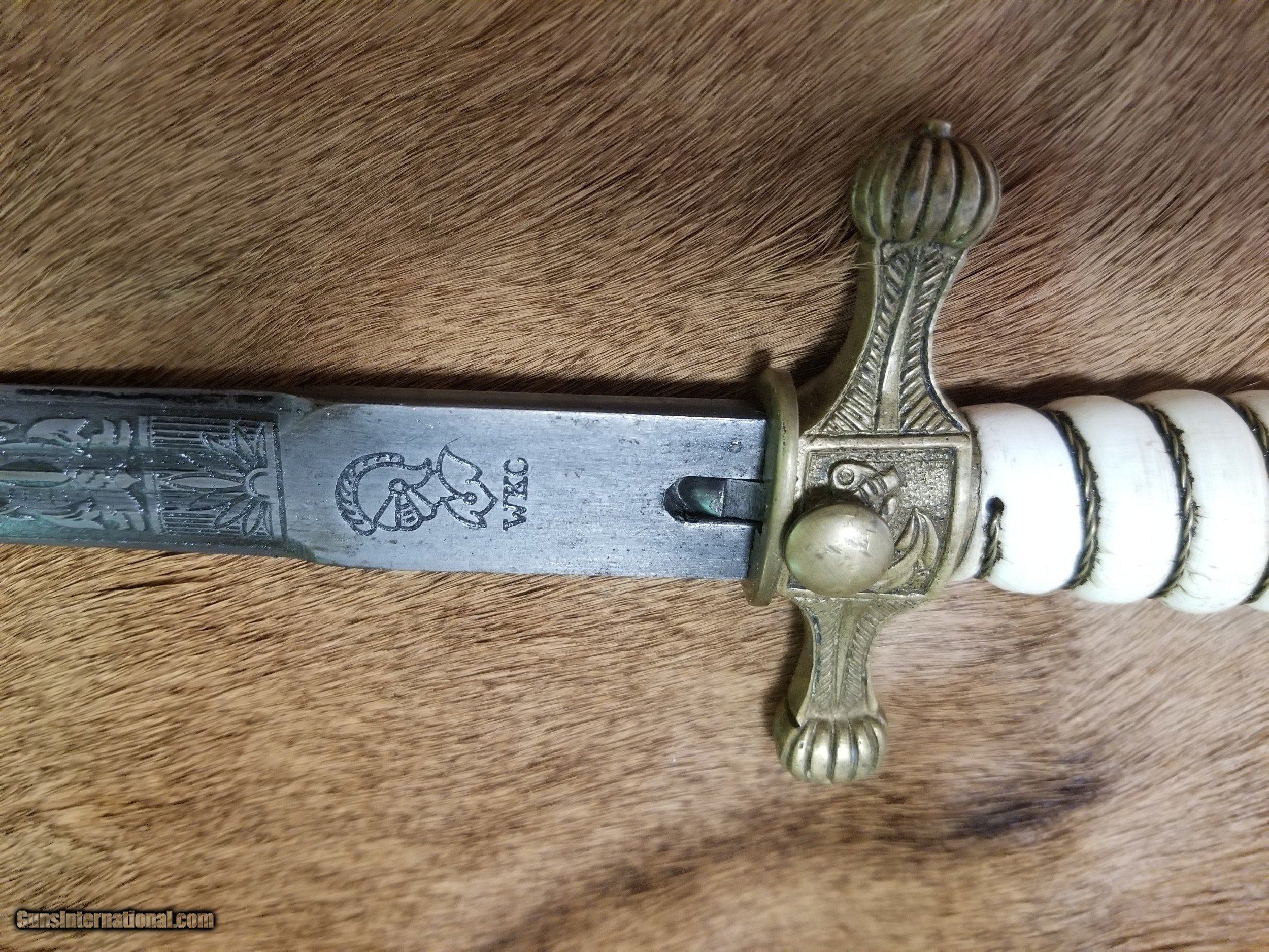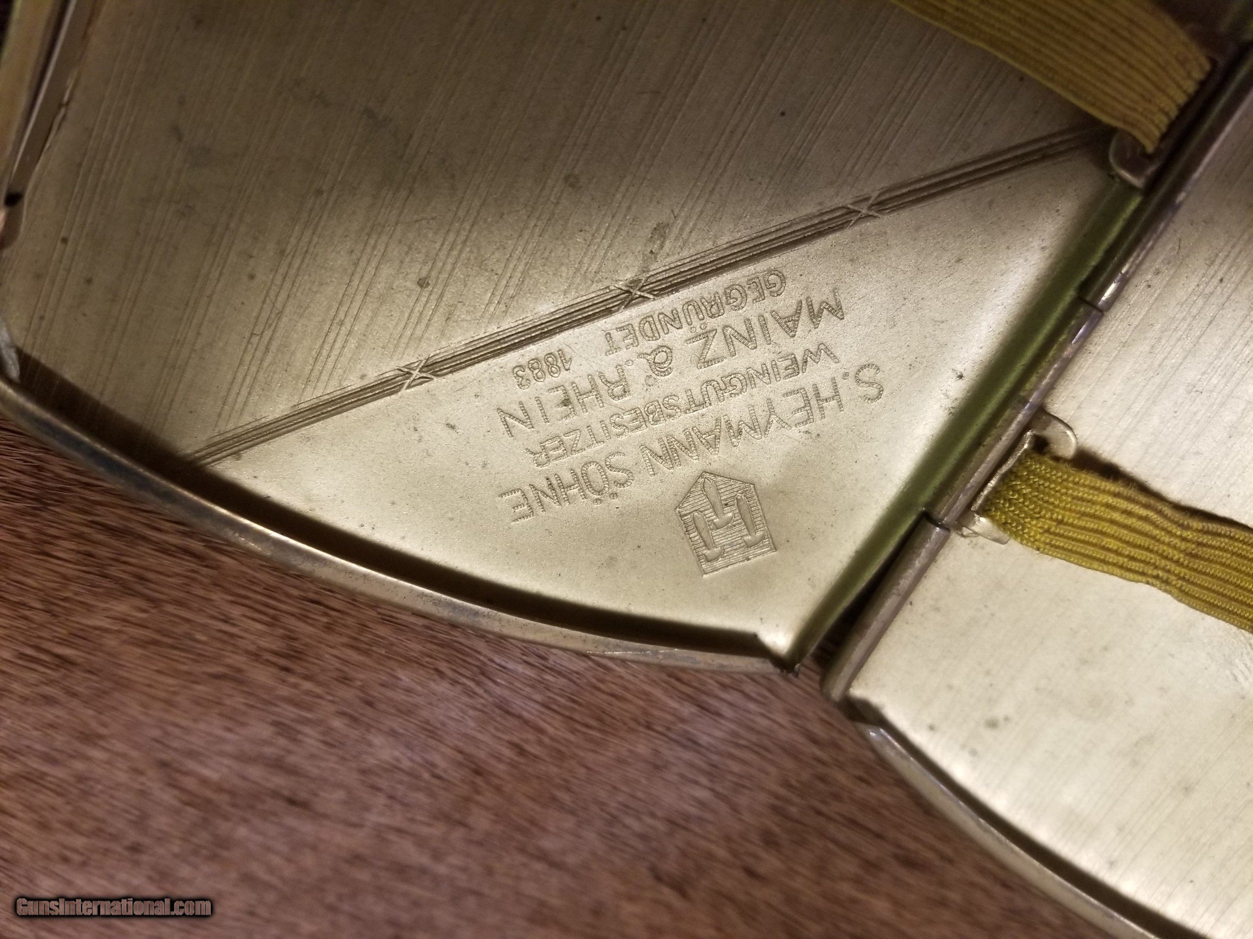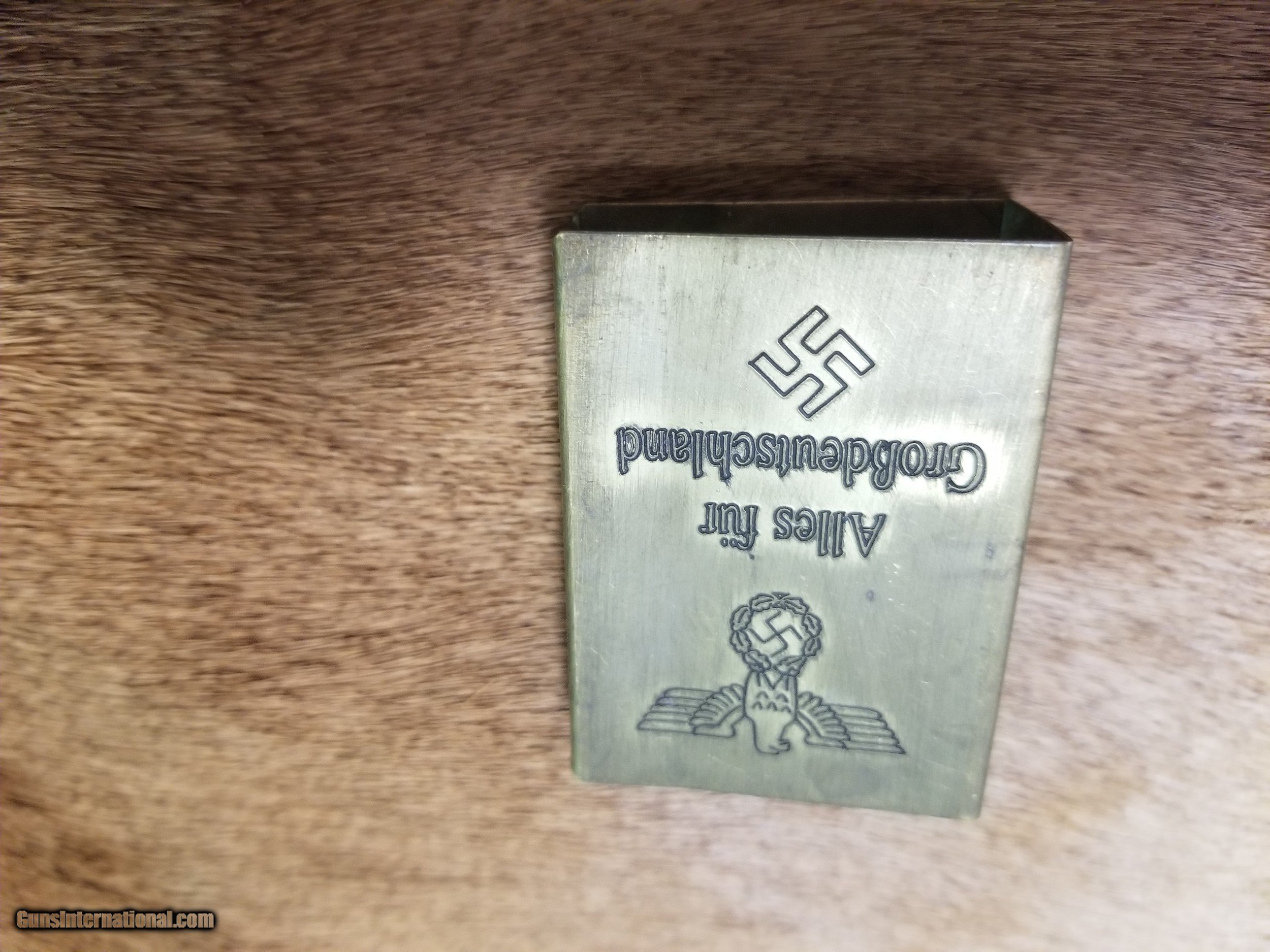 Description: Blade shows exceptional care in preserving both the Makers mark and engraving. Handle still shows guilding in thread with slight wear. Eagle is sharp with no scaring. Cigarette case also is dent free with Naval emblem and Nazi ensignia and S. Heymann So'hne makers I.D. Matchbox is a custom RZ issue which had to be purchased and embellished personally by the soldier. ( I cannot state with any degree of certainty that these pieces actually all belonged to 1 particular Naval officer) SOLD |