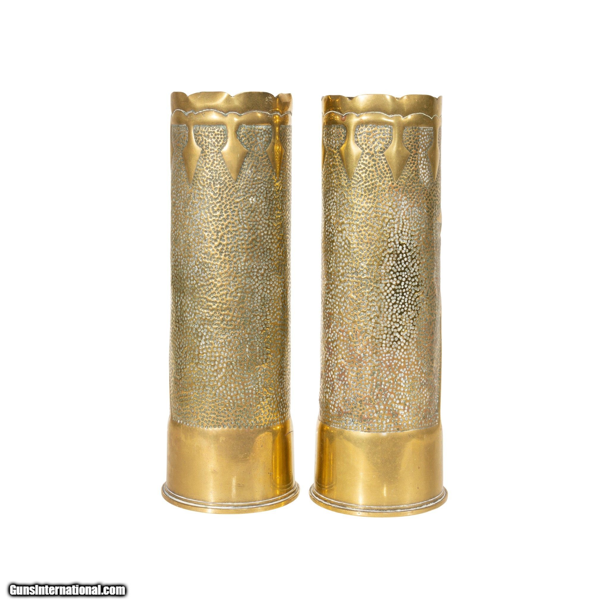 Description: Matched pair of trench art vases with overlaid lion holding flag. Highly polished. Bottom marked "Lot 1918, 1917, VSM, 1.8PR." Would make a great addition to a military or art collection, or would make for an eye catching piece of decor in a modern, vintage, or rustic home or cabin. Made in Europe, 1917-18. Size: 12'H x 3 1/4"D Family Owned & Operated Cisco’s Gallery deals in the rare, exceptional, and one-of-a-kind pieces that define the history of America and the Old West. Our pieces range from American Indian to Cowboy Western and include original items of everyday life, commerce, art, and warfare that tamed America’s frontier. Our 14,000 square foot gallery opened in 1996 in beautiful Coeur d’Alene, Idaho. Personal Service Cisco’s operates on old fashioned values – honesty and integrity, and all of our items are backed by our money back guarantee. We appreciate the opportunity to earn your business. Whether you desire assistance with a jewelry purchase, choosing a gift, identification, or even selling – we hope to be your trusted source. SOLD |