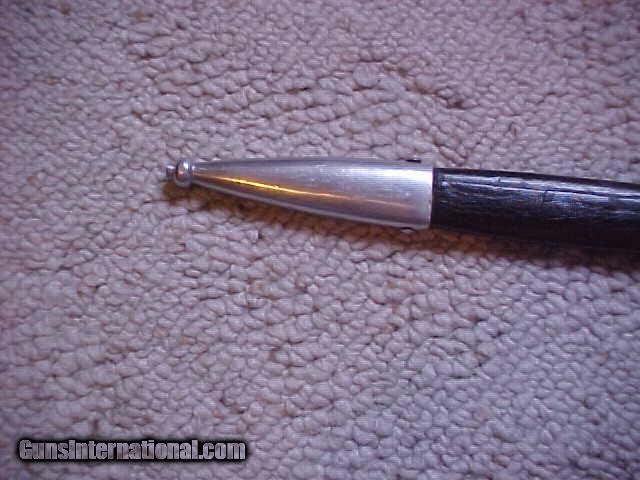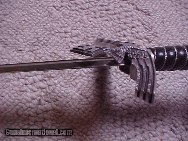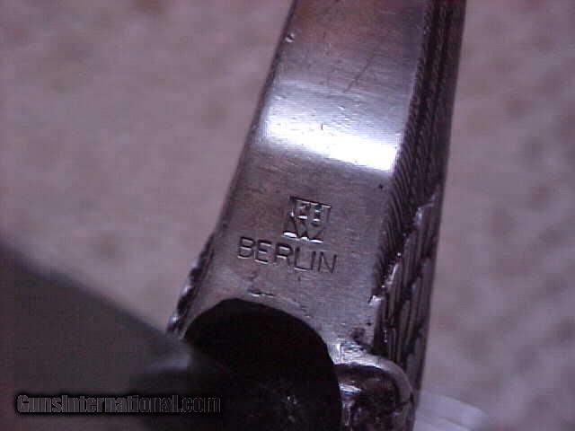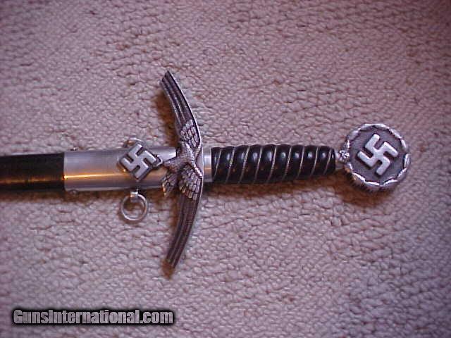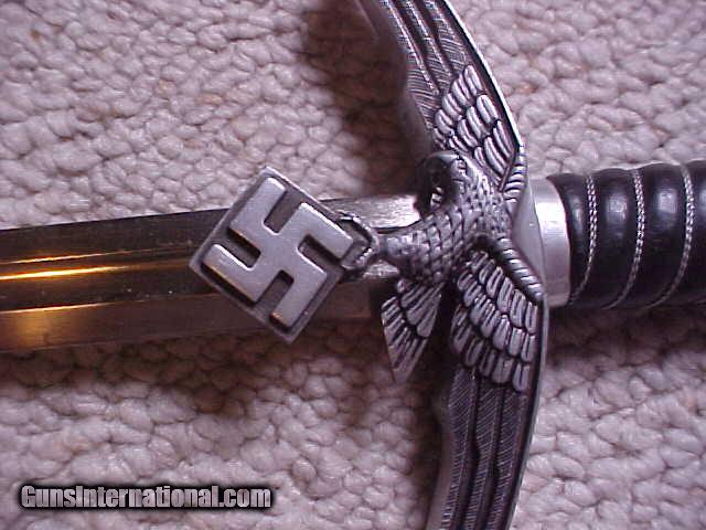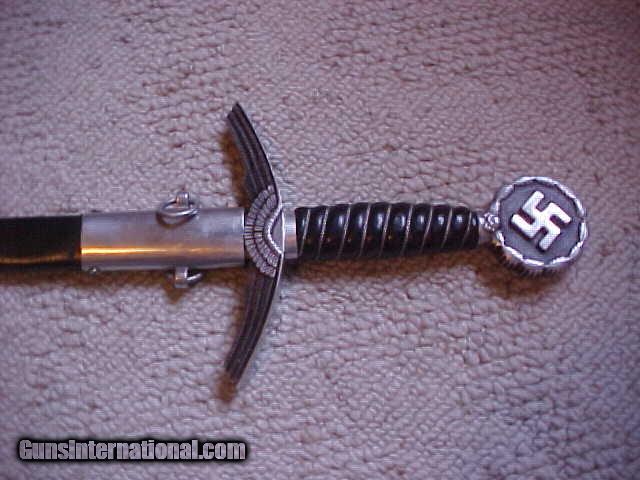 Description: Original Nazi WWII sword fashioned after Hermann Goring's wedding sword. Special ordered and built in Berlin rather than the Ruhr valley by Gaeflen. Goring had a light weight copy of his wedding sword built and this could be simaler or the sword itself. Aluminum guard and pummel with 30.5" blade with aluminum ends on leather covered scabbard. . US sales only. The guard has a W hallmark and Berlin on it. SOLD |