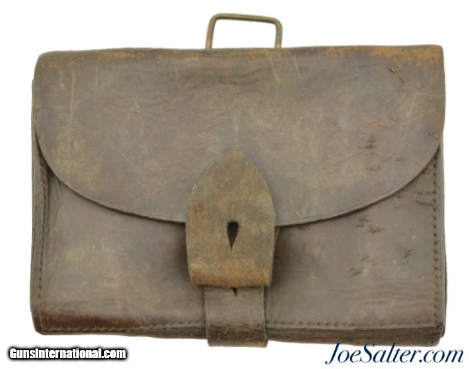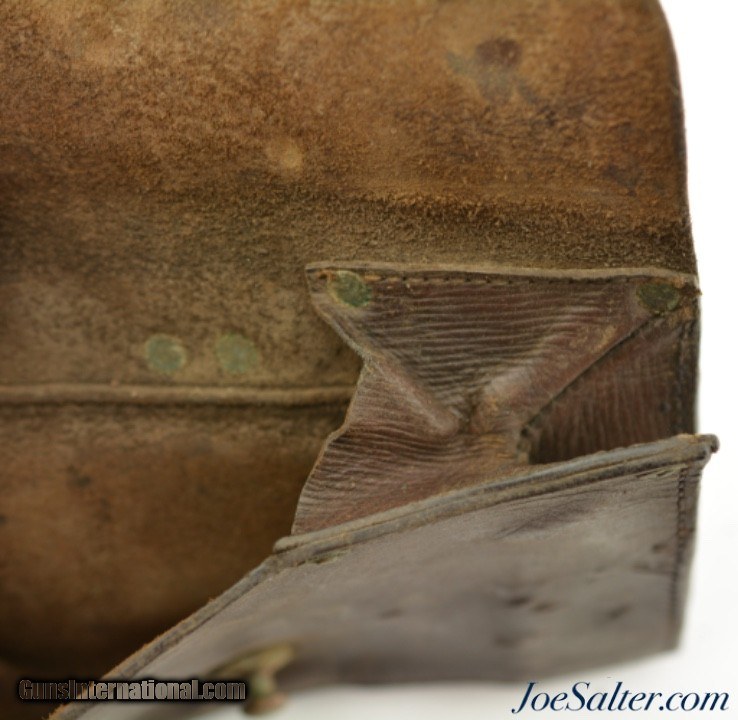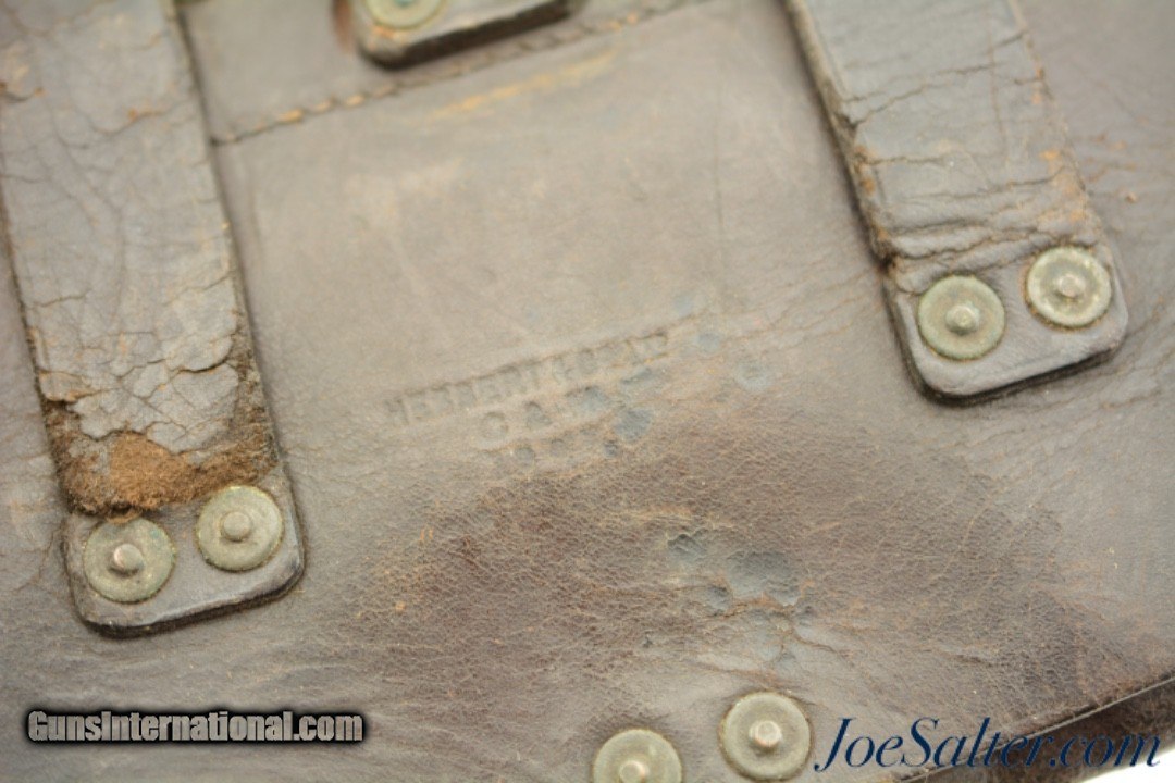Description: This is an original Pre-WW1 British Pattern 1901 Naval Ammunition Pouch with all leather construction with a single flap closure with an adjustable closure strap to a brass tab. The pouch folds into itself and will expand if needed. Two leather belt loops to the reverse, and maker marked Hebbert & Sons Ltd, C&M, Ltd., 1905. Measures 7 by 8 1/4". The leather is in good original condition with stiffness due to storage with one belt loop half ripped, hardware is fine no verdigris, has the greatest part of the stitching intact. Price: $159.00 Contact Seller |