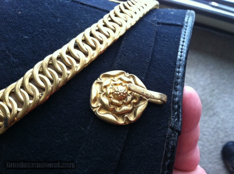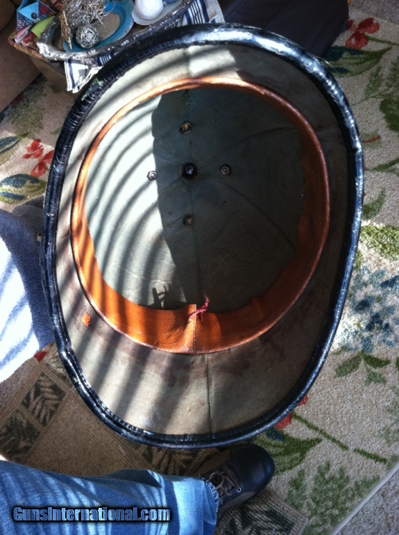 Description: British Infantry Regiment Helmet. South Wales Borderers, Great condition Cloth and leather Helmet , The fabric is black it appears blue on the photos but is Black, and in fabulous condition, The interior is green (sort of O.D. color) it is faded because of age and the leather band has vintage perspiration staining. The interior is in very nice condition and about a size 7 or so. The chain on the outside is long enough to be used as a shin strap.The nuts that hold the top metal to the helmet were missing two of the original gold collered nuts and were replaced with two older modern hex head ones to hold it all together. The metal on the outside is very nice and all intact. SWB were called that from 1881 until 1969. I dont know the vintage of the helmet as per year but seems to be quite old. SWBorderers we active in many wars. ZULU, Boer War, WW1, WW2. Google it and you will see the history. Call with any questions any time. Tom 612 859 5673 SOLD |