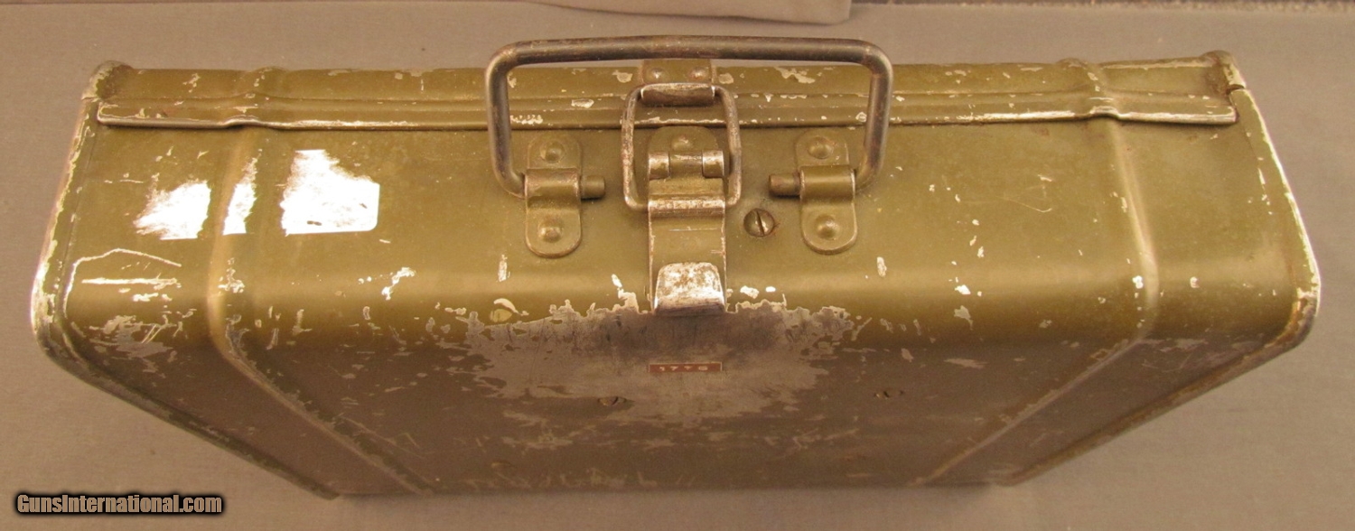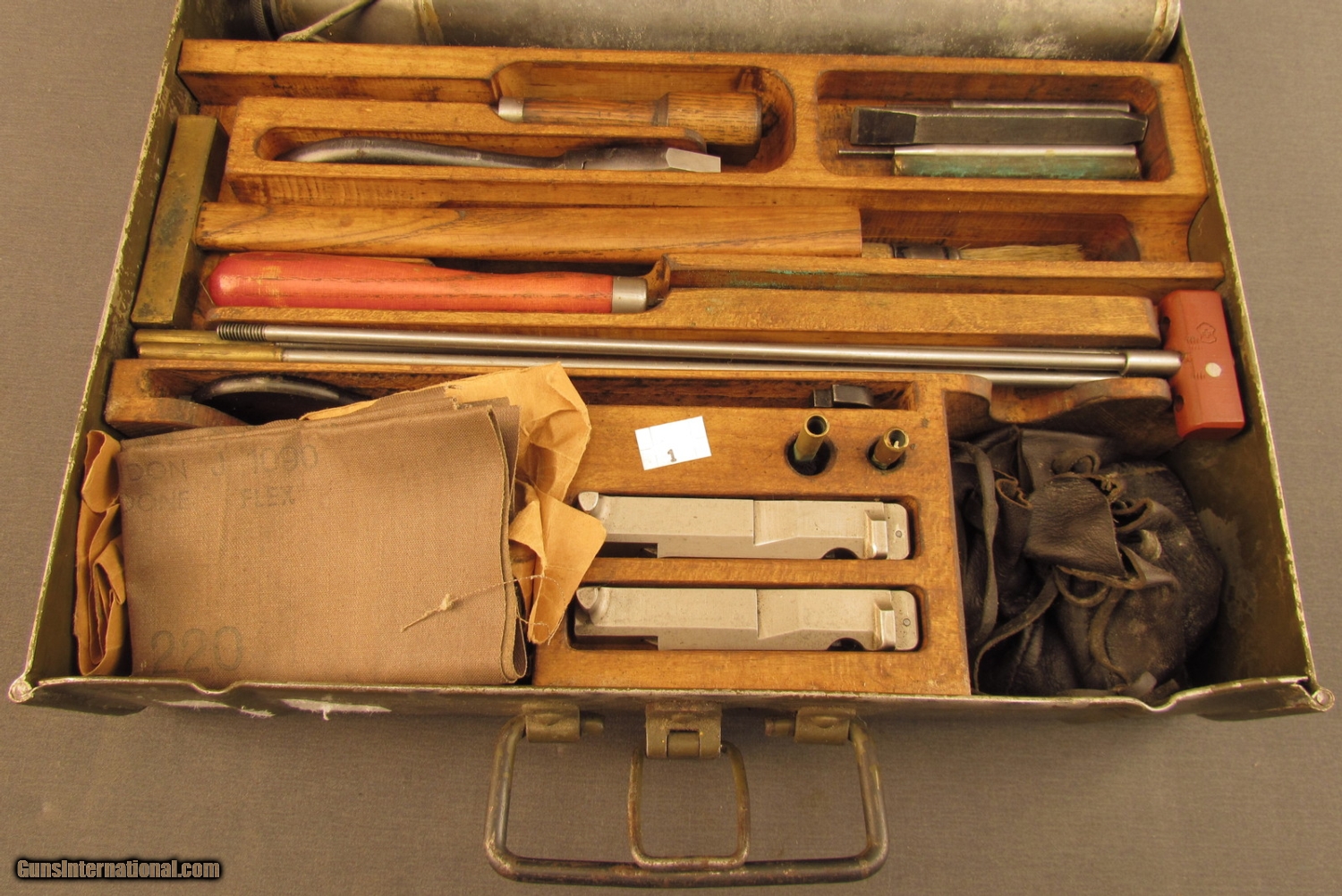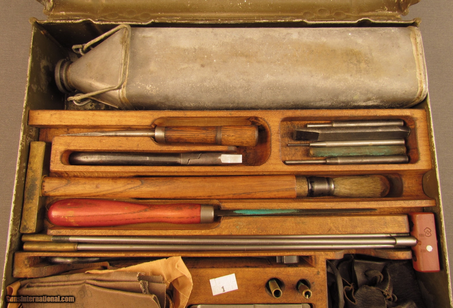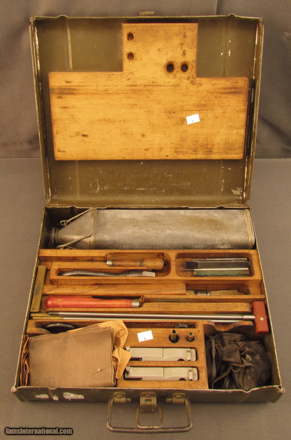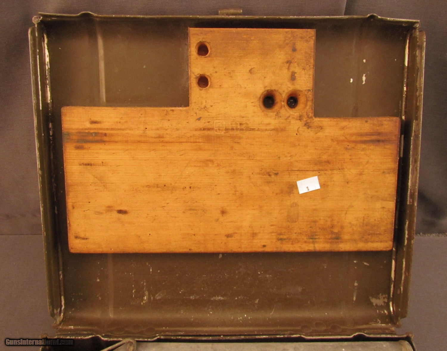Description: This is a metal cased set of tools consisting of: a large rectangular metal oil can, wood-handled screwdriver, pliers, metal punches, hammer, metal file, segmented cleaning rod, two rod tips (jag and bore brush), barrel spanner, two spare bolt carriers, empty leather parts bag, linen patches, and two coiled twine cords. The tools are in very good condition with some minor verdigris on the brass components and on the metal file. There are small handling marks and blemishes throughout and the wooden handles have a commensurate amount of small marks and blemishes. The metal case is painted a dark olive green and has chipped to the underlying metal along the exposed edges and surfaces. This is a fine Swiss machine gun accessory and would make a great addition to a collection or a robust tool kit for every day use as well. SOLD Manufacturer: Swiss Model: 25 |