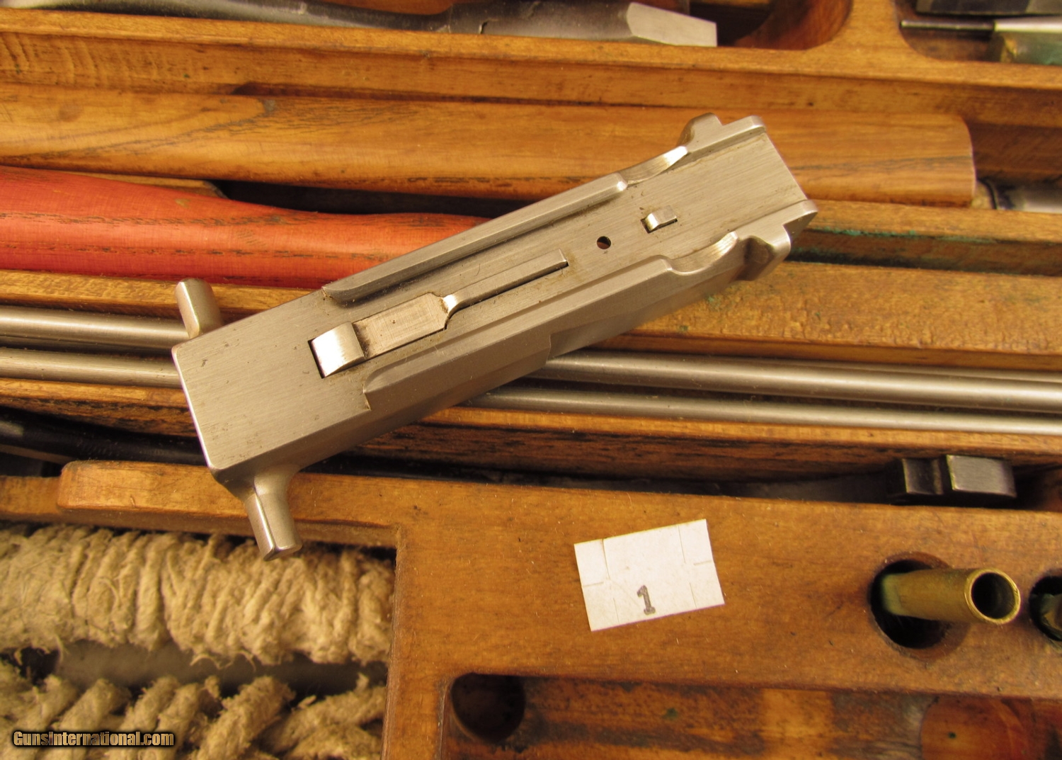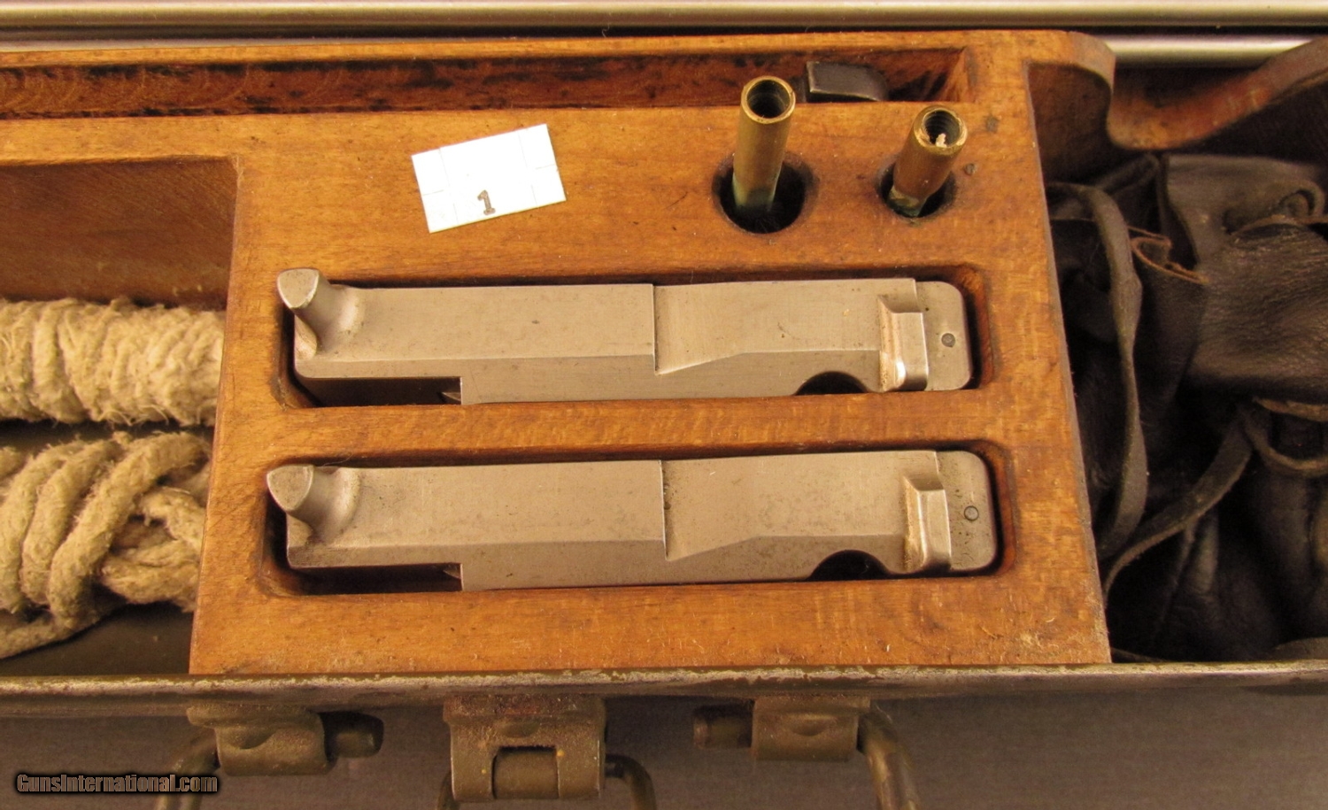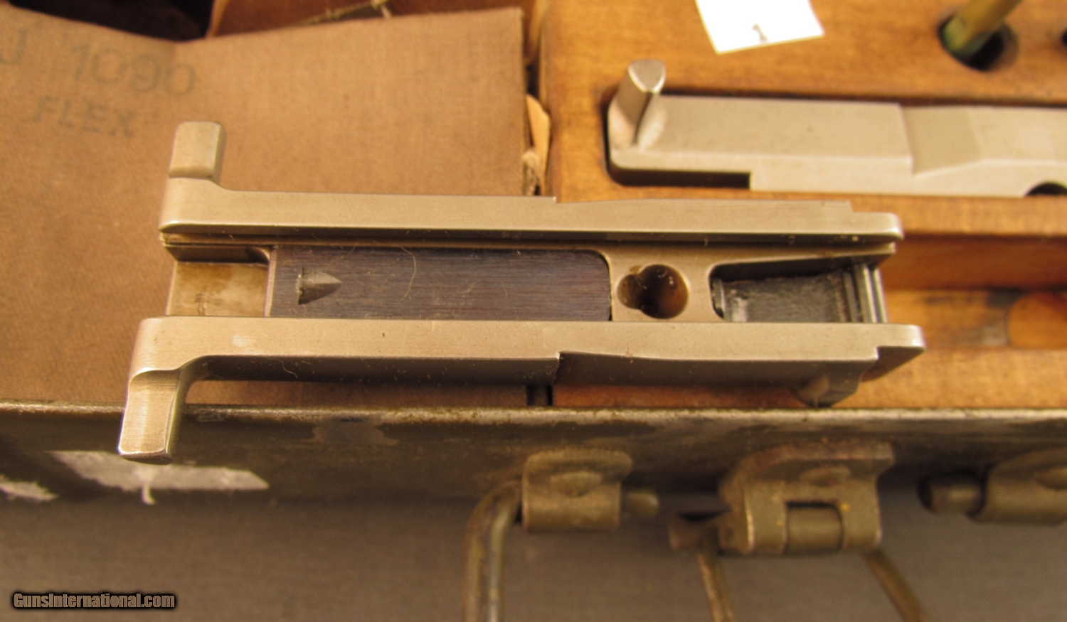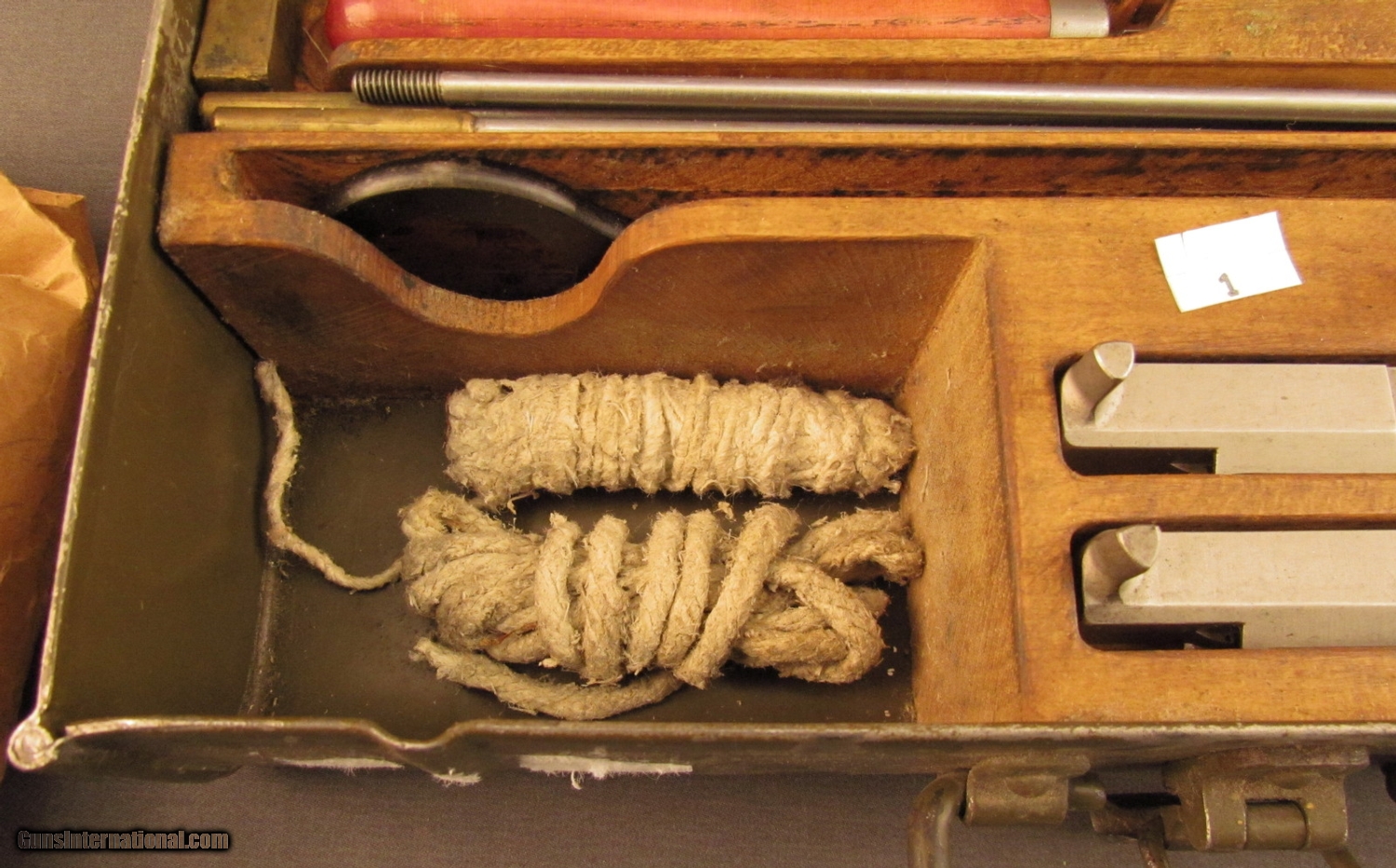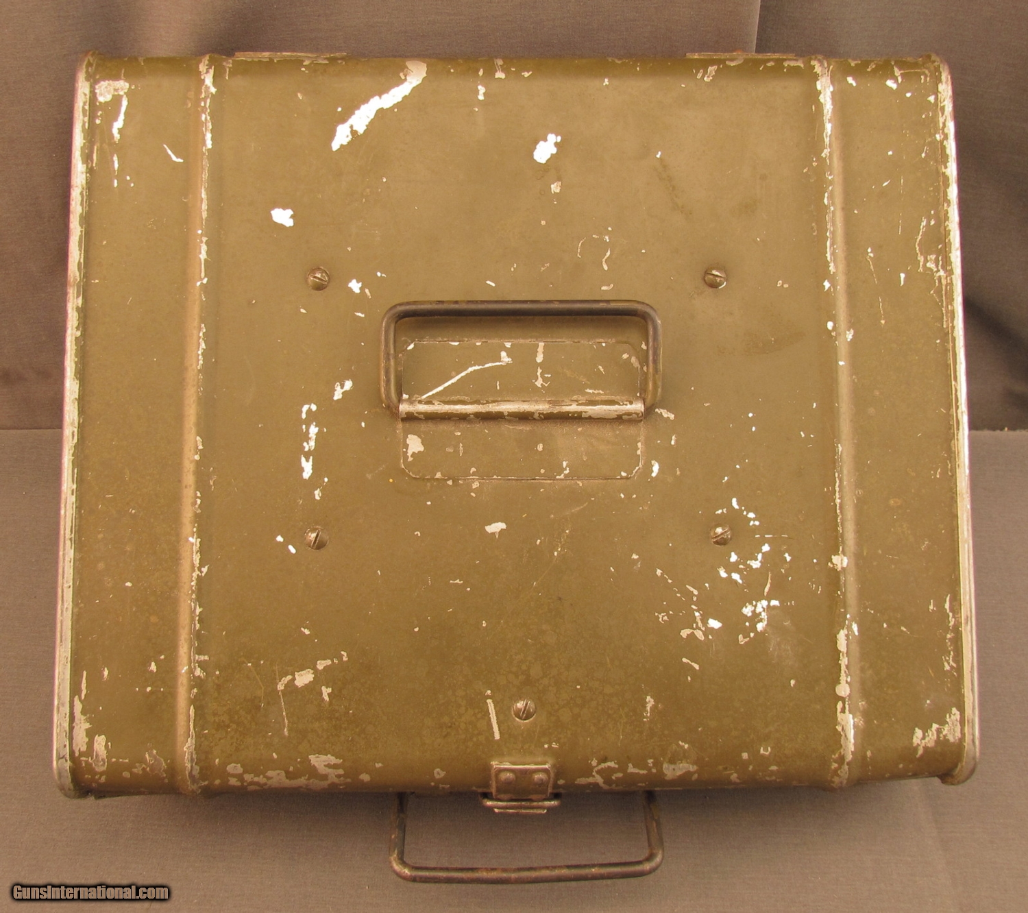 Description: This is a metal cased set of tools consisting of: a large rectangular metal oil can, wood-handled screwdriver, pliers, metal punches, hammer, metal file, segmented cleaning rod, two rod tips (jag and bore brush), barrel spanner, two spare bolt carriers, empty leather parts bag, linen patches, and two coiled twine cords. The tools are in very good condition with some minor verdigris on the brass components and on the metal file. There are small handling marks and blemishes throughout and the wooden handles have a commensurate amount of small marks and blemishes. The metal case is painted a dark olive green and has chipped to the underlying metal along the exposed edges and surfaces. This is a fine Swiss machine gun accessory and would make a great addition to a collection or a robust tool kit for every day use as well. SOLD Manufacturer: Swiss Model: 25 |