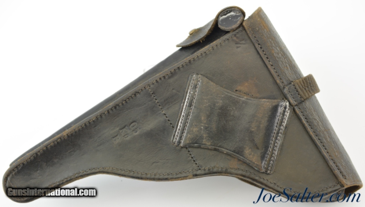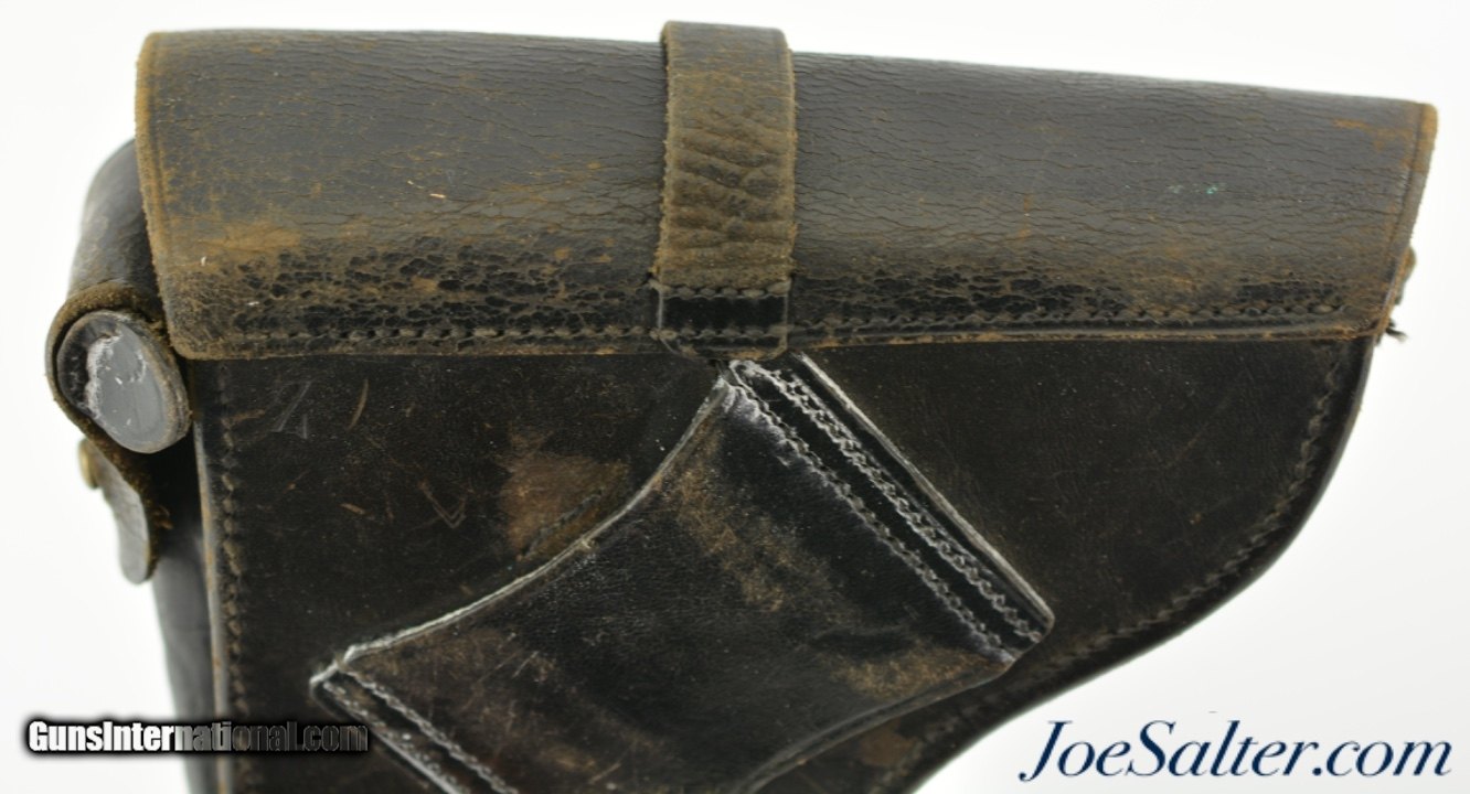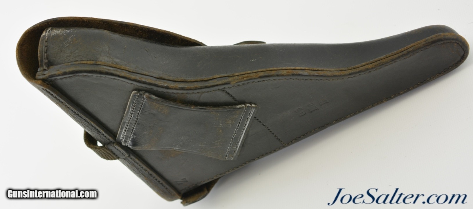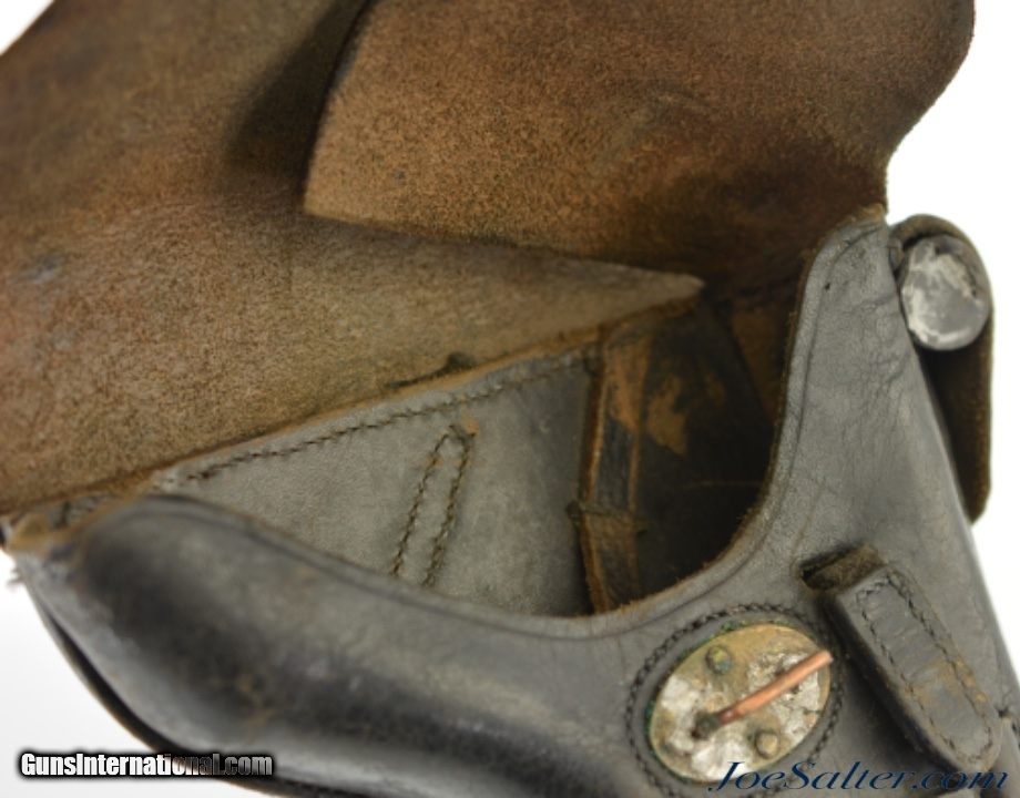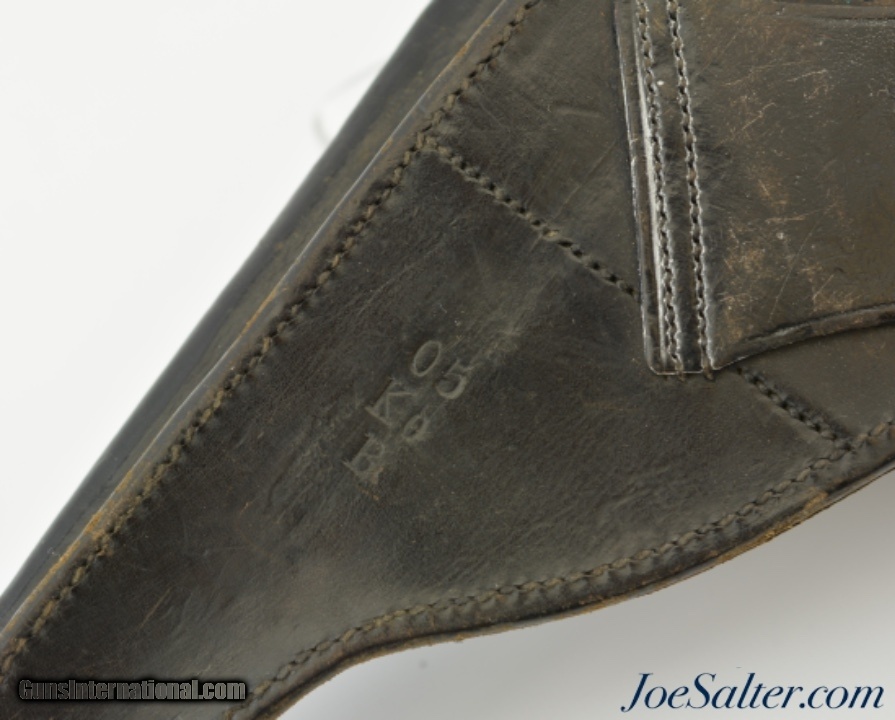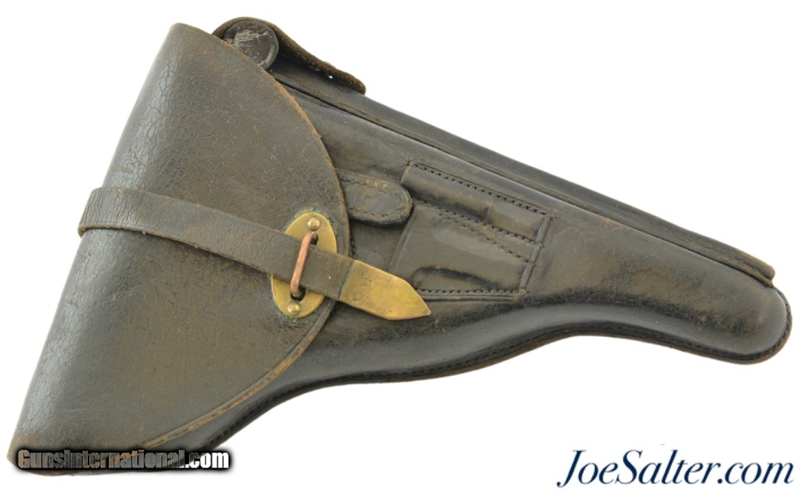 Description: This is a pressed bridle leather holster made to accompany Luger pistols during the 1905 trials held by the Dutch military. They are similar in design to the holsters produced for the 1904 trials with the following improvements: a metal tab on the end of the closure strap; small side pockets for the cleaning rod, take-down tool, and screwdriver; and an interior cover to protect the pistol from rain coming through the cover gap when the angled holster was worn. Page 378 of "Luger Holsters and Accessories" by Eugene Bender, (1992) illustrates an example which is described as extremely rare and the only example then known to exist. We are pleased to offer a previously unknown example of this exceedingly rare holster. The holster bears the requisite issue mark on the reverse: "05/Ko/B"; and "Z" next to the top of the cleaning rod pocket. The leather is in fine condition with light crazing and mild flaking along the flex points but the leather is otherwise in excellent condition, however there is what looks like a somewhat crude military repair to reinforce the closure staple. This rare holster is described and pictured on page 194 of "The Dutch Luger" by Maittens and De Vries, (1994), in which the authors state that these holsters were built in the Netherlands and that "at least one example of the 184 Dutch trial holsters has survived." We are unaware if any additional examples have been found since the publishing of these works but at present it appears that this is only the second or third example to have survived. The overall condition is fine to near excellent; one of the rarest Luger accessories one could ever hope to find. SOLD |