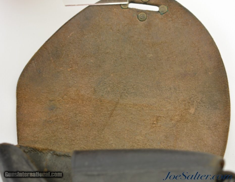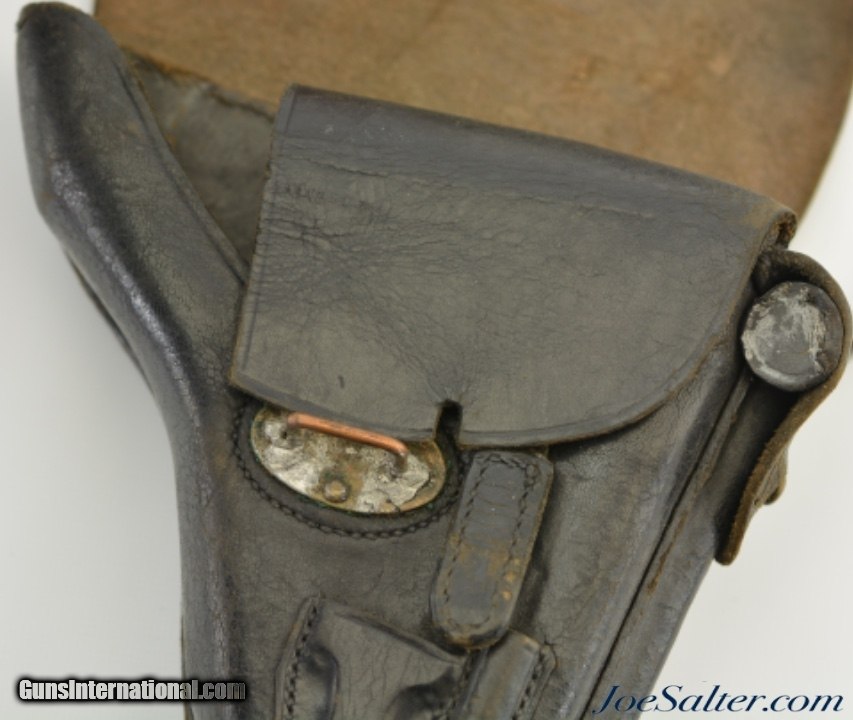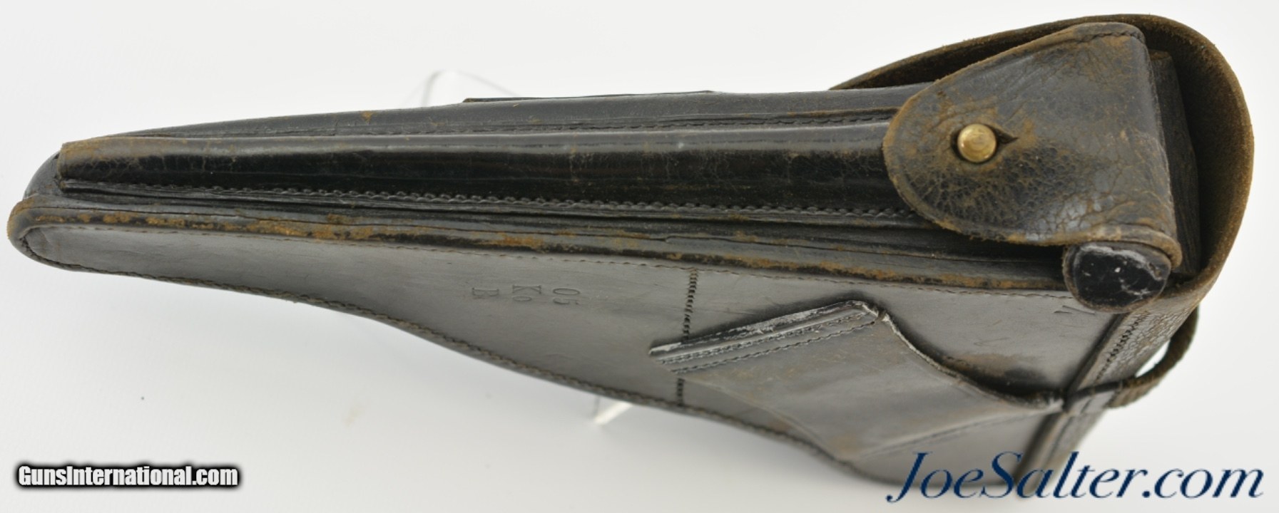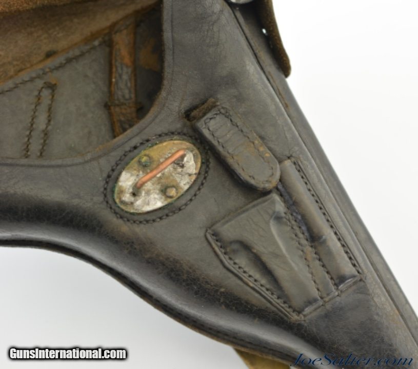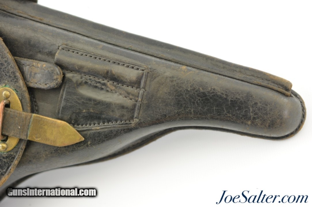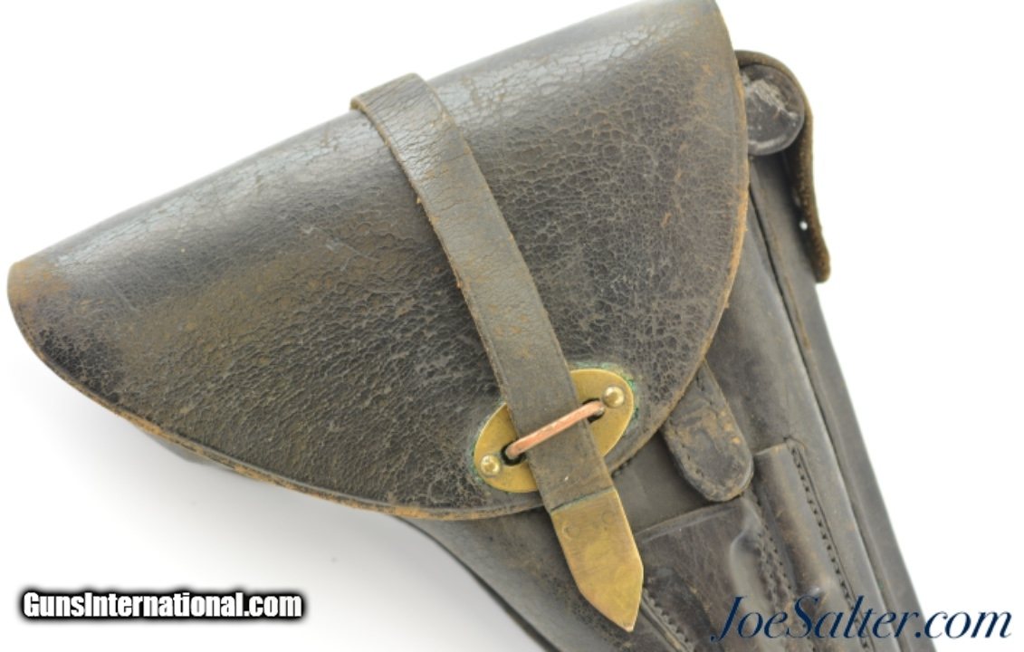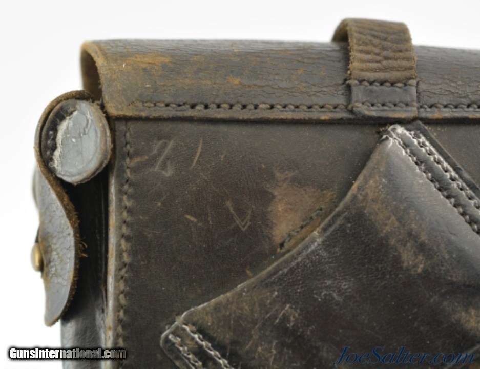 Description: This is a pressed bridle leather holster made to accompany Luger pistols during the 1905 trials held by the Dutch military. They are similar in design to the holsters produced for the 1904 trials with the following improvements: a metal tab on the end of the closure strap; small side pockets for the cleaning rod, take-down tool, and screwdriver; and an interior cover to protect the pistol from rain coming through the cover gap when the angled holster was worn. Page 378 of "Luger Holsters and Accessories" by Eugene Bender, (1992) illustrates an example which is described as extremely rare and the only example then known to exist. We are pleased to offer a previously unknown example of this exceedingly rare holster. The holster bears the requisite issue mark on the reverse: "05/Ko/B"; and "Z" next to the top of the cleaning rod pocket. The leather is in fine condition with light crazing and mild flaking along the flex points but the leather is otherwise in excellent condition, however there is what looks like a somewhat crude military repair to reinforce the closure staple. This rare holster is described and pictured on page 194 of "The Dutch Luger" by Maittens and De Vries, (1994), in which the authors state that these holsters were built in the Netherlands and that "at least one example of the 184 Dutch trial holsters has survived." We are unaware if any additional examples have been found since the publishing of these works but at present it appears that this is only the second or third example to have survived. The overall condition is fine to near excellent; one of the rarest Luger accessories one could ever hope to find. SOLD |