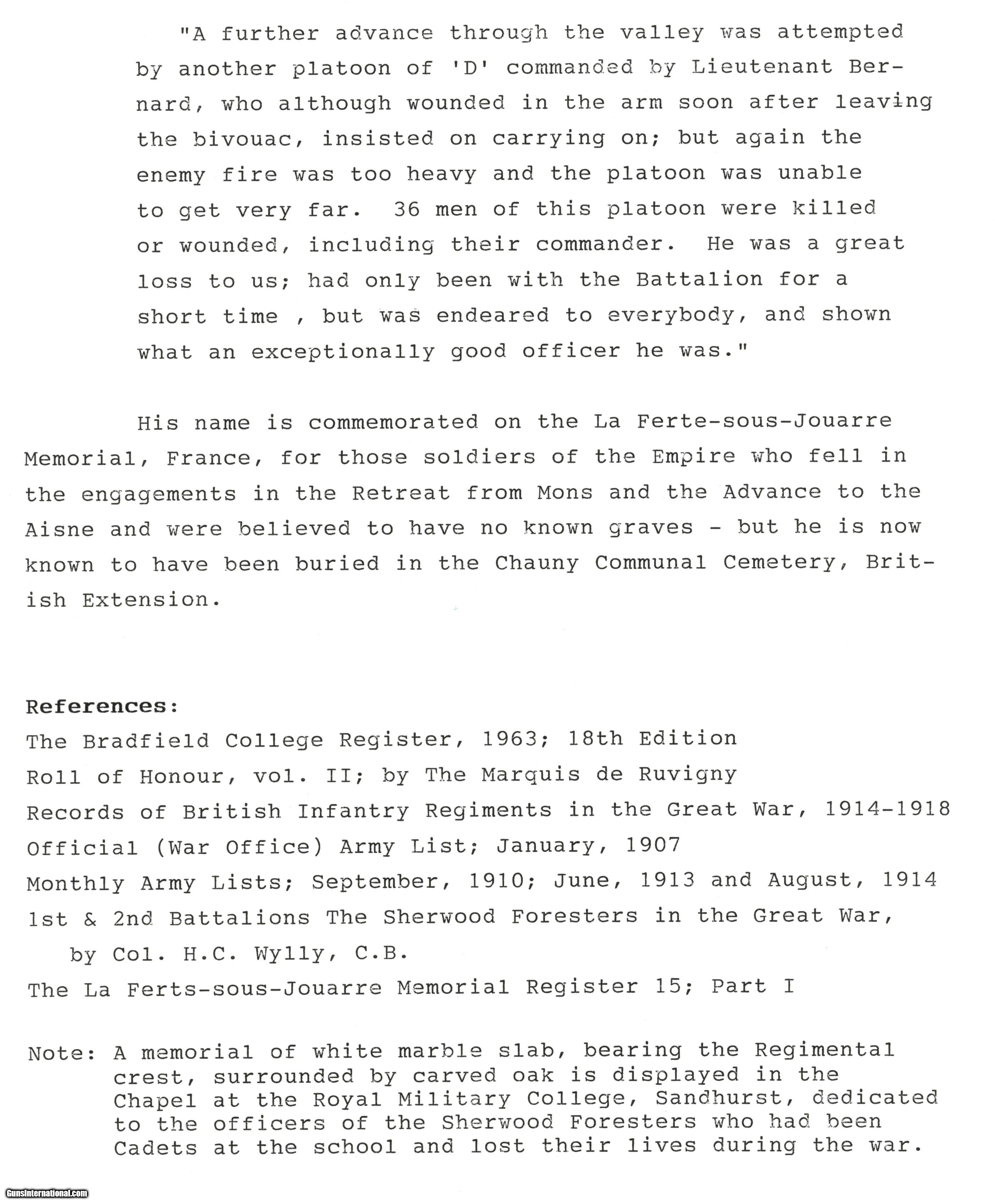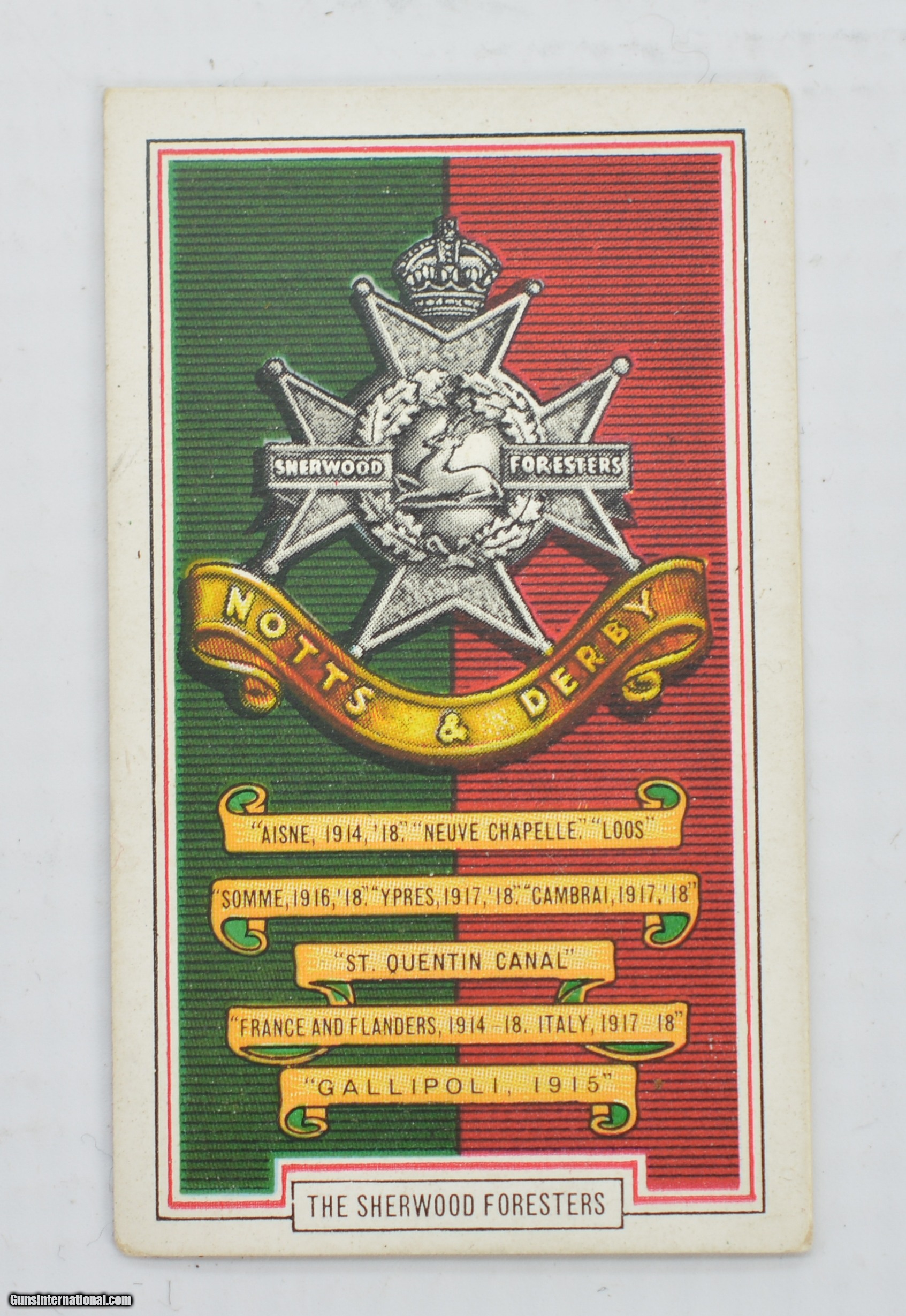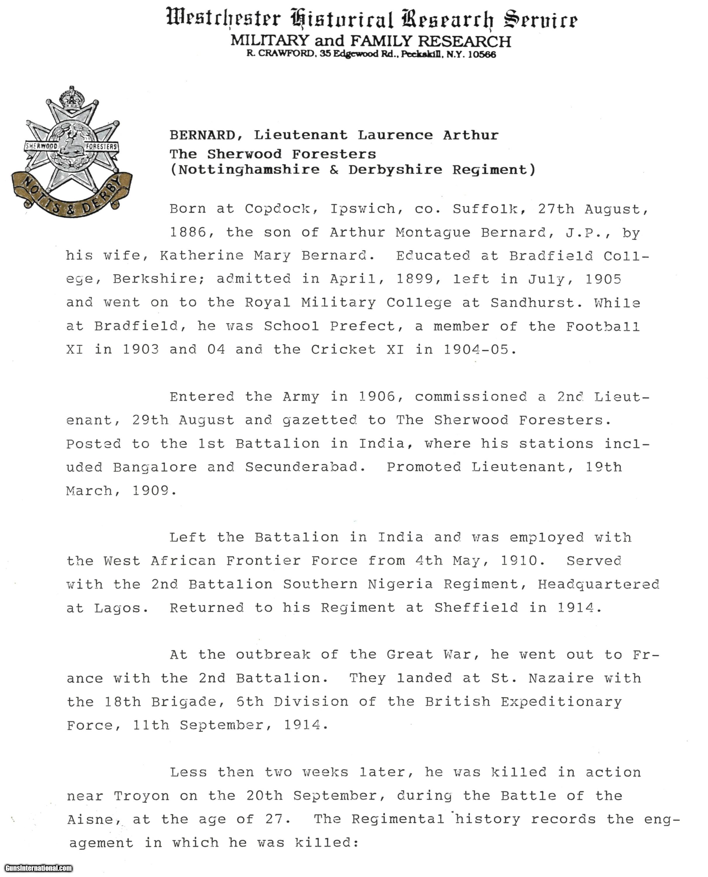 Description: This is an original medal, approved in 1917, engraved on the reverse: “LIEUT’;L.A. BERNARD / NOTTS & DERBY;R." The medal, which is sewn to a 3 1/4" x 5" piece of black velvet-lined card, has a fairly bright bronze patina with a single small area of verdigris on the wreath at 4 o’clock. The red, white, and blue silk wreath has faded with age, and has unravelled slightly at the suspension ring. Below the medal is the small silver rose device denoting that the recipient was under fire during the period of August - November, 1914. A two page biographical paper, conducted by Westchester Historical Research Service, is included, which states that Laurance Arthur Bernard was born on August 27, 1886. He was admitted to Bradfield College, Berkshire, in 1899, and was a School Prefect, as well as on both the football and cricket teams. In 1905 he enrolled at the Royal Military College, Sandhurst, and entered the Army as a 2nd Lieutenant the following year, gazetted to the Nottingham & Derbyshire Regiment (The Sherwood Foresters). He served with the 1st Battalion in India (Bangalore, Secunderabad, and other stations), and was promoted to Lieutenant in March of 1909. He left India for Africa in 1910 and served in the 2nd Battalion, Southern Nigeria Regiment, West African Field Force, but returned to the “Notts & Derbys" at Sheffield in 1914, as an officer in the 2nd Battalion. He landed at St. Nazaire on September 11, 1914, as part of the 18th Brigade, 6th Division, BEF, and was killed 9 days later at Troyon. The regimental history records: “A further advance through the valley was attempted by another platoon of ‘D’ commanded by Lieutenant Bernard, who although wounded in the arm soon after leaving the bivouac, insisted on carrying on; but again the enemy fire was too heavy and the platoon was unable to get very far. 36 men of this platoon were killed or wounded, including their commander. He was a great loss to us; had only been with the Battalion for a short time, but was endeared to everybody, and shown what an exceptionally good officer he was." - (“1st & 2nd Battalions The Sherwood Foresters in the Great War" by Col. H.C. Wylly, C.B.; 1925) Also included is a small tobacco card which depicts the regimental badge of the Nottingham & Derbyshire Regiment. This is a poignant piece of WW1 memorabilia, posthumously awarded to a promising young officer, cut down in his prime SOLD Manufacturer: British Model: Medal |