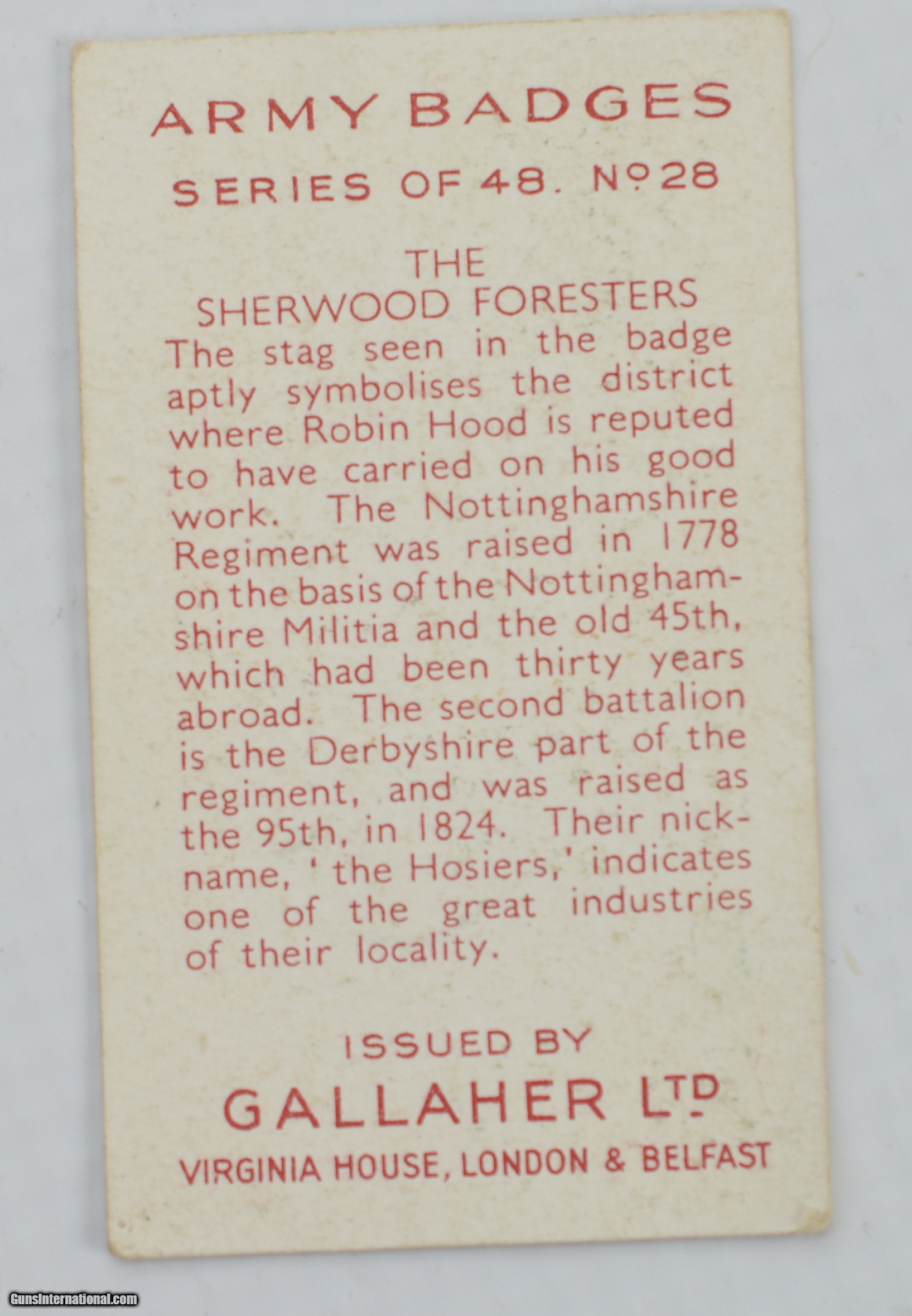 Description: This is an original medal, approved in 1917, engraved on the reverse: “LIEUT’;L.A. BERNARD / NOTTS & DERBY;R." The medal, which is sewn to a 3 1/4" x 5" piece of black velvet-lined card, has a fairly bright bronze patina with a single small area of verdigris on the wreath at 4 o’clock. The red, white, and blue silk wreath has faded with age, and has unravelled slightly at the suspension ring. Below the medal is the small silver rose device denoting that the recipient was under fire during the period of August - November, 1914. A two page biographical paper, conducted by Westchester Historical Research Service, is included, which states that Laurance Arthur Bernard was born on August 27, 1886. He was admitted to Bradfield College, Berkshire, in 1899, and was a School Prefect, as well as on both the football and cricket teams. In 1905 he enrolled at the Royal Military College, Sandhurst, and entered the Army as a 2nd Lieutenant the following year, gazetted to the Nottingham & Derbyshire Regiment (The Sherwood Foresters). He served with the 1st Battalion in India (Bangalore, Secunderabad, and other stations), and was promoted to Lieutenant in March of 1909. He left India for Africa in 1910 and served in the 2nd Battalion, Southern Nigeria Regiment, West African Field Force, but returned to the “Notts & Derbys" at Sheffield in 1914, as an officer in the 2nd Battalion. He landed at St. Nazaire on September 11, 1914, as part of the 18th Brigade, 6th Division, BEF, and was killed 9 days later at Troyon. The regimental history records: “A further advance through the valley was attempted by another platoon of ‘D’ commanded by Lieutenant Bernard, who although wounded in the arm soon after leaving the bivouac, insisted on carrying on; but again the enemy fire was too heavy and the platoon was unable to get very far. 36 men of this platoon were killed or wounded, including their commander. He was a great loss to us; had only been with the Battalion for a short time, but was endeared to everybody, and shown what an exceptionally good officer he was." - (“1st & 2nd Battalions The Sherwood Foresters in the Great War" by Col. H.C. Wylly, C.B.; 1925) Also included is a small tobacco card which depicts the regimental badge of the Nottingham & Derbyshire Regiment. This is a poignant piece of WW1 memorabilia, posthumously awarded to a promising young officer, cut down in his prime SOLD Manufacturer: British Model: Medal |