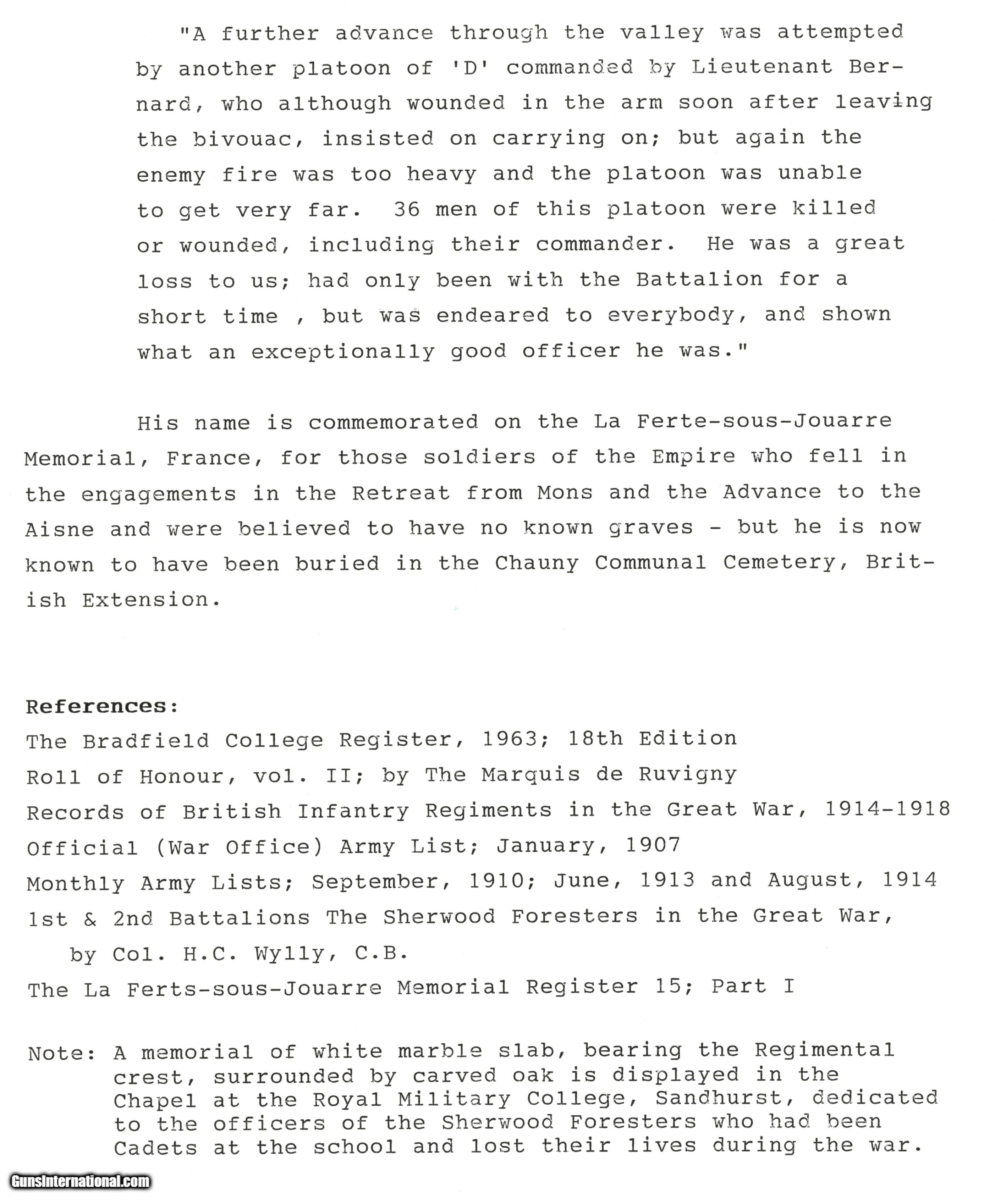 Description: This is an original medal, approved in 1917, engraved on the reverse: “LIEUT’;L.A. BERNARD / NOTTS & DERBY;R." The medal, which is sewn to a 3 1/4" x 5" piece of black velvet-lined card, has a fairly bright bronze patina with a single small area of verdigris on the wreath at 4 o’clock. The red, white, and blue silk wreath has faded with age, and has unravelled slightly at the suspension ring. Below the medal is the small silver rose device denoting that the recipient was under fire during the period of August - November, 1914. A two page biographical paper, conducted by Westchester Historical Research Service, is included, which states that Laurance Arthur Bernard was born on August 27, 1886. He was admitted to Bradfield College, Berkshire, in 1899, and was a School Prefect, as well as on both the football and cricket teams. In 1905 he enrolled at the Royal Military College, Sandhurst, and entered the Army as a 2nd Lieutenant the following year, gazetted to the Nottingham & Derbyshire Regiment (The Sherwood Foresters). He served with the 1st Battalion in India (Bangalore, Secunderabad, and other stations), and was promoted to Lieutenant in March of 1909. He left India for Africa in 1910 and served in the 2nd Battalion, Southern Nigeria Regiment, West African Field Force, but returned to the “Notts & Derbys" at Sheffield in 1914, as an officer in the 2nd Battalion. He landed at St. Nazaire on September 11, 1914, as part of the 18th Brigade, 6th Division, BEF, and was killed 9 days later at Troyon. The regimental history records: “A further advance through the valley was attempted by another platoon of ‘D’ commanded by Lieutenant Bernard, who although wounded in the arm soon after leaving the bivouac, insisted on carrying on; but again the enemy fire was too heavy and the platoon was unable to get very far. 36 men of this platoon were killed or wounded, including their commander. He was a great loss to us; had only been with the Battalion for a short time, but was endeared to everybody, and shown what an exceptionally good officer he was." - (“1st & 2nd Battalions The Sherwood Foresters in the Great War" by Col. H.C. Wylly, C.B.; 1925) Also included is a small tobacco card which depicts the regimental badge of the Nottingham & Derbyshire Regiment. This is a poignant piece of WW1 memorabilia, posthumously awarded to a promising young officer, cut down in his prime SOLD Manufacturer: British Model: Medal |