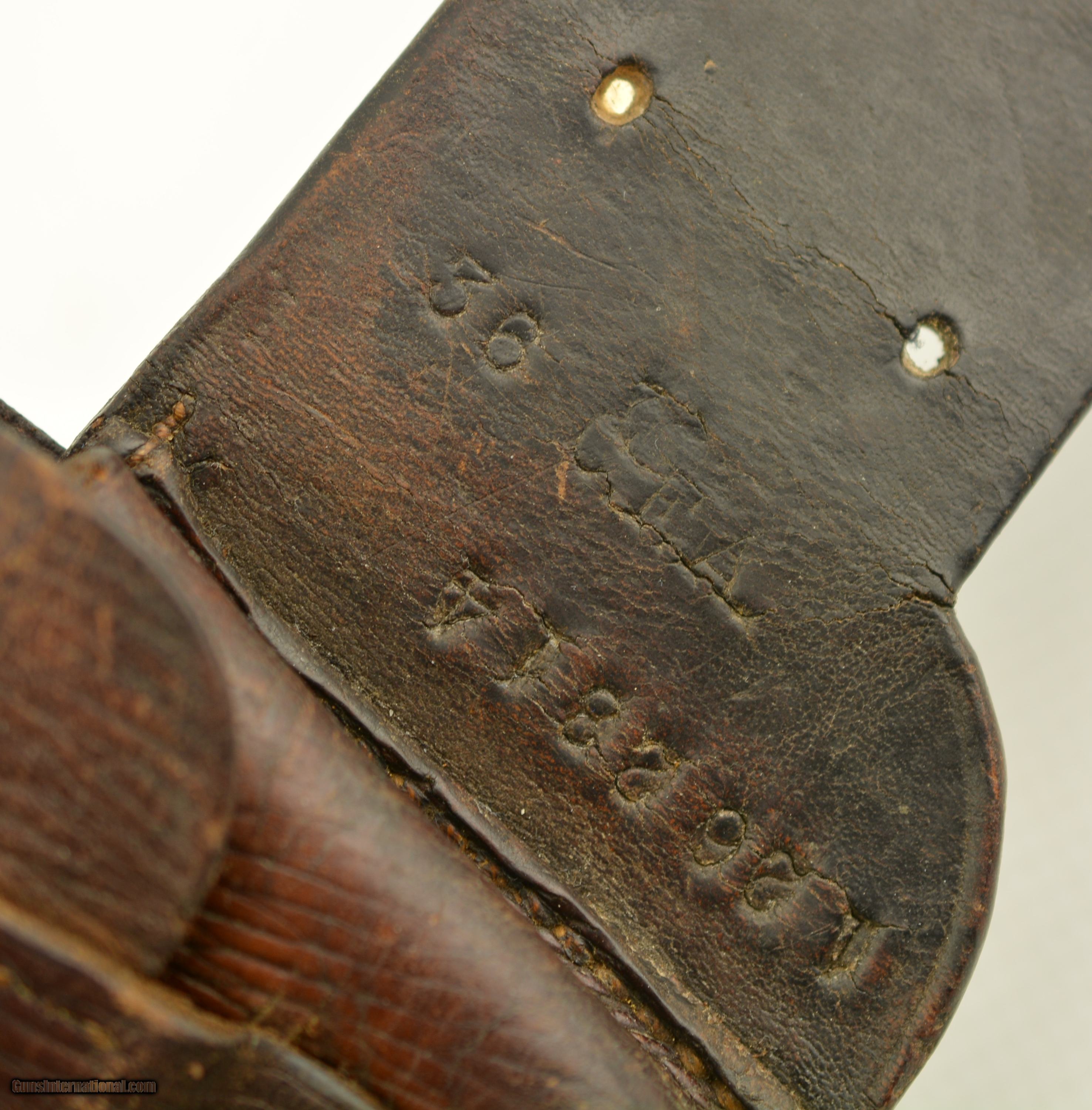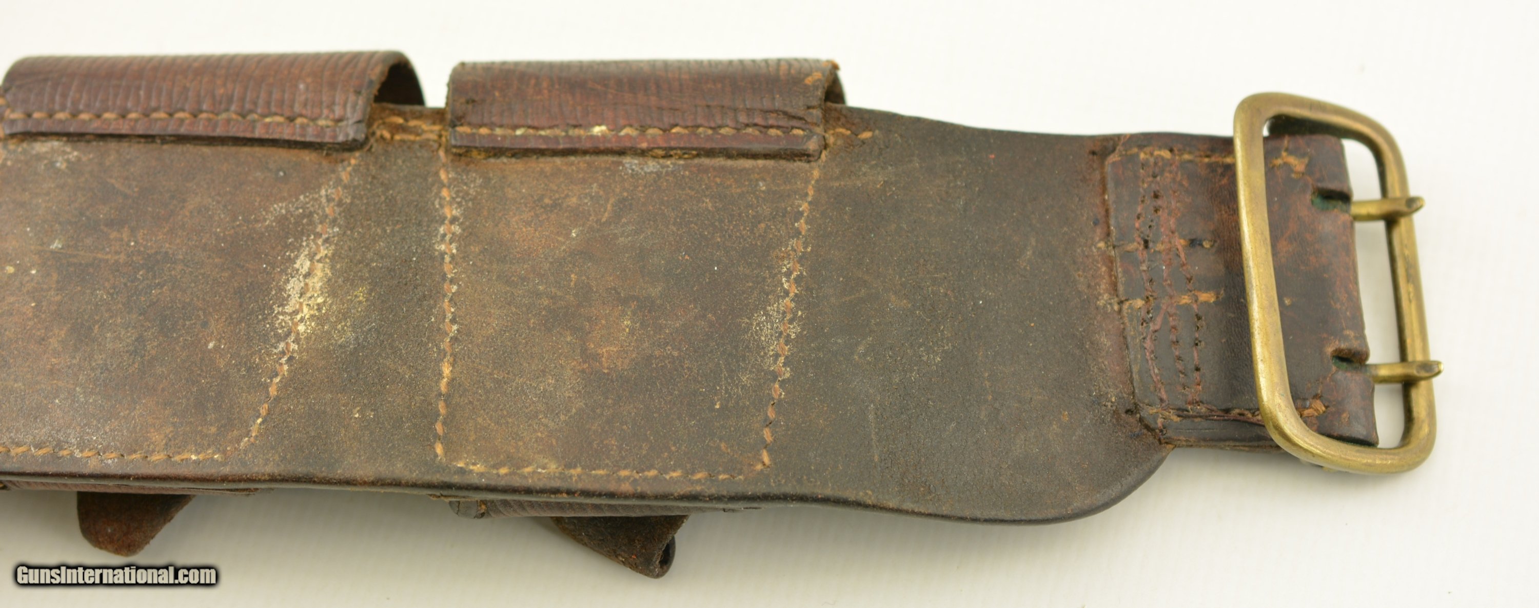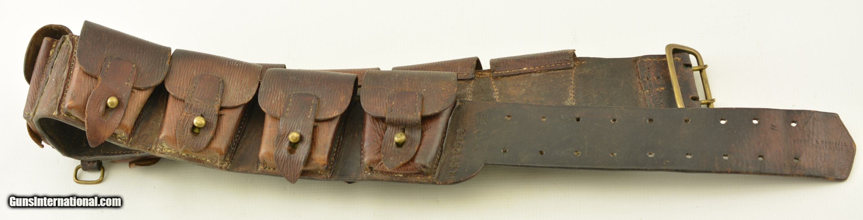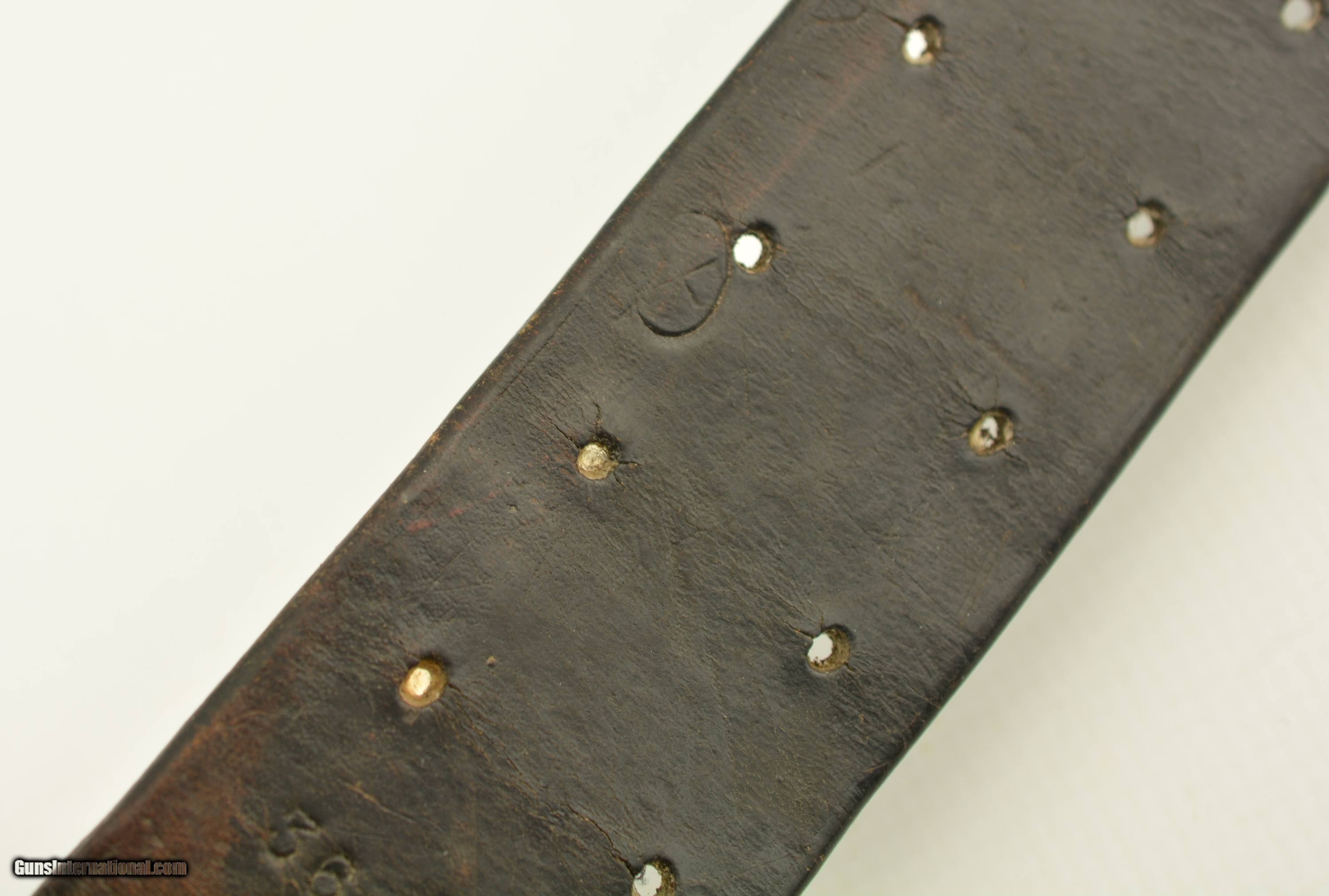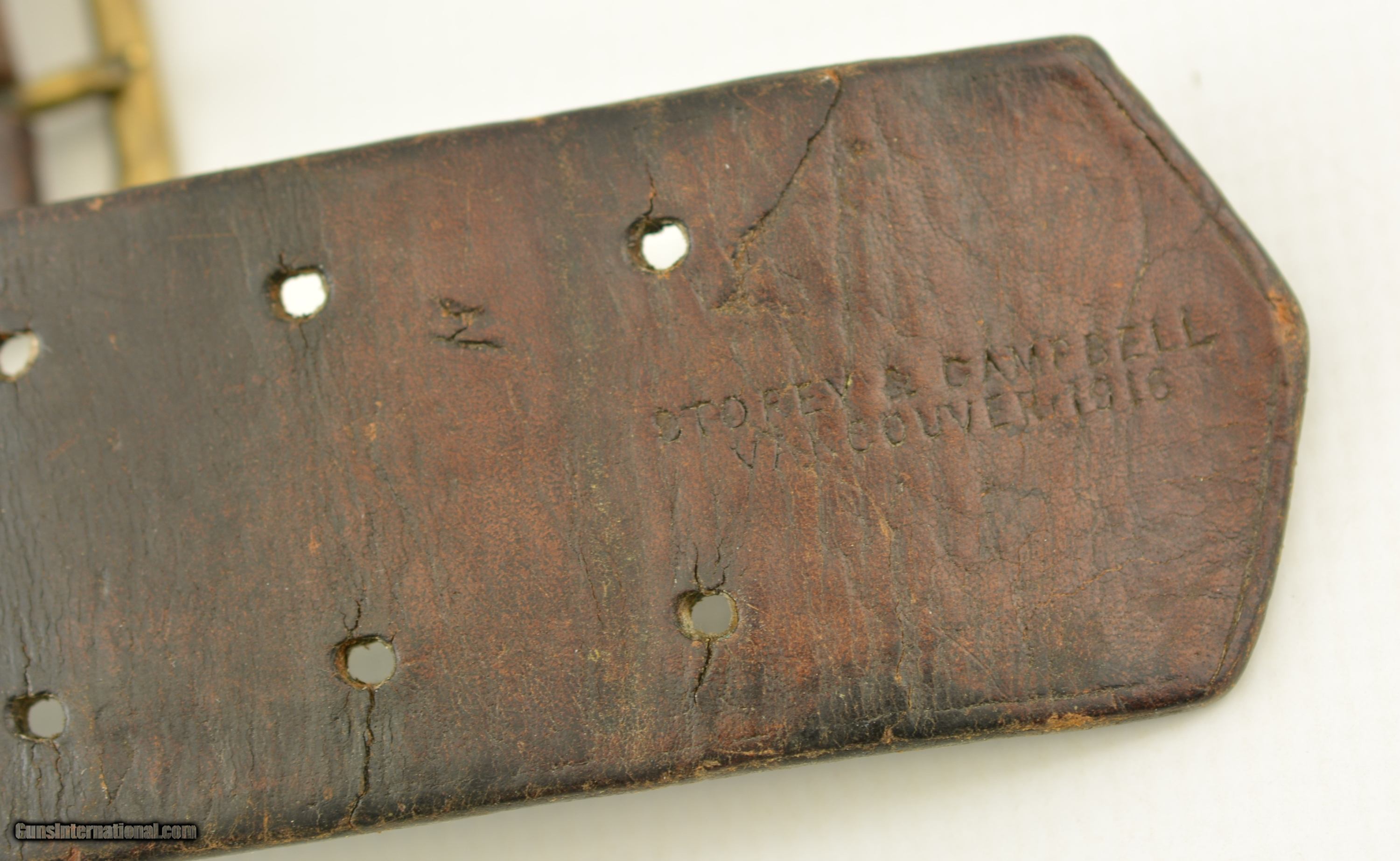 Description: This is a 1916 dated, 10 pocket belt, built by Storey & Campbell of Vancouver, BC. The brown leather is in fine shape, supple and flexible, and with only minor scuffs and crazing, and is unit marked at the base of the tag-end: “36 CFA". The inner side of the belt is hand-carved with a soldier’s name as well: “D McD / 36"; and a unit registration number is stamped on the tag-end near the unit marking: “1262314"; with large “C (double arrow)" mark along the edge of the tab. The brass fittings are intact and have a mild ochre tarnish throughout. The 36th Canadian Field Artillery was based in Sydney, NS at the northern end of Cape Breton Island, and the registration number is listed as issued to a Percy Hilard Smith Thompson, who was attached to the Canadian 4th Division Ammunition Sub-Park. This is a splendid piece of Canadian military equipment, and would make a great addition to a WW1 Canadian collection. SOLD Manufacturer: Canadian Model: Cartridge Belt |