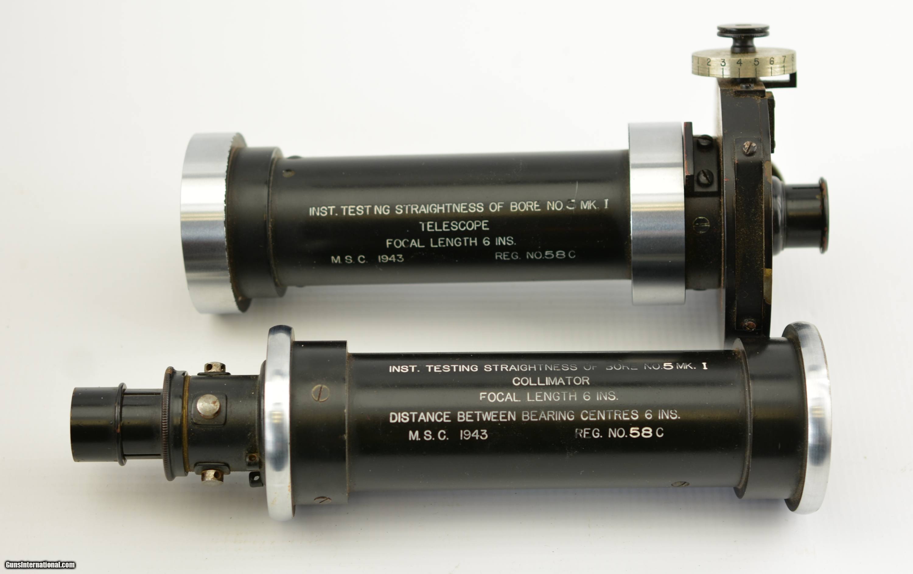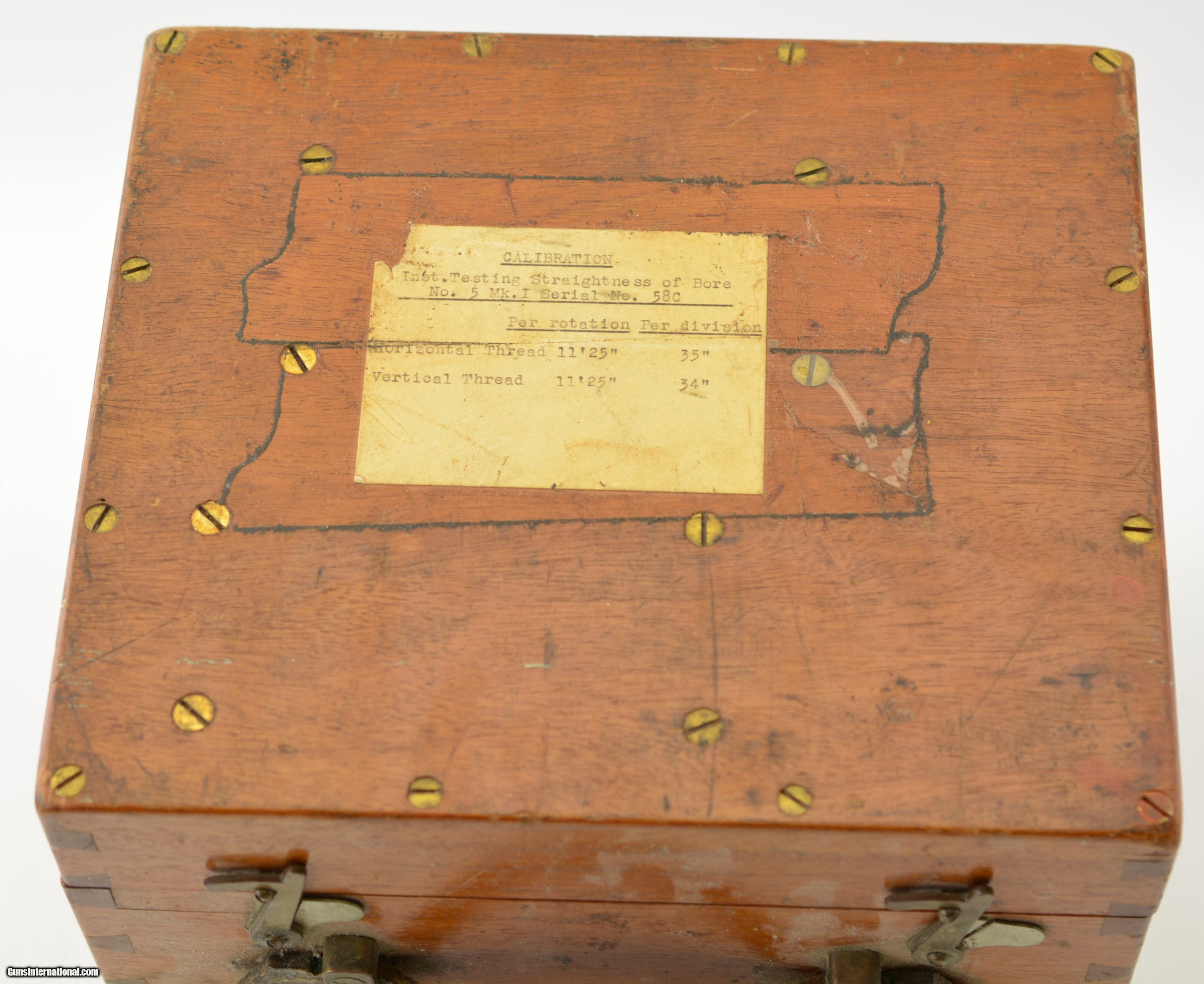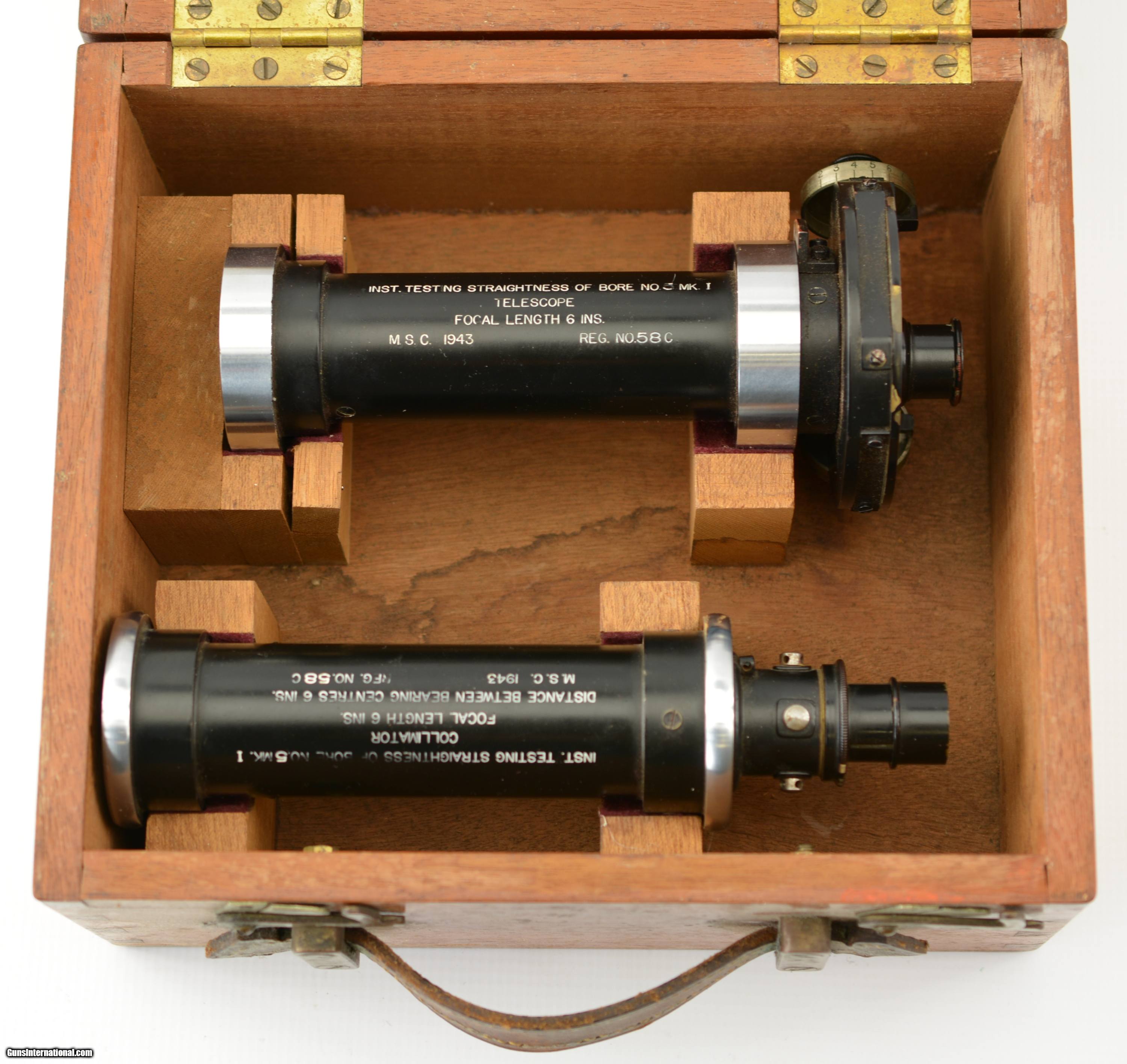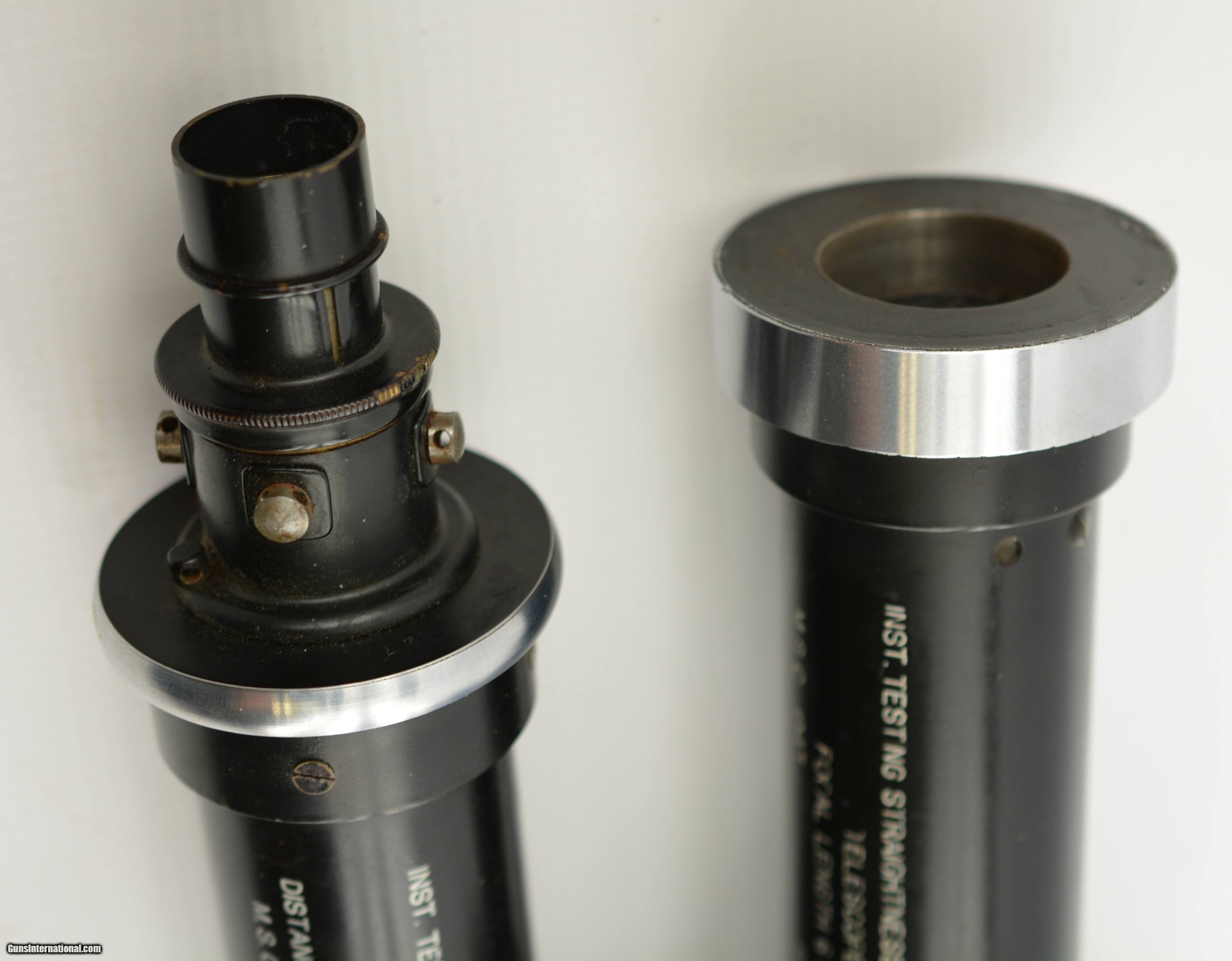 Description: This is a two-piece gauge consisting of a 7 1/2" long telescopic section with eye-piece, adjustable along both x and y axis. The markings on the tube read: “INST. TESTING STRAIGHTNESS OF BORE NO. 5 MK. I / TELESCOPE / FOCAL LENGTH 6 INS. / M.S.C. 1943 REG. NO. 58C". The optics are good and have a very fine crosshair reticle. The second piece is a collimator section with removeable frosted glass lens cover, and has the following markings on the tube: “INST. TESTING STRAIGHTNESS OF BORE NO. 5 MK. I / COLLIMATOR / FOCAL LENGTHS 6 INS. / DISTANCE BETWEEN BEARING CENTRES 6 INS. / M.S.C. 1943 REG. NO. 58C". The optics are still quite clear and a second crosshair reticle is present. The components are housed in an original wooden case with felt-lined keepers, and brass screws. Calibration instructions are taped to the lid, and the original leather handle is intact. Old stenciled markings are visible, but no longer legible on one side. This is a neat WW2 optical instrument, and is in excellent condition overall. SOLD Manufacturer: British Model: Gauge |