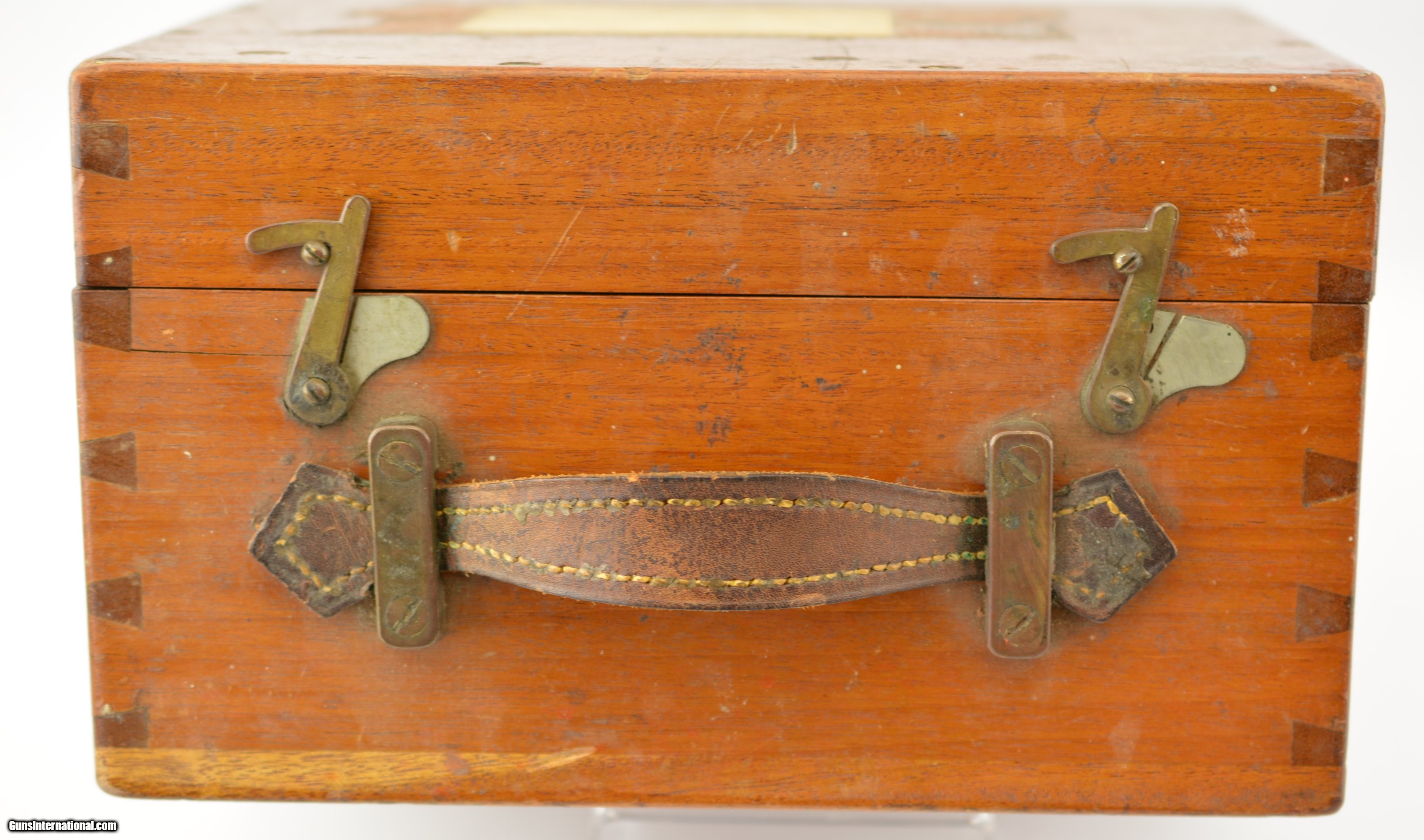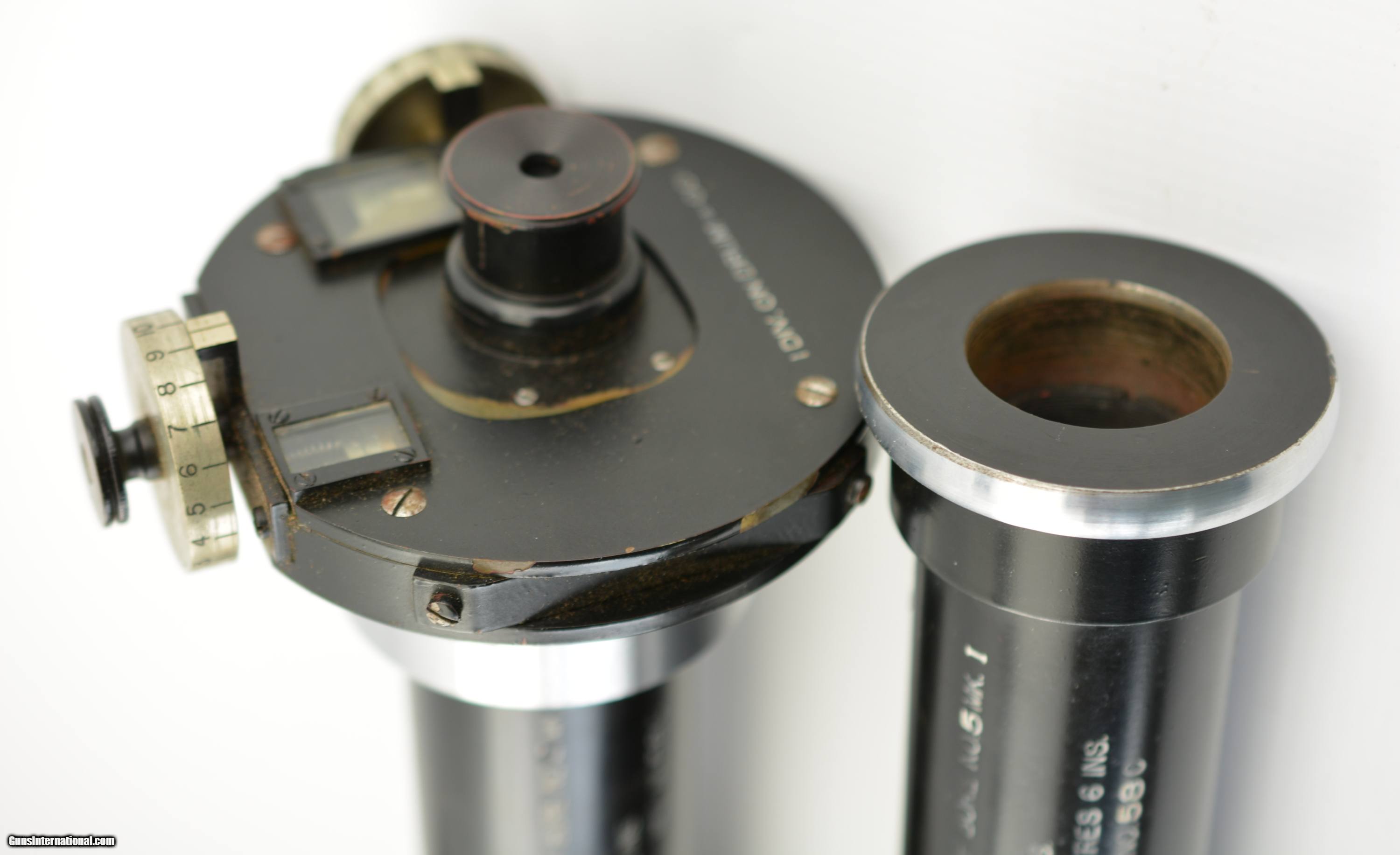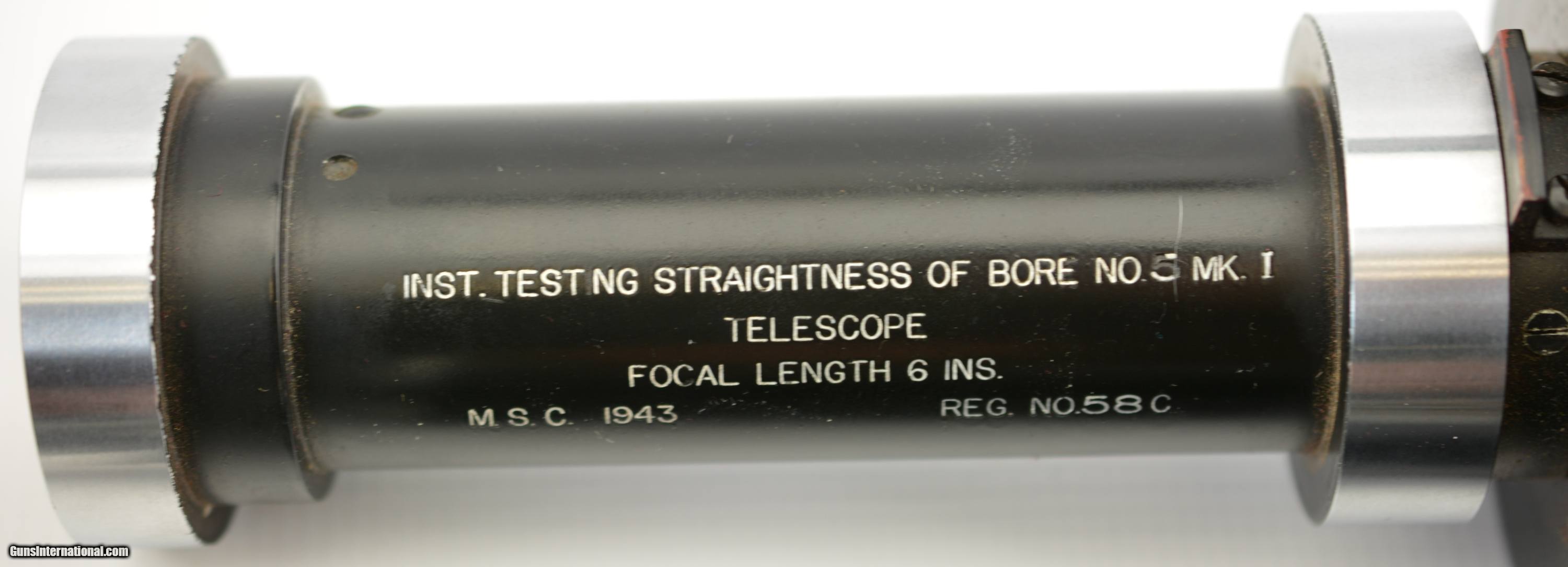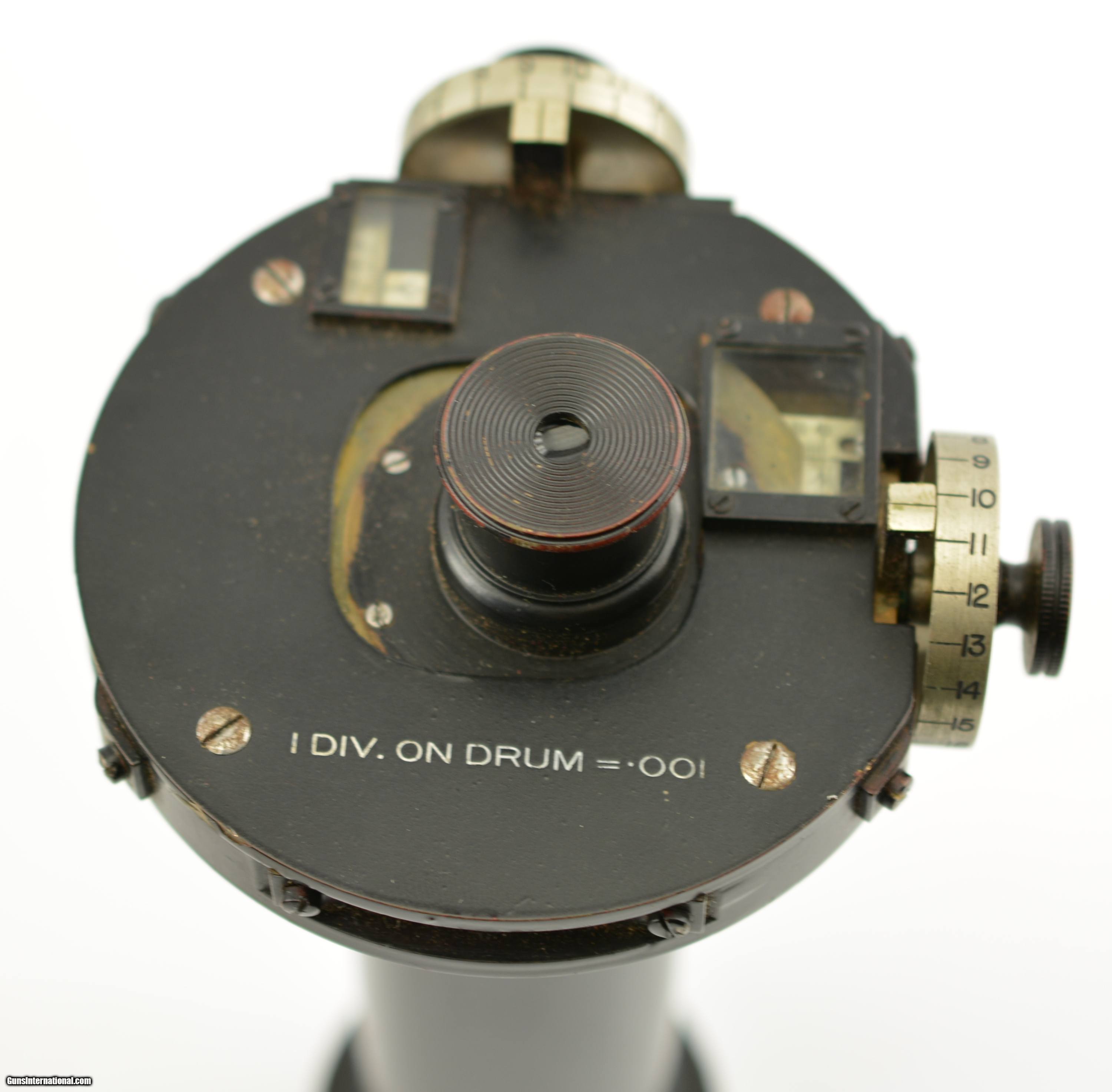 Description: This is a two-piece gauge consisting of a 7 1/2" long telescopic section with eye-piece, adjustable along both x and y axis. The markings on the tube read: “INST. TESTING STRAIGHTNESS OF BORE NO. 5 MK. I / TELESCOPE / FOCAL LENGTH 6 INS. / M.S.C. 1943 REG. NO. 58C". The optics are good and have a very fine crosshair reticle. The second piece is a collimator section with removeable frosted glass lens cover, and has the following markings on the tube: “INST. TESTING STRAIGHTNESS OF BORE NO. 5 MK. I / COLLIMATOR / FOCAL LENGTHS 6 INS. / DISTANCE BETWEEN BEARING CENTRES 6 INS. / M.S.C. 1943 REG. NO. 58C". The optics are still quite clear and a second crosshair reticle is present. The components are housed in an original wooden case with felt-lined keepers, and brass screws. Calibration instructions are taped to the lid, and the original leather handle is intact. Old stenciled markings are visible, but no longer legible on one side. This is a neat WW2 optical instrument, and is in excellent condition overall. SOLD Manufacturer: British Model: Gauge |