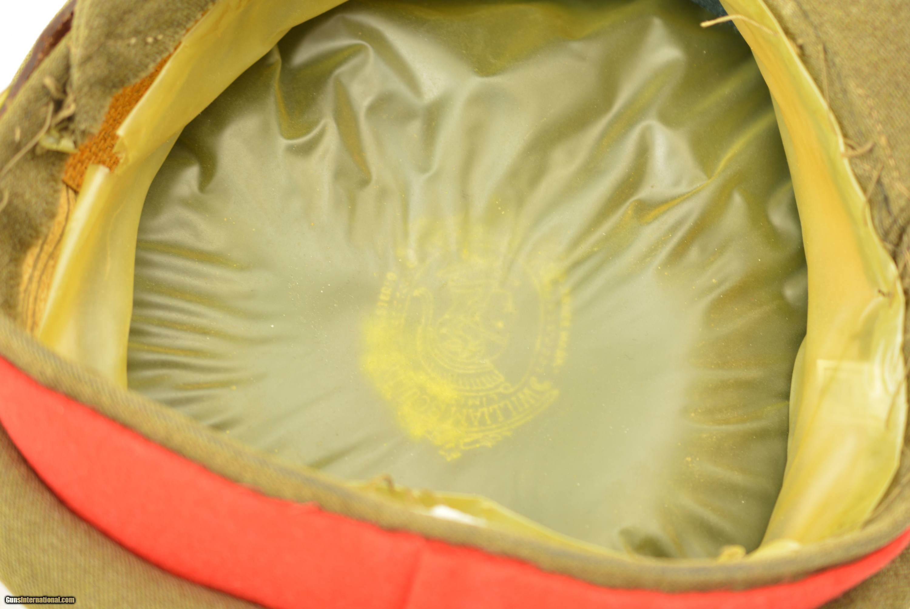 Description: This is a Canadian Army Brigadier Staff officers peaked cap. Made in Montreal by William Scully this high quality wool cap has a plastic lining, leather strap with Canadian brass buttons and a bullion badge on the front. It is a size 7 3/8". Condition is very good to excellent with only some very minor light marks on the wool visor and lose stitching that has let go where the plastic lining attaches to the hat. A fantastic example of a classic World War II hat. SOLD Manufacturer: Canadian Model: Uniform |