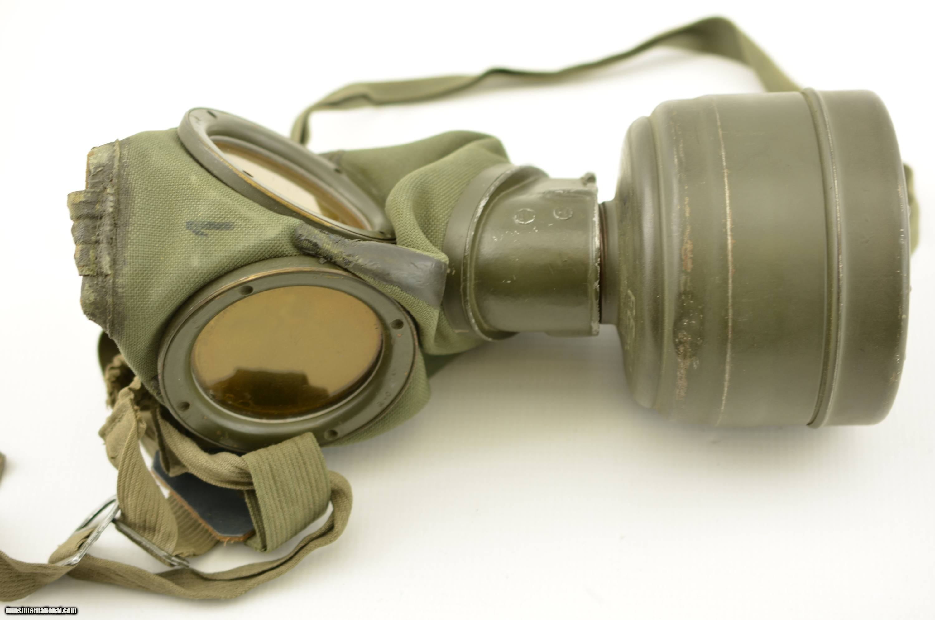 Description: This is a complete mask with green rubberized canvas face covering, round eye-piece lenses, and elastic security straps that wrap around the back. The rubberized cloth is still intact and has stiffened with age. The mask comes with an original metal filter canister, and is housed in the original corrugated, cylindrical metal case with colored eye-piece filters, and carry straps. This is a desirable piece of WW2 Wehrmacht memorabilia, and is in very good-near fine condition overall. SOLD Manufacturer: German Model: Gas Mask |