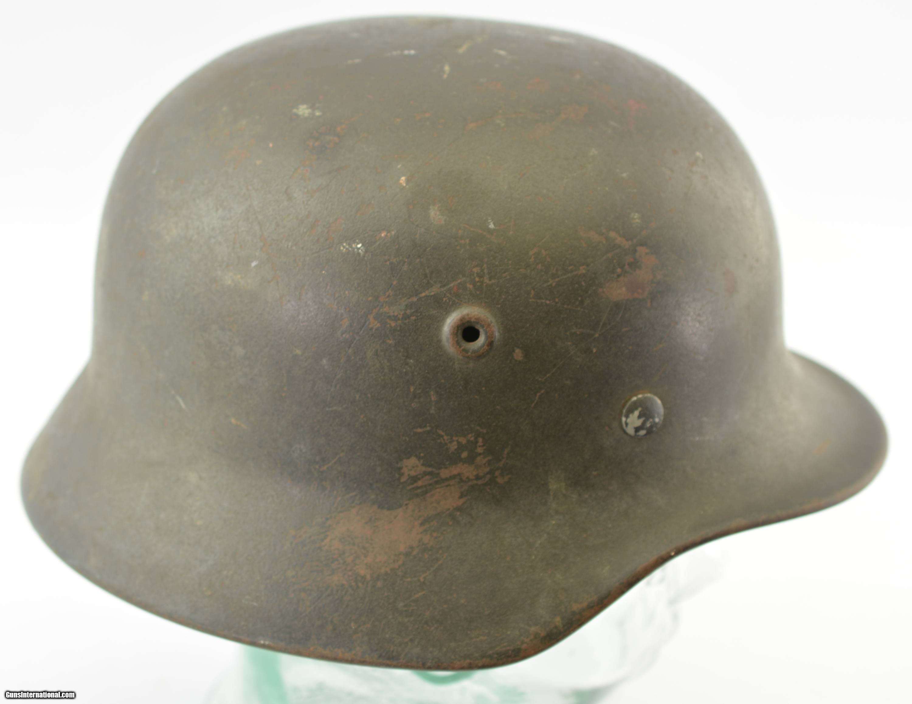 Description: This was a single decal helmet prior to the removal of the Heer Adler on the left side of the crown. The helmet itself retains 80-85% of the original dark green flocked paint finish that has flaked to the underlying brown metal on the crown and along the rolled edge of the visor and neck flare. The interior is lot number marked (“N307") on the back of the neck flare, and the maker is visible, but illegible, on the left side interior. A single area of light surface rust is present on the back of the neck shield. The leather and zinc suspensionis in very good condition with some scuffing and flaking along the bottom edge. The cinch cord is missing from the web, and the chinstrap is present, but broken near the bail on one side. This is a very nice, battle-worn example of a World War II Army Stahlhelm, and would make a very attractive addition to a collection. SOLD Manufacturer: German Model: Helmet |