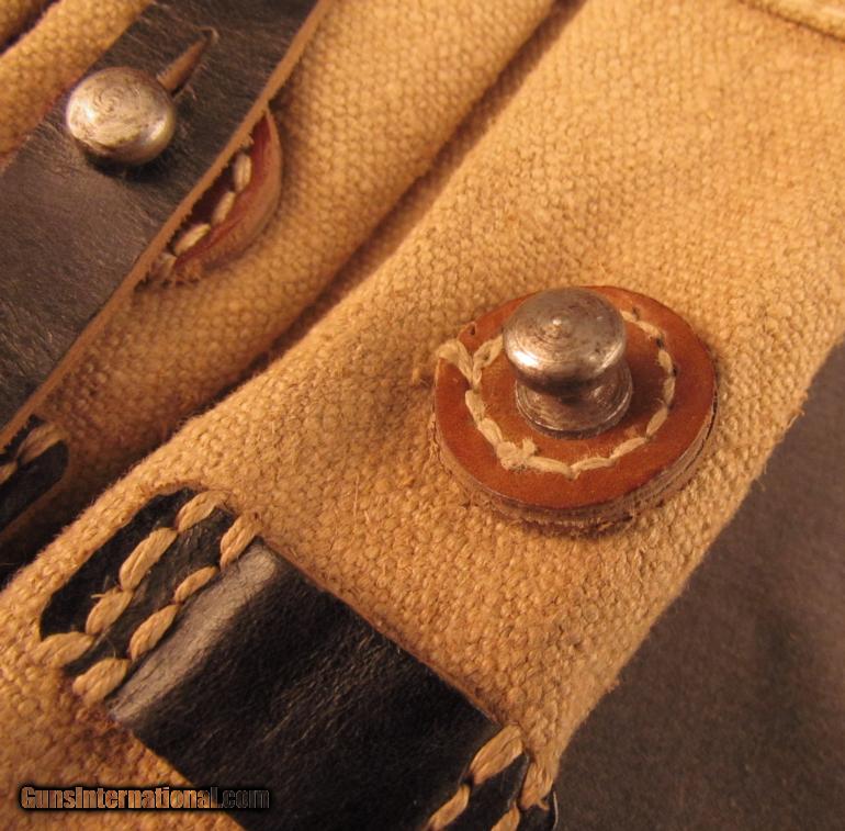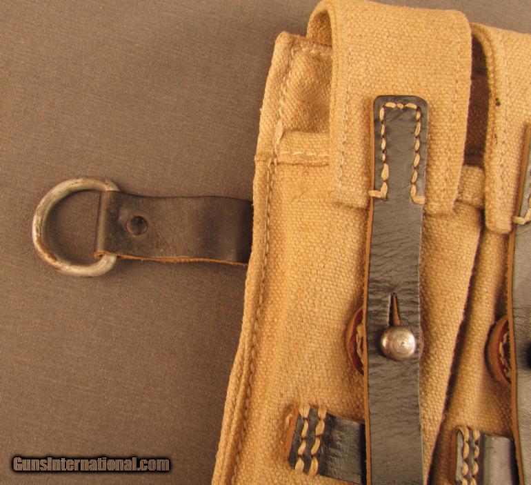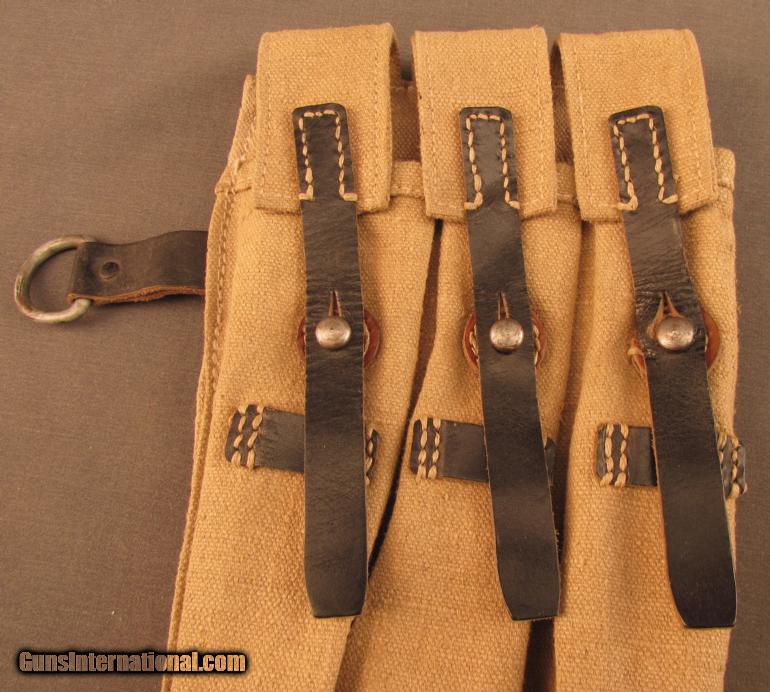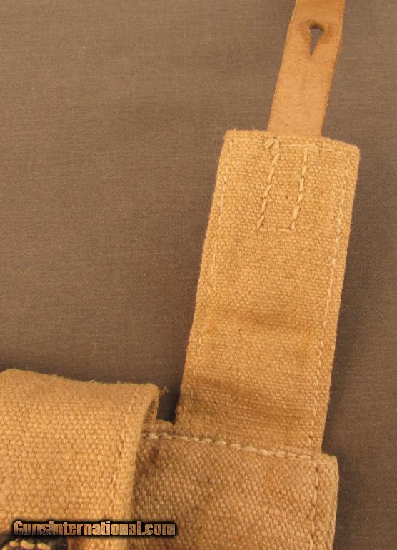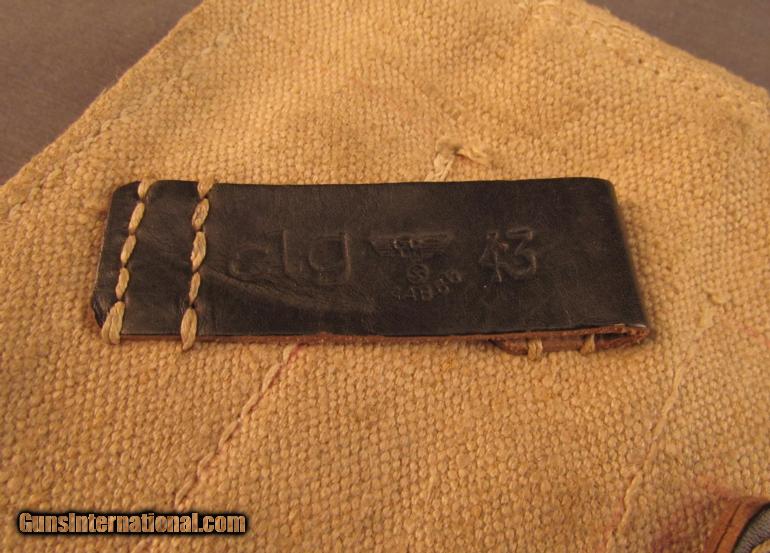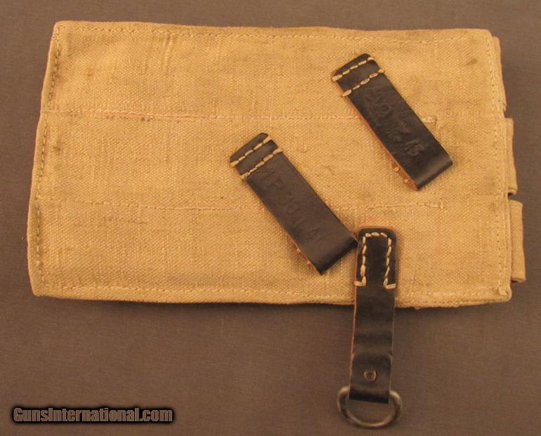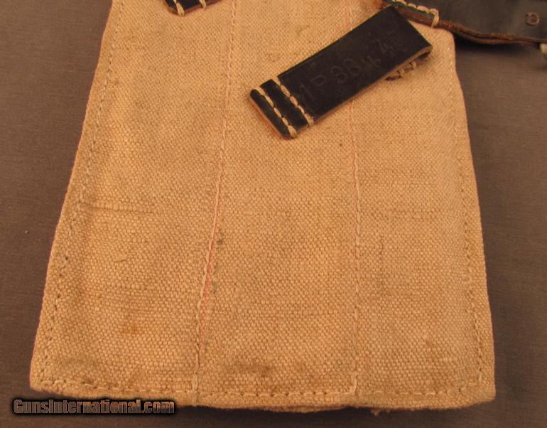 Description: This is an original 1943 dated, third type tan canvas pouch and is the right side pouch of a two-piece set that has a "clg" manufacturer's code and "WaA866" Waffenamt proof on one of the angled belt loops on the back (clg: Ernst Melzig Lederwaren). The canvas is in excellent condition with little evidence of any use and there are only some small spots of mild crazing and flaking on the leather loops and tabs. The heaviest crazing occurs on the Y-harness strap with some further minor discoloration of the D-ring and the white stitching is intact. These pouches are assumed to be intended for tropical use due to the color of the canvas and are sometimes associated with the Afrika Korps but they were issued generally and were also found in use in temperate regions as well. Regardless, this is a hard-to-find original wartime submachine gun magazine pouch and is in excellent overall condition. SOLD Manufacturer: German Model: Magazine Pouch |