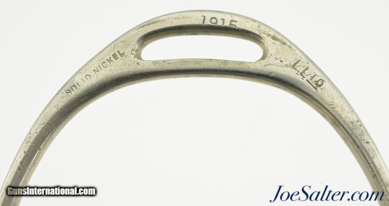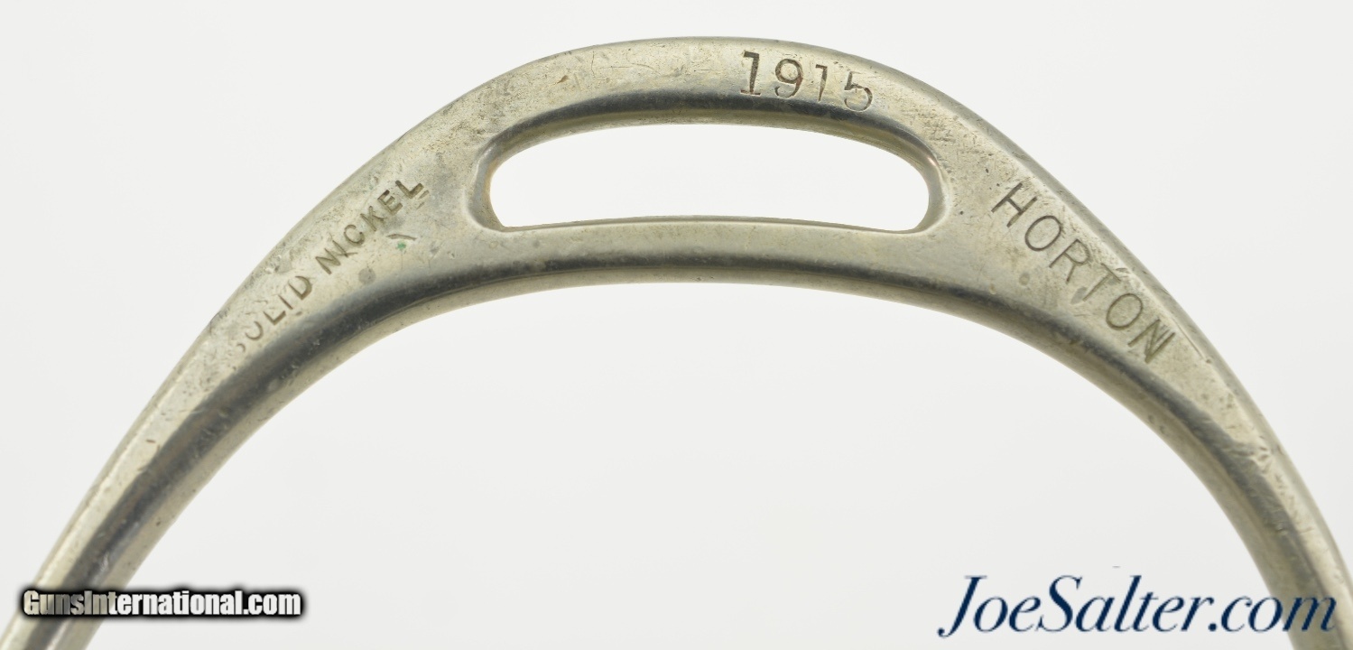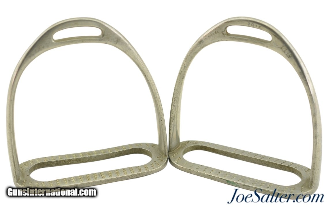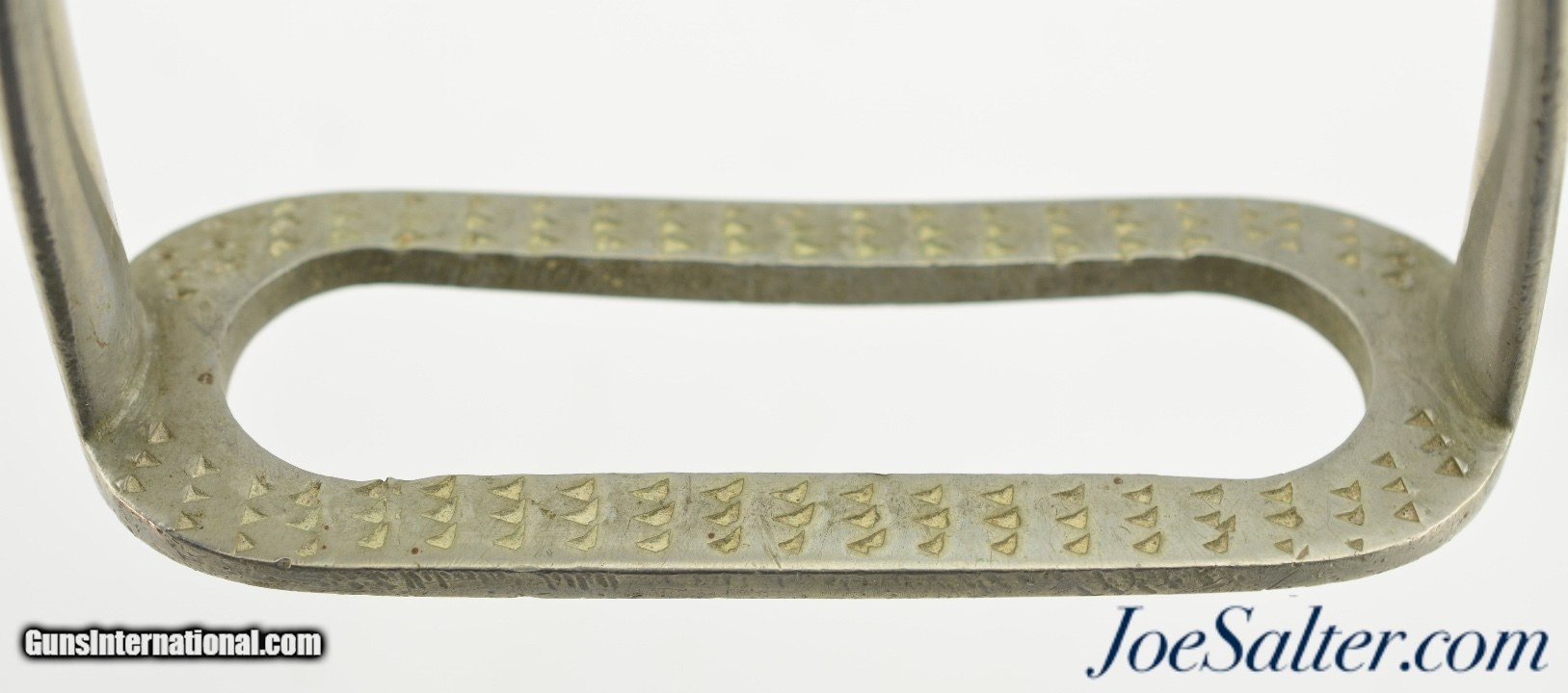 Description: This is a nice pair of WWI Canadian Canadian Expeditionary Force, dated 1915 Stirrups with "C/Broad Arrow", solid nickel Marked "Horton". In very good used condition. SOLD |