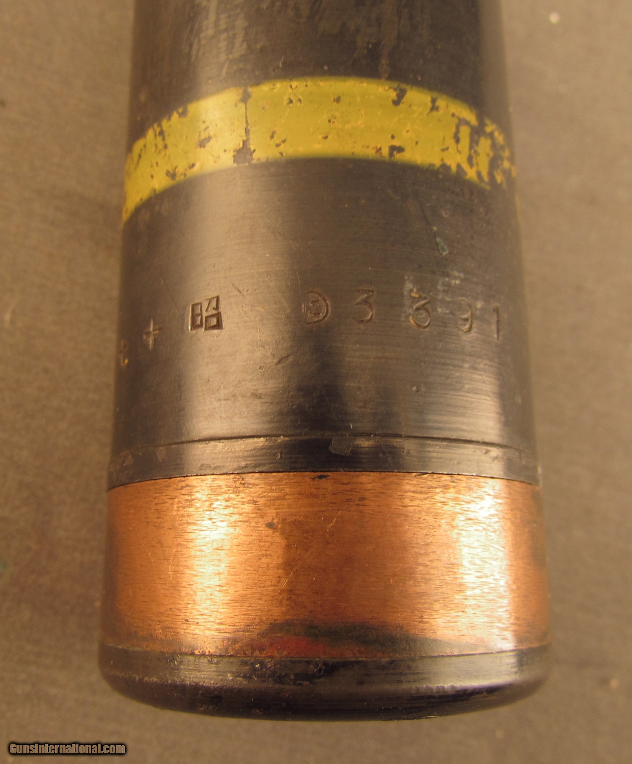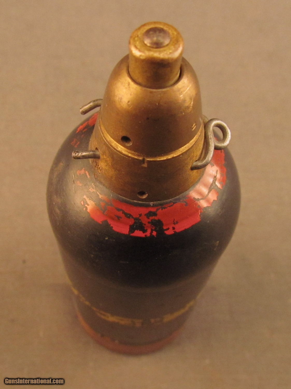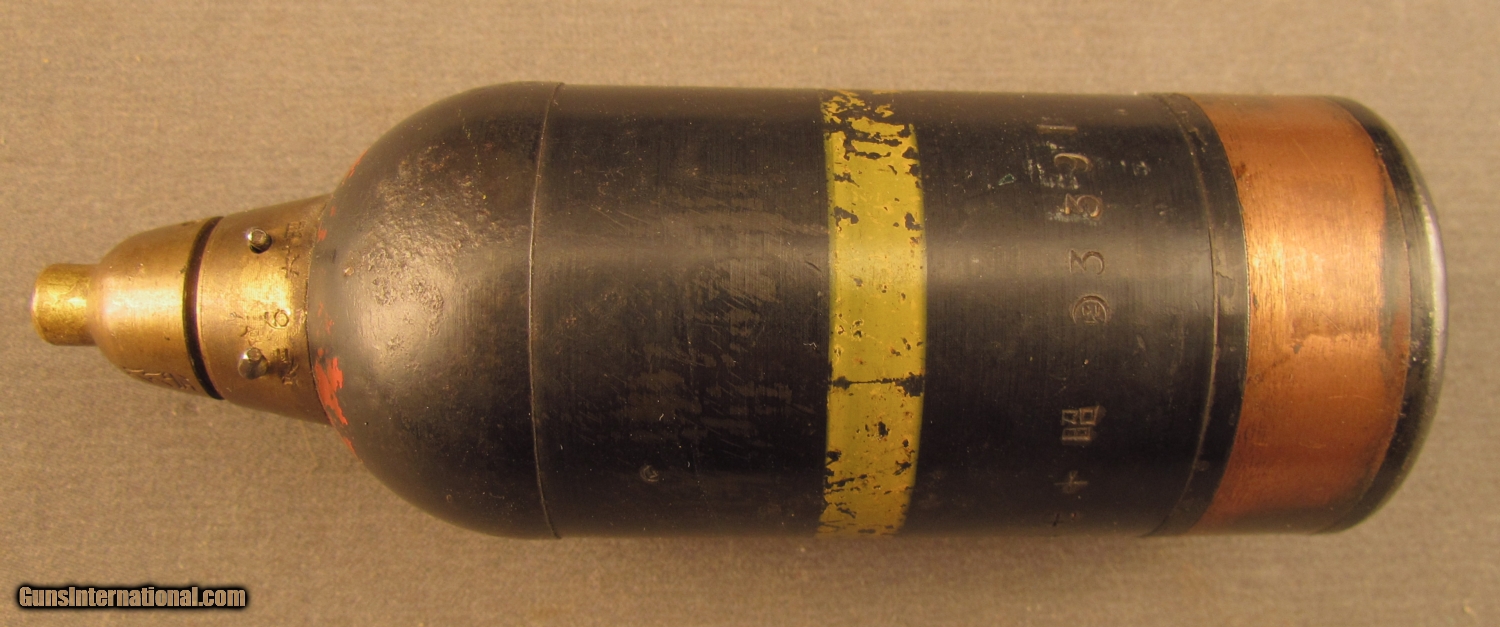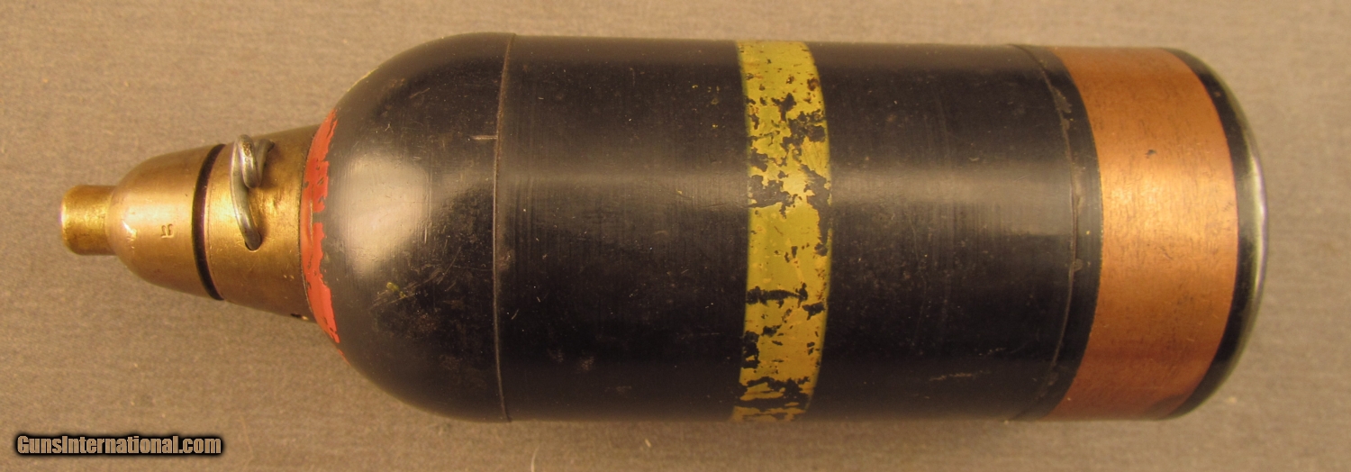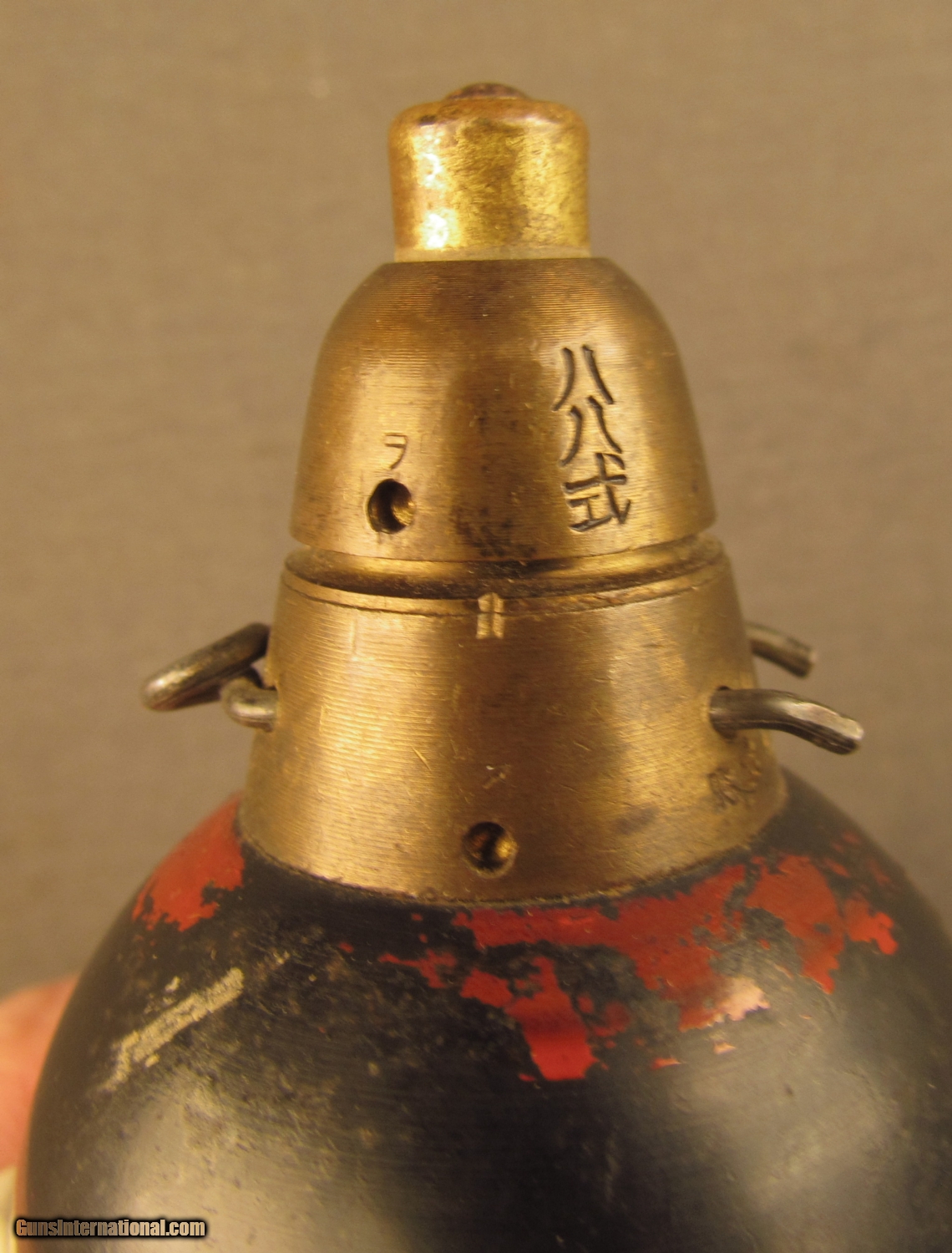 Description: This deactivated Japanese model 89 knee mortar round has the arsenal symbols punched into the side. Pulling the wire pin allows the bomb to be thrown like a grenade or fired in the mortar tube. The base has 8 exhaust ports surrounding the hole for the firing cap. 2" wide by 5 3/4" high. A fine condition Japanese artifact. Not subject to Federal law but please check your local and state laws, all original paint, unpolished brass. An excellent example. SOLD Manufacturer: Japanese Model: 89 Serial Number: 64-470 Caliber Info: Morter Gauge Info: Morter |