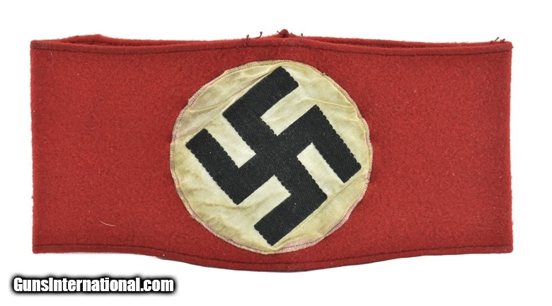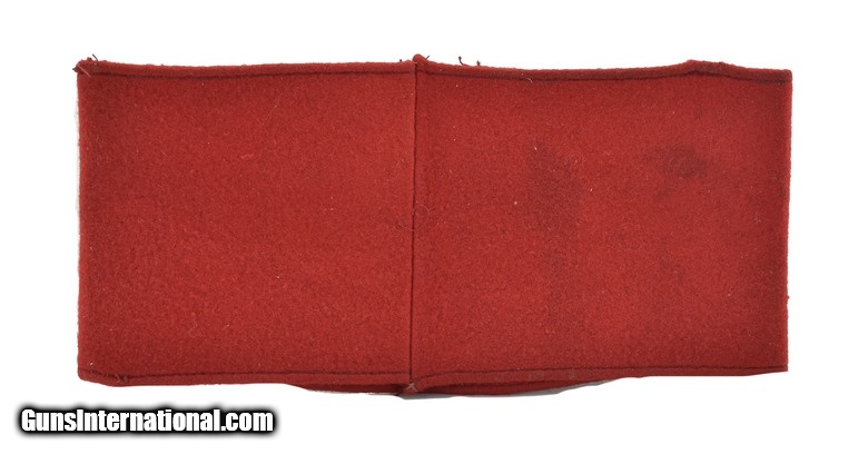 Description: German Supporters Armband. Constructed on thick red wool with a white cotton circle sewn on and a separate swastika piece sewn in the middle of the circle, three-piece constructed armband. SOLD |