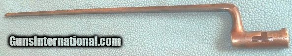 Description: U.S. 1816 SOCKET BAYONET. 3" SOCKET WITH A BOTTOM BRIDGE & THREE-STEP T-MORTISE. 16" TRIANGULAR BLADE WITH HOLLOW-GROUND BACK FLUTES. STAMPED "US" OVER A SHIELD ON THE TOP FACE. METAL SURFACES HAVE SCATTERED SPECKLED AREAS OF OCHER OXIDATION WITH VERY ROUGH AREAS IN REVERSE SIDE OF BACK FLUTE. AN EARLY U.S. BAYONET IN FAIR CONDITION OVERALL, AS PICTURED. $25.00 S&H DIRECT TO BUYER. SOLD |